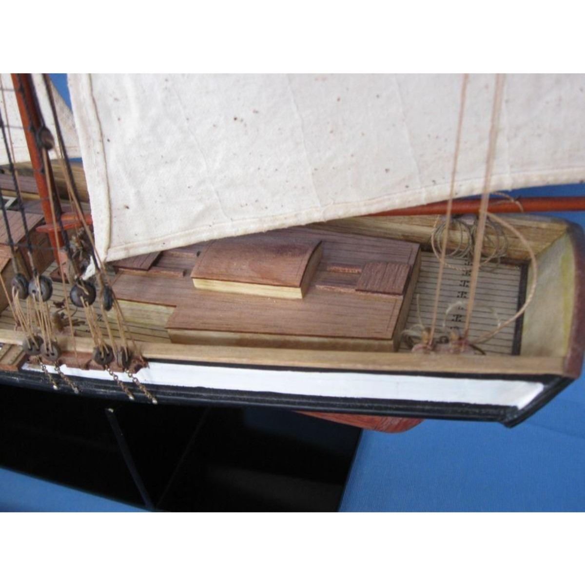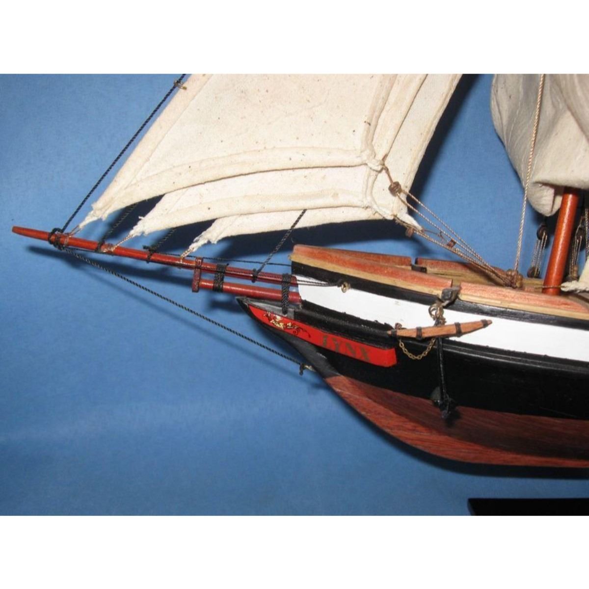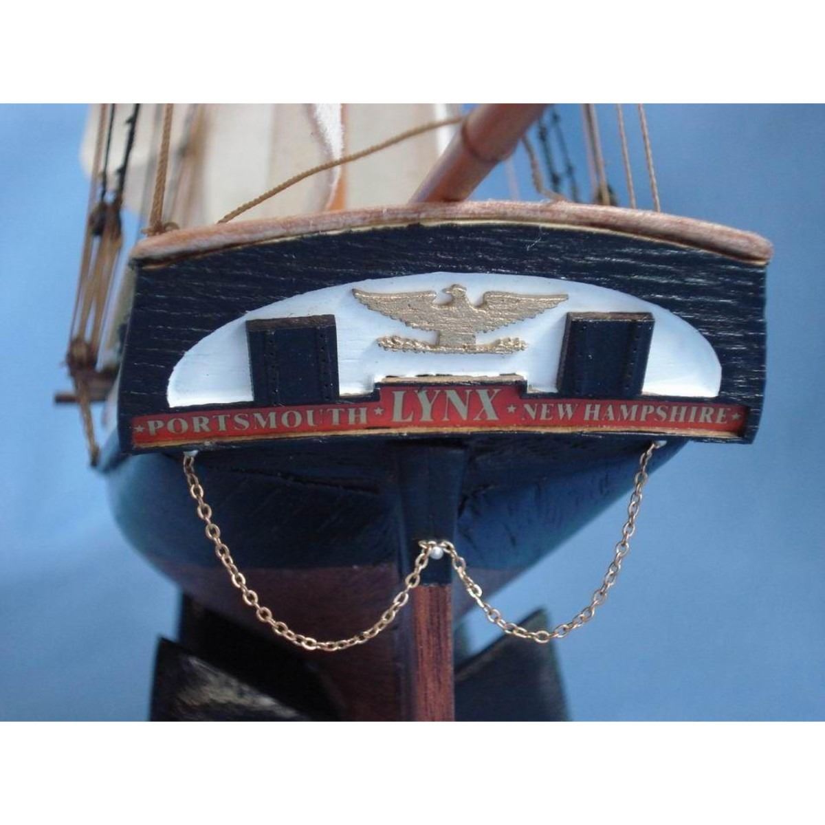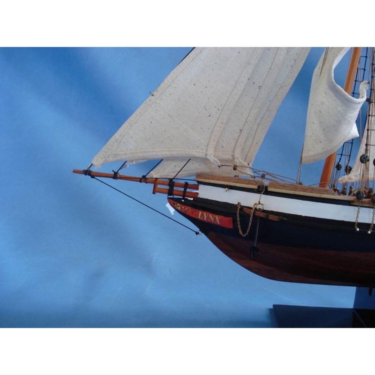 A highly accurate and detailed scale model yacht designed for the discriminating sailboat enthusiast, this tall model ship Lynx topsail schooner is a museum quality replica. Outfitted as a privateer during the War of 1812, this fine tall ships model of the twin-masted clipper ship is perfectly sized for any small shelf, desk or mantle. 24" Long x 5" Wide x 16" High (1:45 scale) Built from scratch by master artisans Individual wooden planks used in plank-on-frame hull construction High quality woods include cherry, birch, maple and rosewood Amazing Details, including: Planked deck with nail holes Rope coils, deck cleats and other nautical items adorn decks Lattice grates, rudder chains, wooden ladders and planked steps Solid brass cannons and metal anchors Masterfully stitched, heavy canvas sails hold shape and do not wrinkle Taut rigging with varied thread gauge and color Extensive rigging and historically accurate sails Gun ports actually cut into the hull Meticulous painting accurately matches period schooners Removable base features Lynx nameplate Extensive research of our tall ship models from original plans, historical drawings and paintings as well as actual photographs ensures the highest possible accuracy