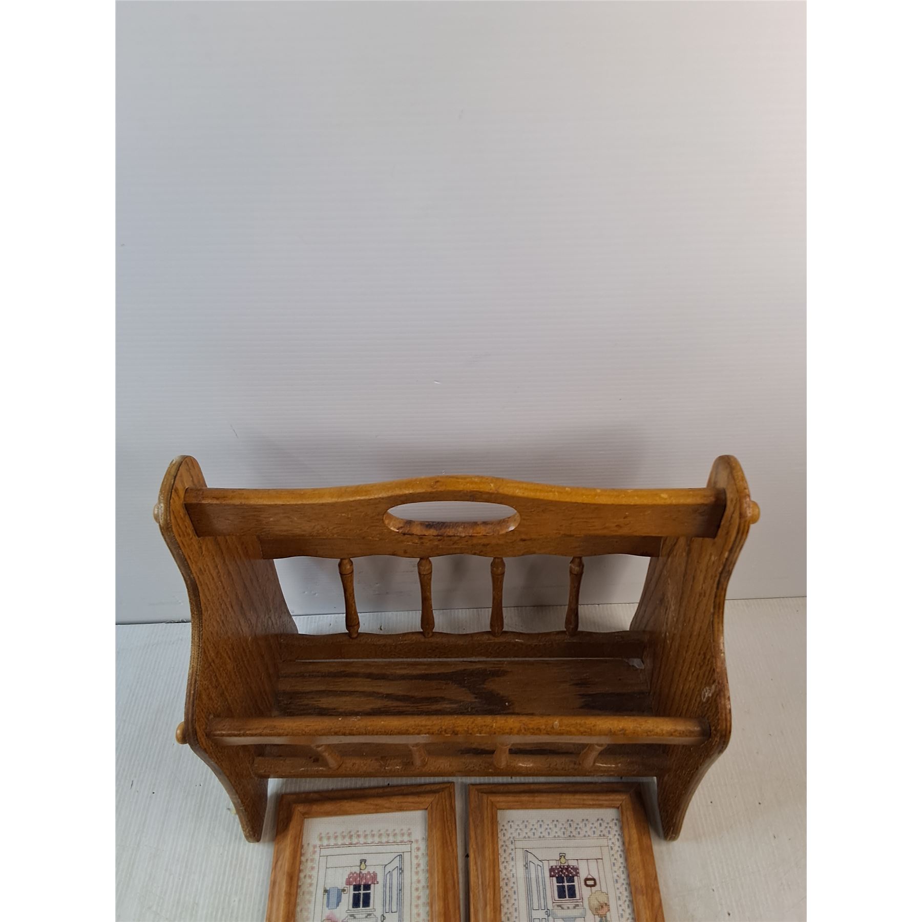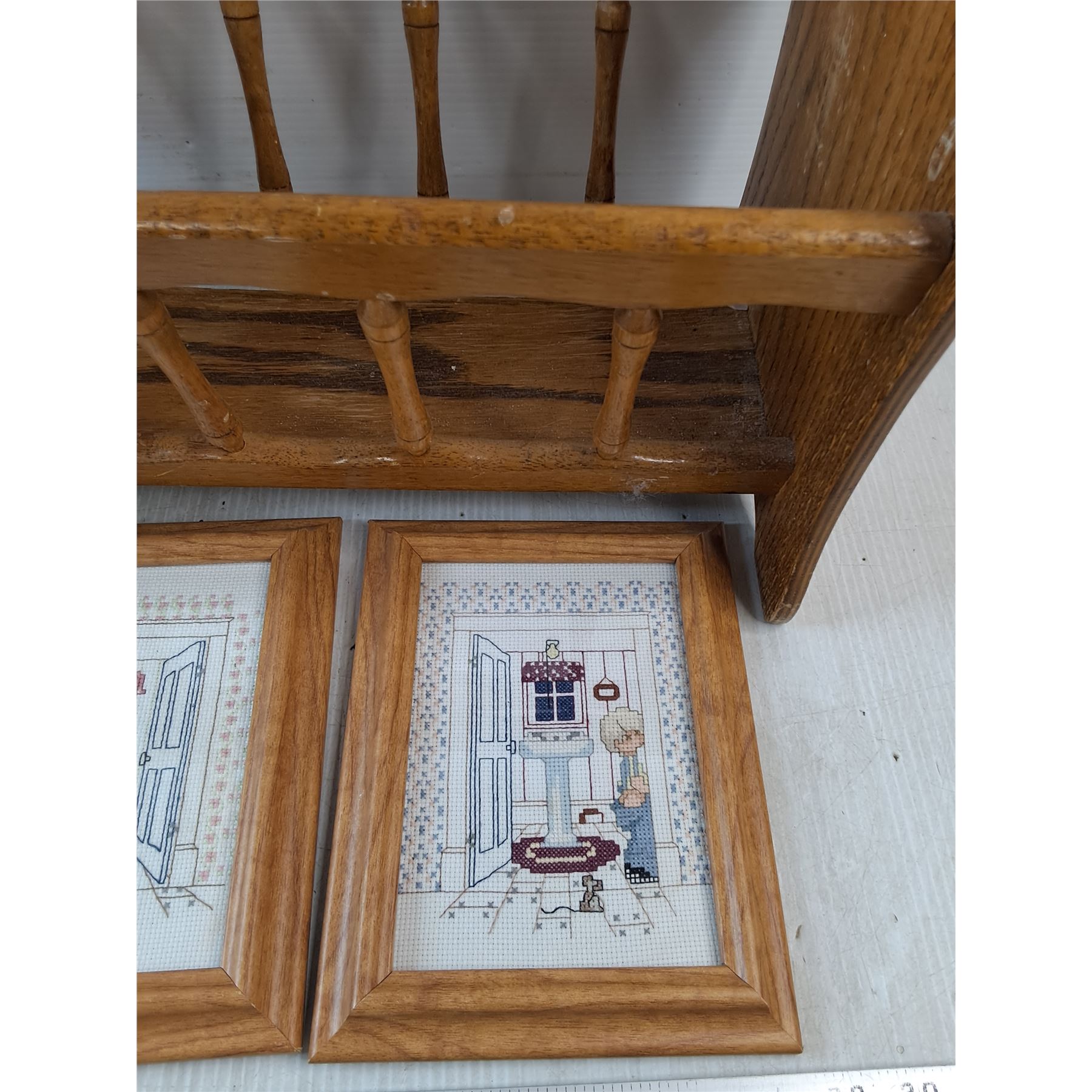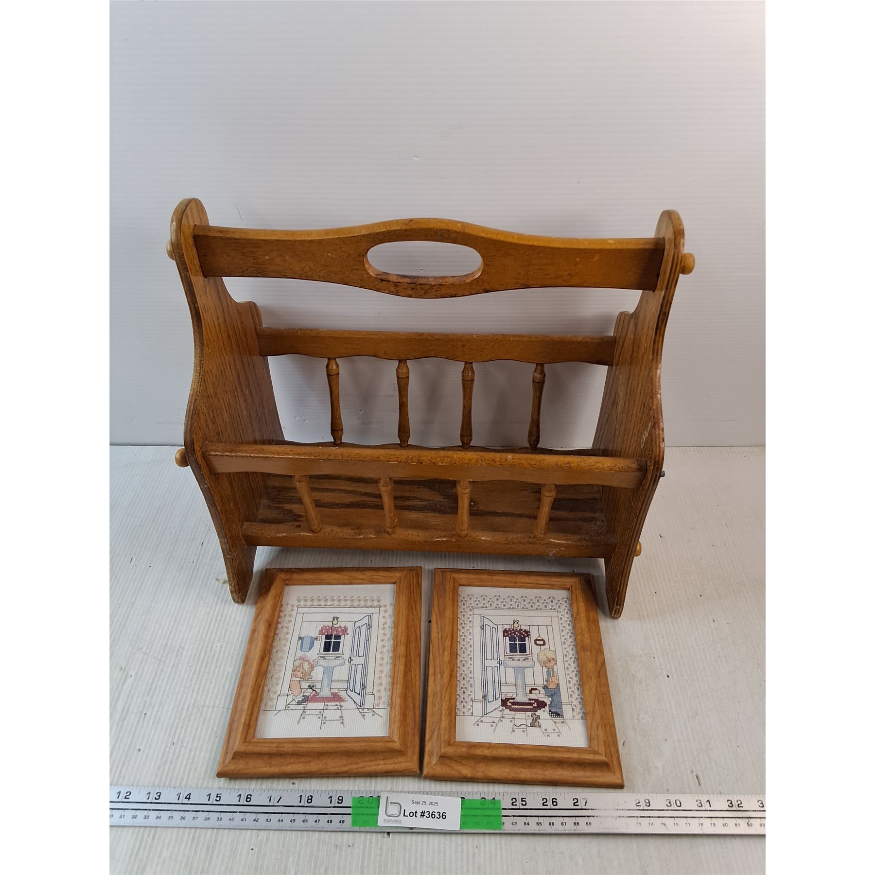 Wooden Magazine Rack, (2) Framed Embroidery Wall Art 9  x 7