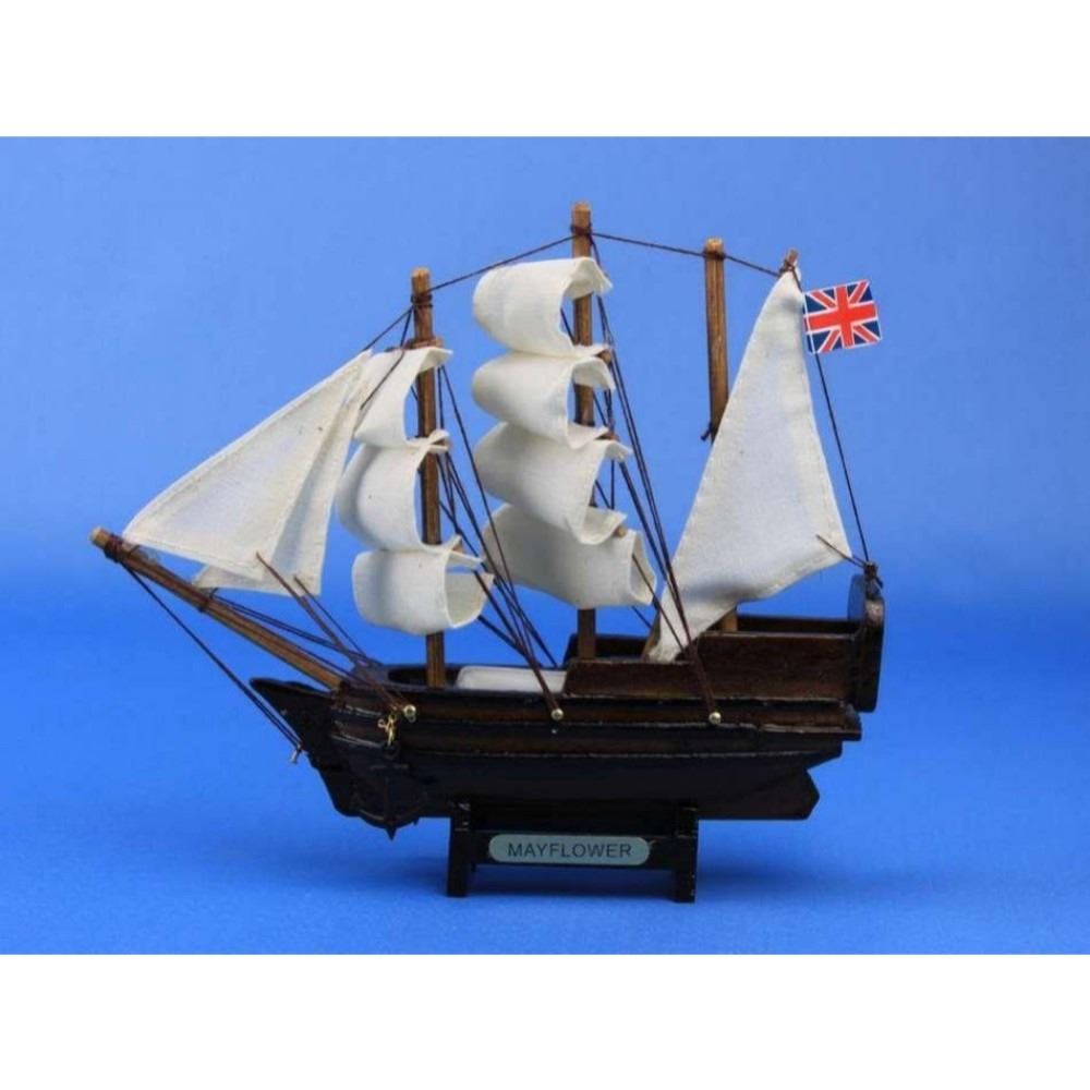 Wooden Mayflower Tall Model Ship 7" SOLD FULLY ASSEMBLED Ready for Immediate Display - Not a Model Ship kit The famed Mayflower, which carried the Pilgrims to Jamestown in 1620, is recreated here in an enchanting 7" tall ship model. Perfect as a gift for any child or nautical enthusiast, this 100% solid wood is reproduced in intricate detail complete with realistic sails, rigging, and a solid metal nameplate proudly displaying her title. Place this ship upon your desk, or in any room or office, and enjoy the history and handsome aesthetics of this legendary ship. NOTE: This item is small, only 7". Please measure this size yourself to ensure it is appropriate for your intended purchase. Arrives fully assembled with all sails mounted Handcrafted wooden hull and masts Proudly displays British flag 13 handsewn white cloth sails Metal nameplate on wooden base identifies the ship as the Mayflower Â