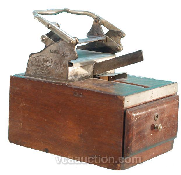 Wooden & Metal Countertop A.C. Gibson Co. Hand Stamp Merchant Machine Buffalo, N.Y. Has some kind of stamp pad w/ stamp press, blade & drawer. No idea when this was used and what for, did research and came up with nothing.