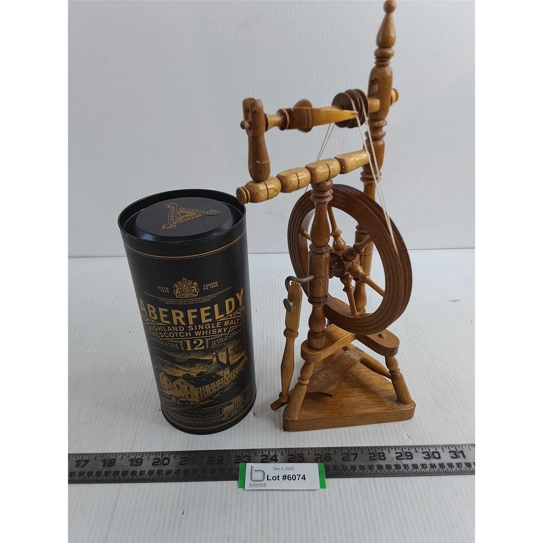 Wooden Miniature Spinning Wheel - 14  Tall, Aberfeld Scotch Whiskey Tin