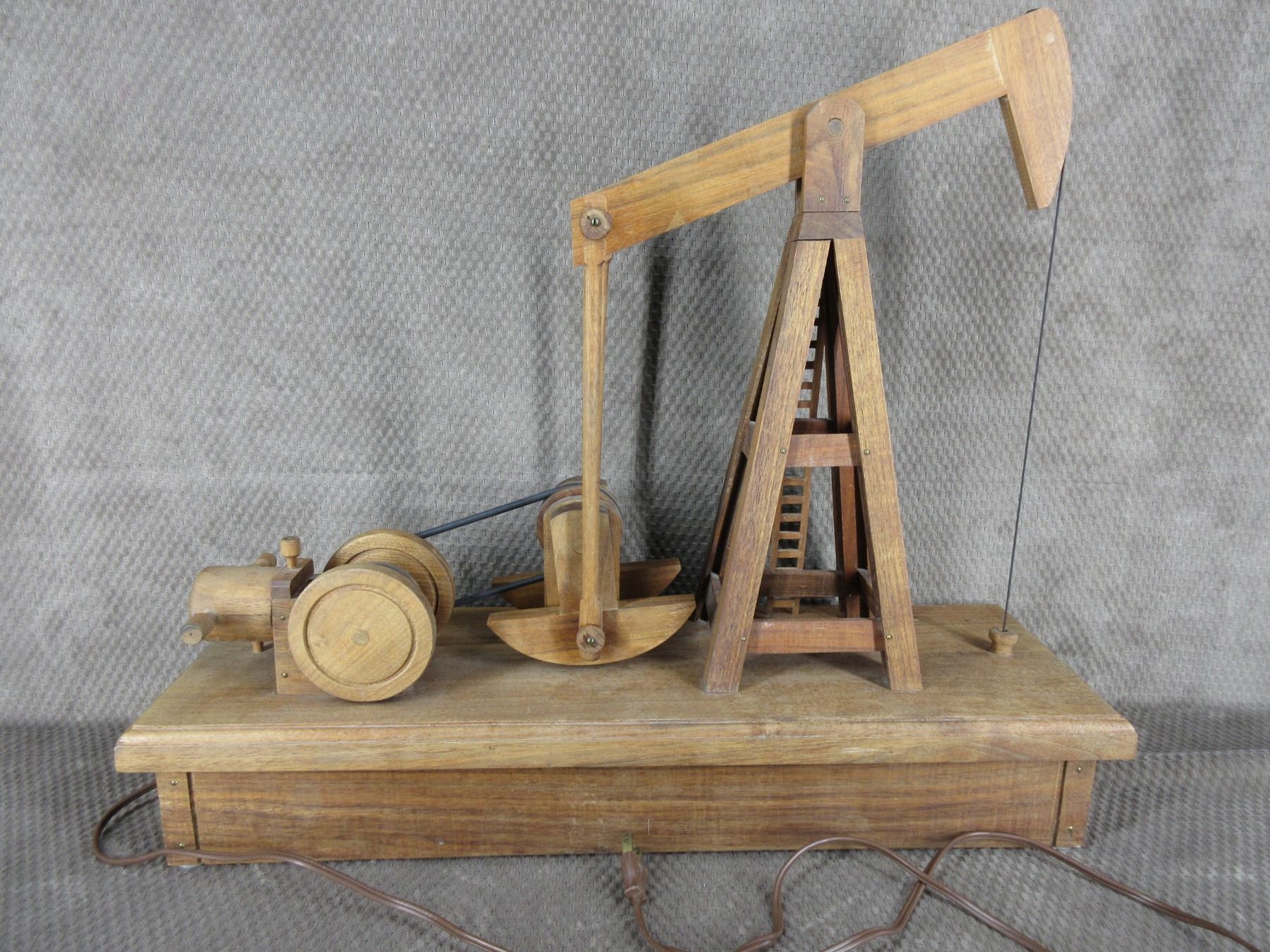 Wooden Model of a Pump Jack with electric motor that runs assembly and was running at time of catalog. Approximately 8 inches wide 24 inches long and 20 inches high