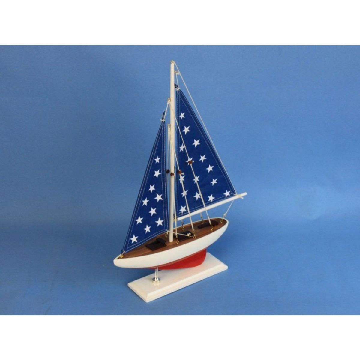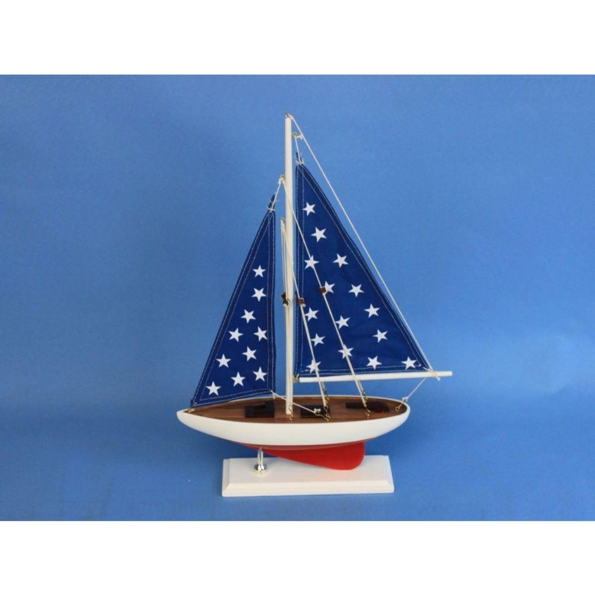 Wooden Patriotic Sailer Model Sailboat Decoration 17" NOT A MODEL SHIP KIT Attach Sails and this Sailboat Centerpiece is Ready for Immediate Display Brighten your day, or any room of your home, with this delightfully fun Pacific Sailboat model. Perfect nautical decor gifts for friends, children, or party guests, they also make excellent nautical decorations or sailboat centerpieces for a reception or group event. Liven your office, beach house, or sunroom with one of these colorful sailboat models today! Handcrafted solid wood hull, masts and stand with metal supports Timeless nautical colors - Navy blue and white Largest sailboat selection available - We offer over 150 unique model sailboats Featured in Sept 2011 Brides magazine - Excellent wedding table centerpiece Perfect nautical gift for friends, children or party guests Ideal for banquets, receptions, meetings, or any other nautical party or even