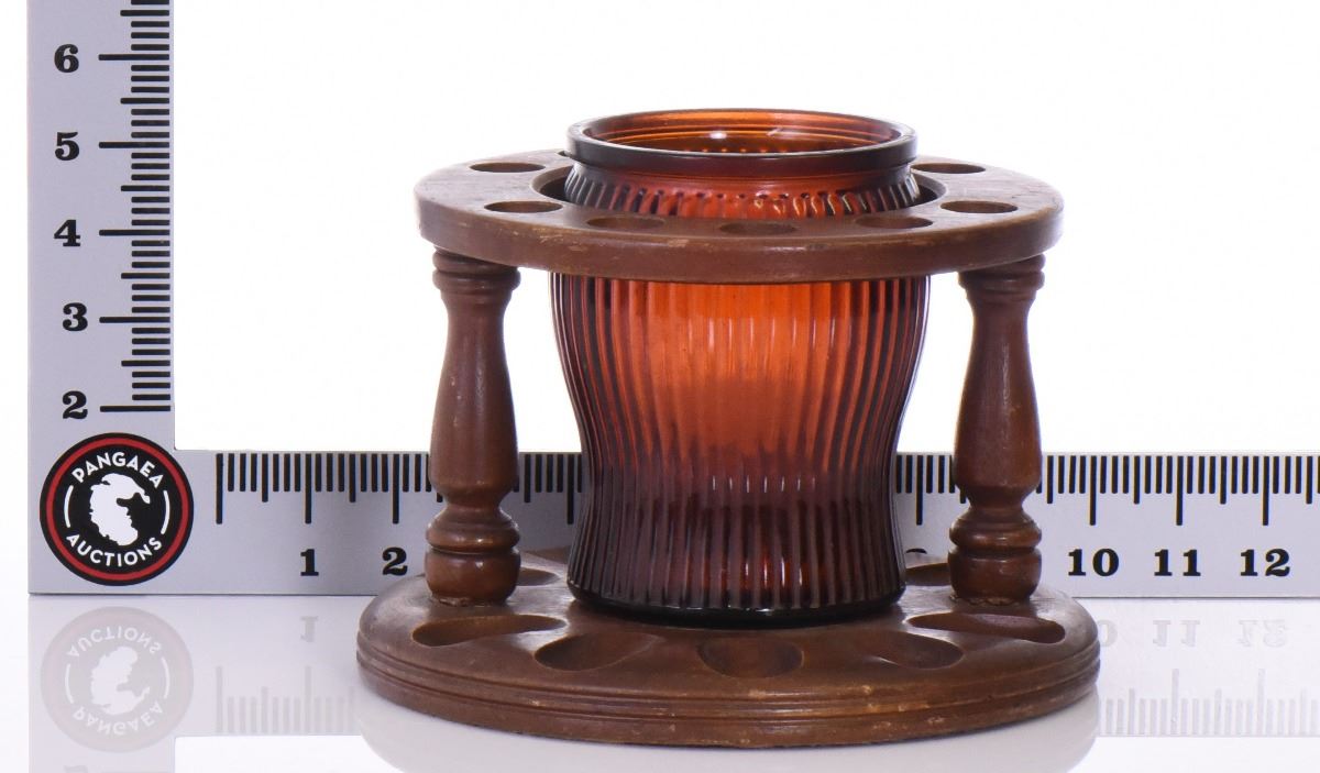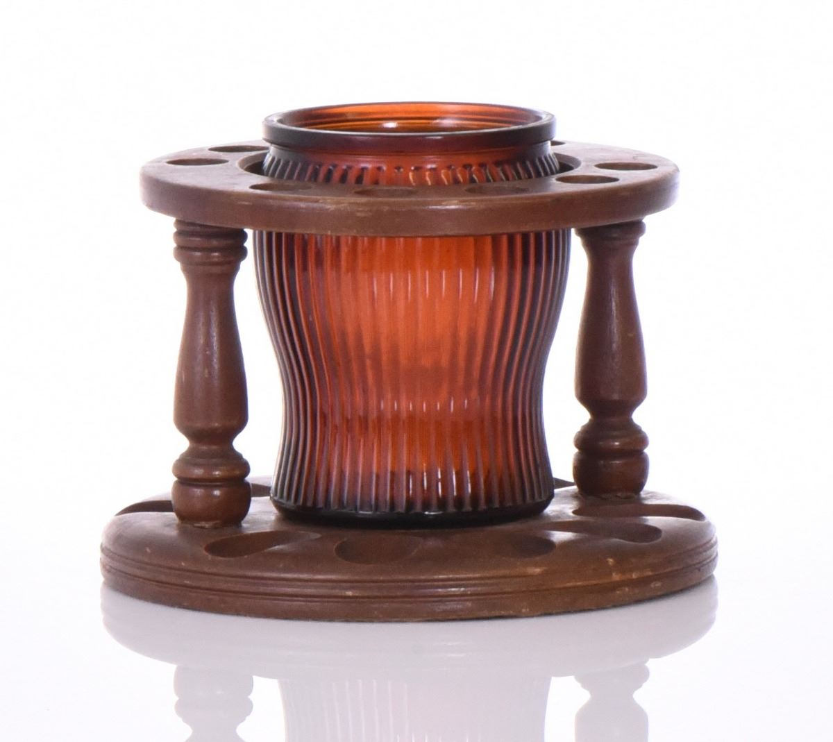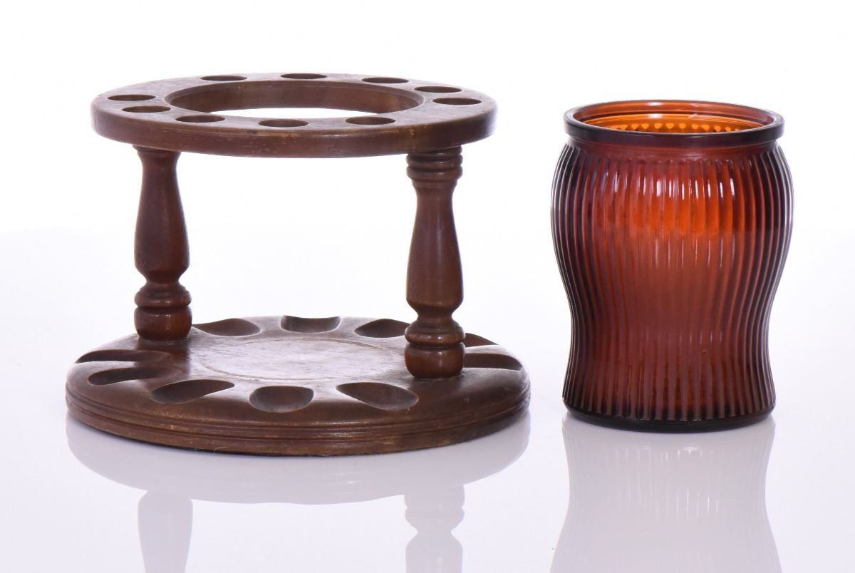 Wooden Pipe Holder And Glass Humidor Center Piece, Made By C.W. Products Corp. New York City. Estimated more than 50 yrs old. (Pangaea Auctions) Size: See Ruler Photo. (Photos Represent The Condition Of The Lot.)