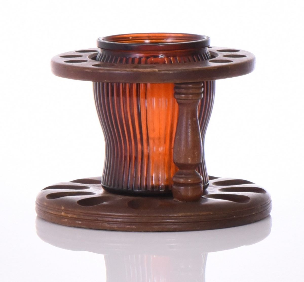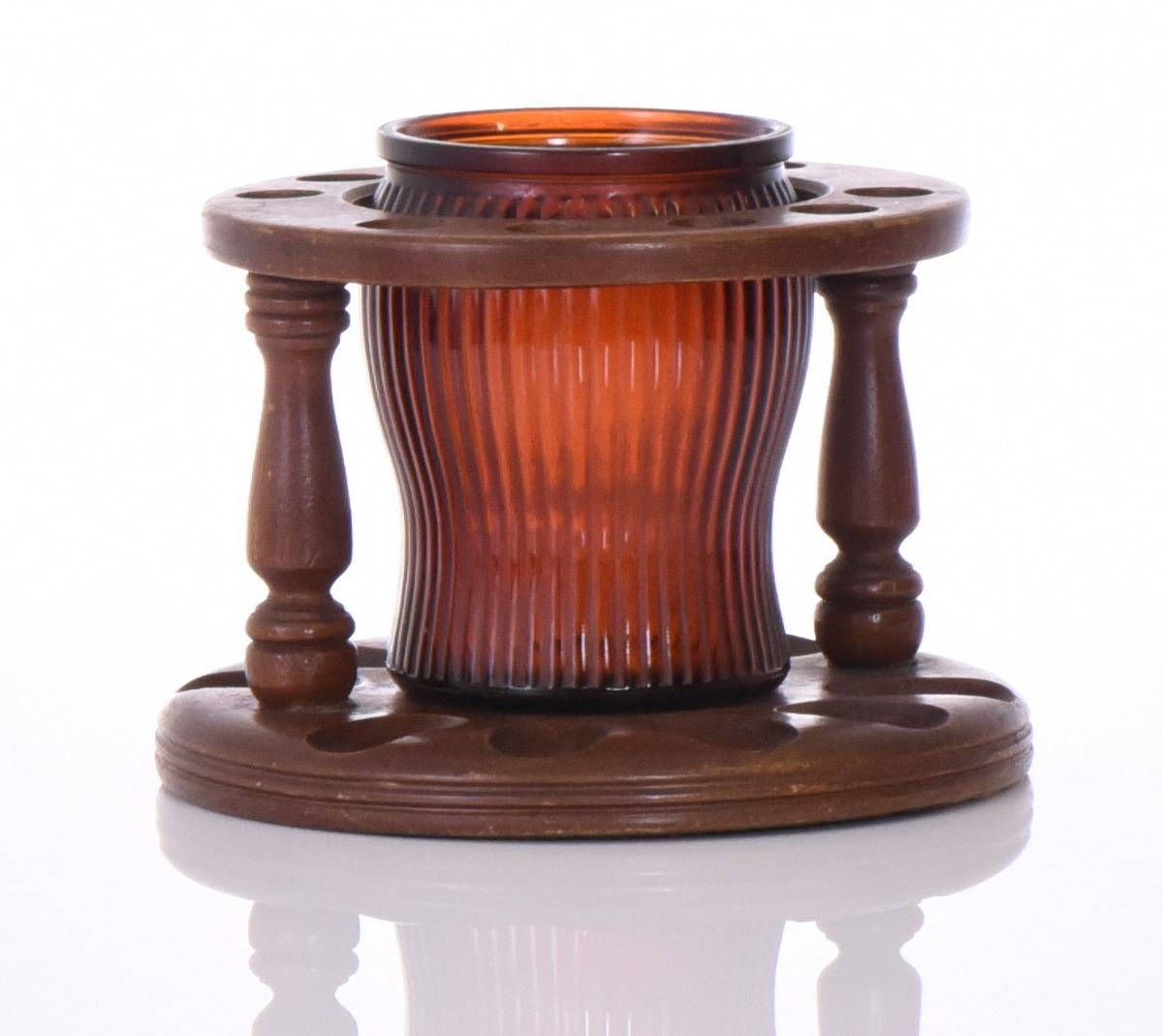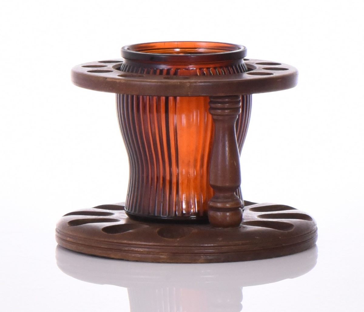 Wooden Pipe Holder And Glass Humidor Center Piece, Made By C.W. Products Corp. New York City. Estimated more than 50 yrs old. (Pangaea Auctions) Size: See Ruler Photo. (Photos Represent The Condition Of The Lot.)