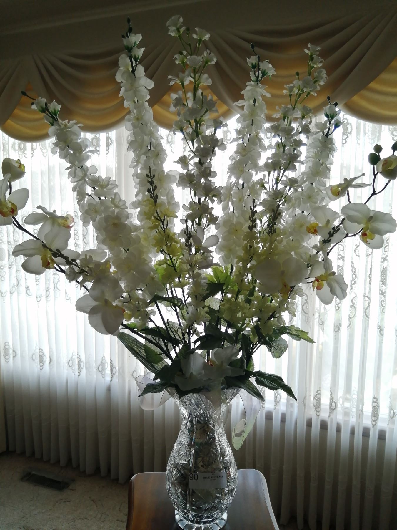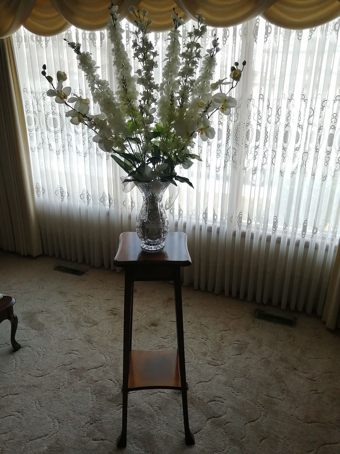 Wooden Plant Stand with Artificial Flowers in Crystal Vase