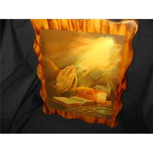 Inspiring religious highly polyurethane varnished plaque of praying hands with bible opened, bread and cvup. The Light that shines on the hands...gives a feeling of awe. The picture is bounded by a rich looking wood that is also highly varnished. The picture is done by F.C.Foster and the artist has a unique way of using light to inspire and to highlight the theme of CHristian dedication...with the word and bread and wine.