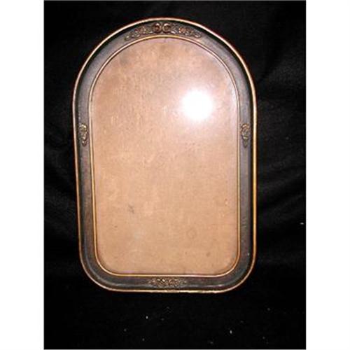 Wooden arched frame with the glass used to display portraits of the C. 1865 era has ornate carved floral swag appliques top and bottom with smaller on either side. The frame is dark,almost black with the inner flat surface etched in gilt and brown,producing a marbelized effect. Original glass and nails. A newer wire has been added some time ago on the back to replace the original string. Several bits of the string are still attached to the eyer hooks. In remarkable condition. Measures 18H X 12W.