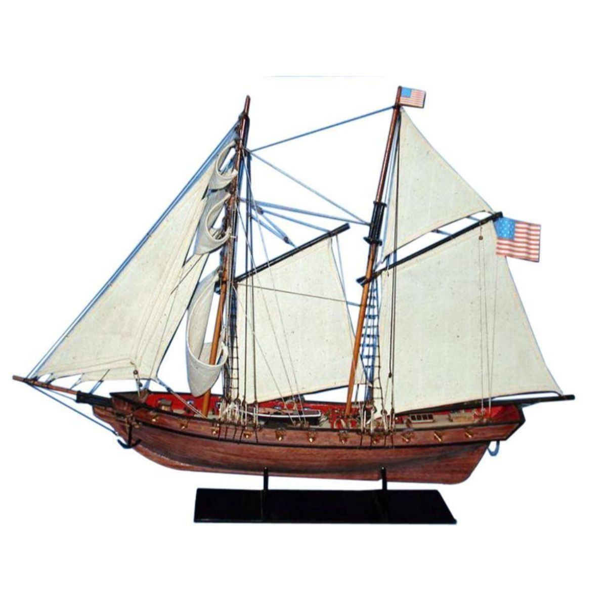 Wooden Prince de Neufchatel Model Ship 24" SOLD FULLY ASSEMBLED Ready for Immediate Display - Not a Model Ship kit A highly accurate and detailed scale model yacht designed for the discriminating sailboat enthusiast, this tall model ship is a museum quality replica of the Prince de Neufchatel topsail schooner.  A fine tall ships model of the famous American privateer that mercilessly raided British shipping in the English channel during the War of 1812, the Prince de Neufchatel is perfectly sized for any small shelf, desk or mantle. 24" Long x 5" Wide x 16" High (1:45 scale) Built from scratch by master artisans Individual wooden planks used in plank-on-frame hull construction High quality woods include cherry, birch, maple and rosewood Extensive rigging and historically accurate sails Gun ports actually cut into the hull Amazing Details, including: Planked deck with nail holes Rope coils, deck cleats and other nautical items adorn decks Lattice grates, rudder chains, wooden ladders and planked steps Solid brass cannons and metal anchors Masterfully stitched, heavy canvas sails hold shape and do not wrinkle Taut rigging with varied thread gauge and color Meticulous painting accurately matches the actual Prince de Neufchatel Removable base features Prince de Neufchatel nameplate Extensive research of our tall ship models from original plans, historical drawings and paintings as well as actual photographs ensures the highest possible accuracy