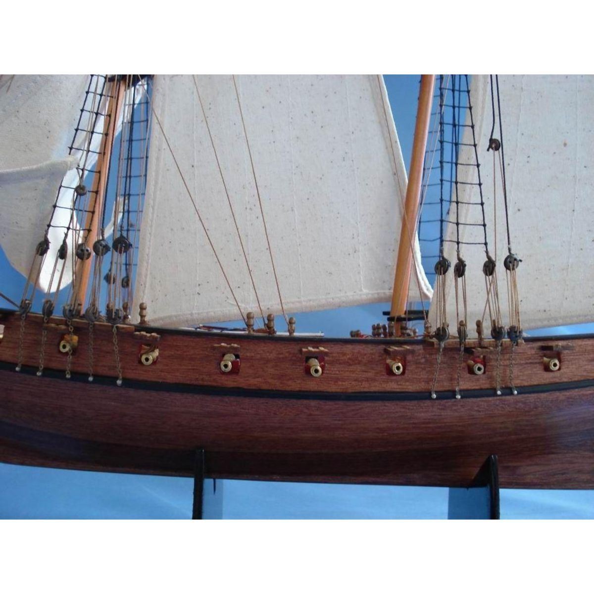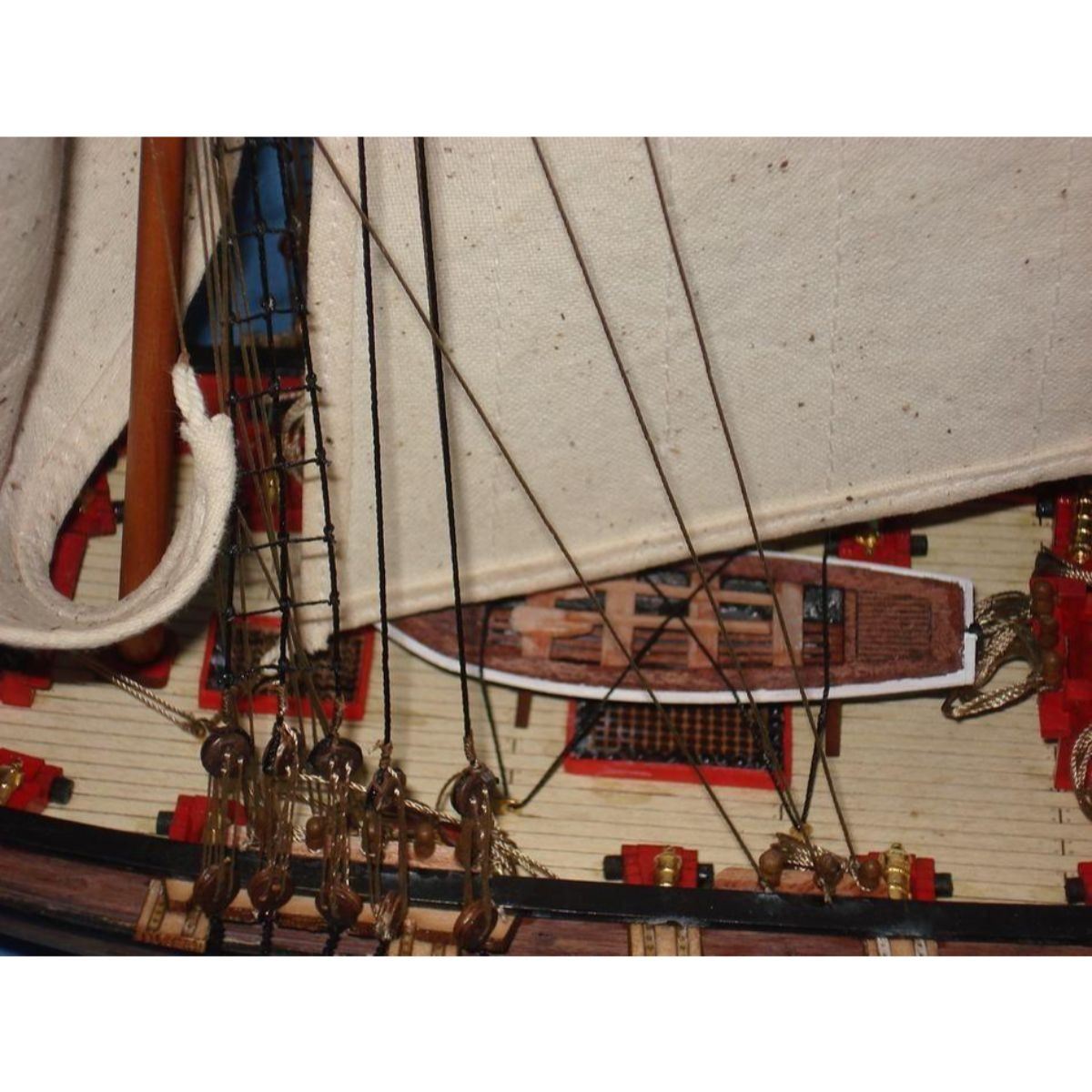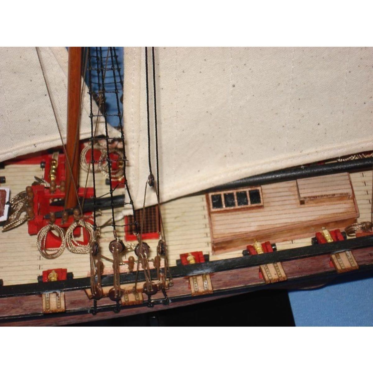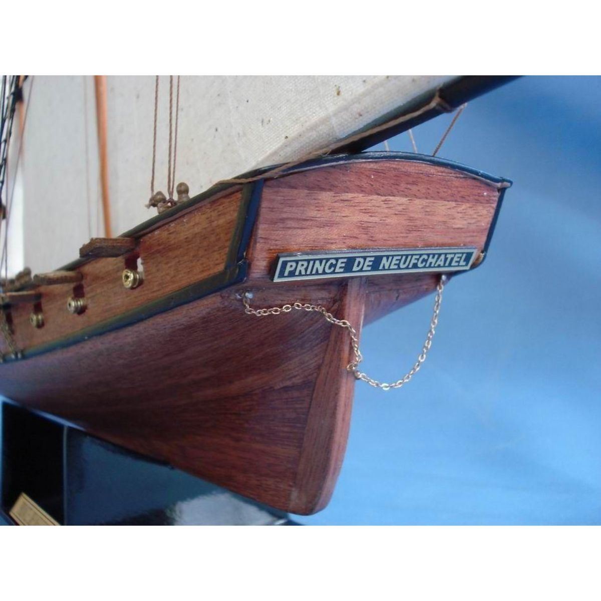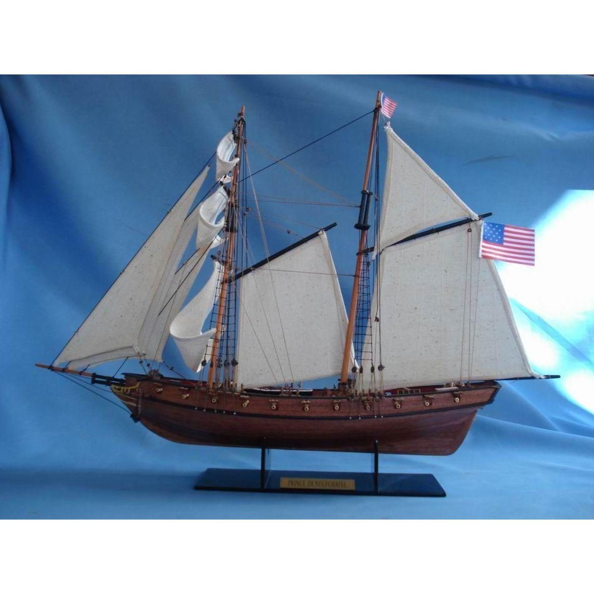 Wooden Prince de Neufchatel Model Ship 24" SOLD FULLY ASSEMBLED Ready for Immediate Display - Not a Model Ship kit A highly accurate and detailed scale model yacht designed for the discriminating sailboat enthusiast, this tall model ship is a museum quality replica of the Prince de Neufchatel topsail schooner.  A fine tall ships model of the famous American privateer that mercilessly raided British shipping in the English channel during the War of 1812, the Prince de Neufchatel is perfectly sized for any small shelf, desk or mantle. 24" Long x 5" Wide x 16" High (1:45 scale) Built from scratch by master artisans Individual wooden planks used in plank-on-frame hull construction High quality woods include cherry, birch, maple and rosewood Extensive rigging and historically accurate sails Gun ports actually cut into the hull Amazing Details, including: Planked deck with nail holes Rope coils, deck cleats and other nautical items adorn decks Lattice grates, rudder chains, wooden ladders and planked steps Solid brass cannons and metal anchors Masterfully stitched, heavy canvas sails hold shape and do not wrinkle Taut rigging with varied thread gauge and color Meticulous painting accurately matches the actual Prince de Neufchatel Removable base features Prince de Neufchatel nameplate Extensive research of our tall ship models from original plans, historical drawings and paintings as well as actual photographs ensures the highest possible accuracy