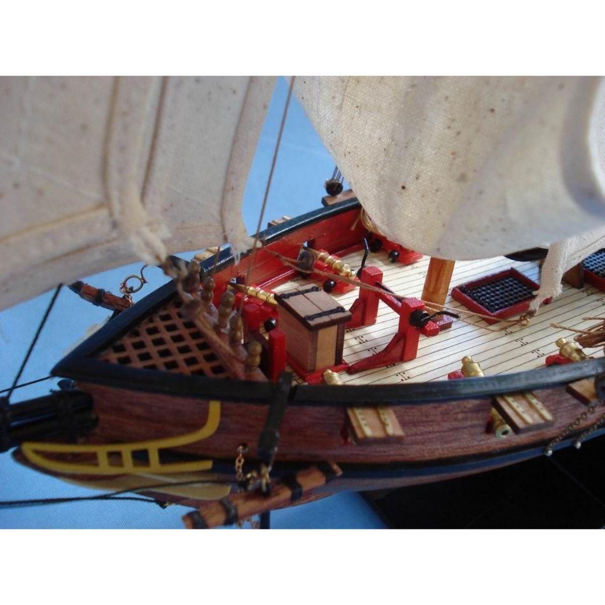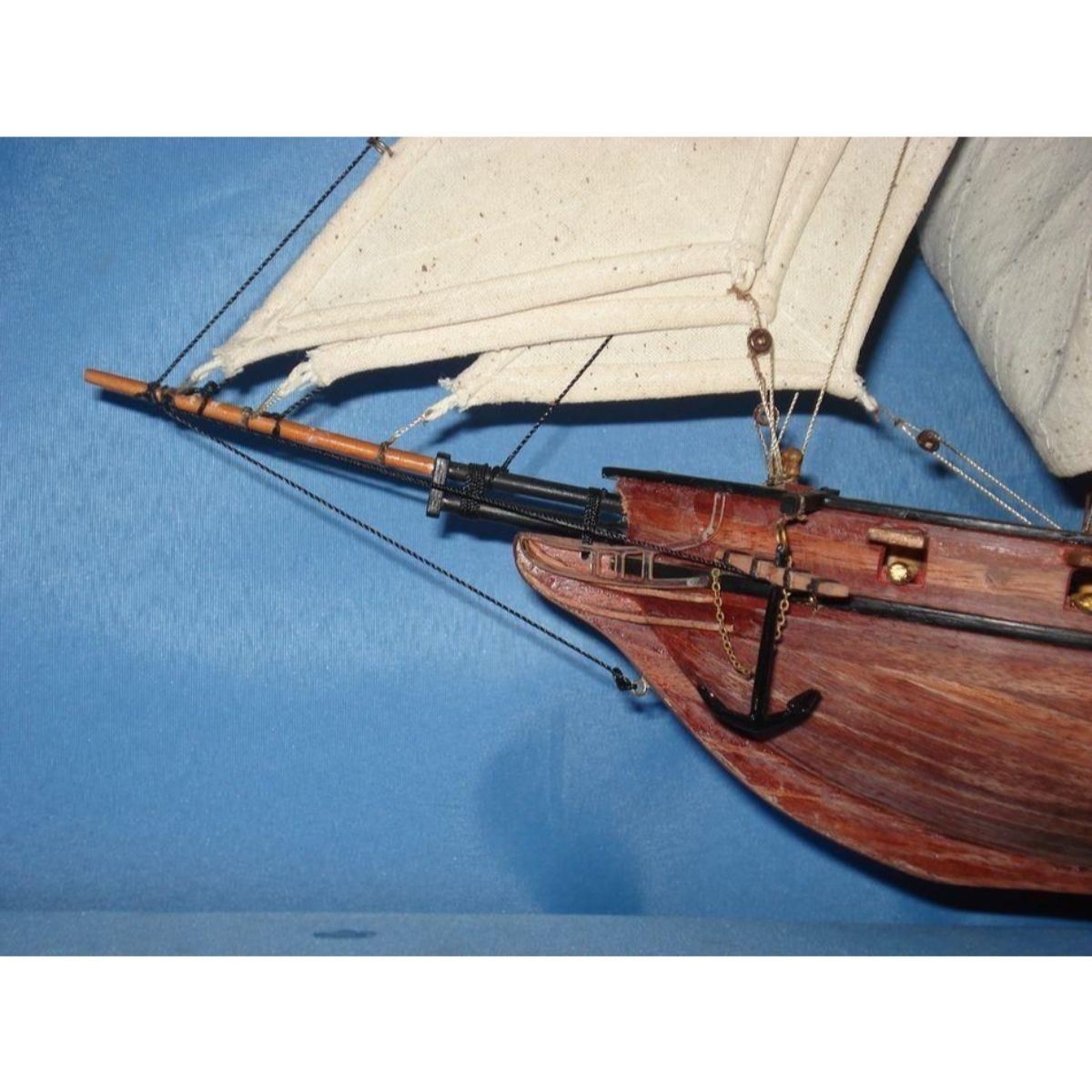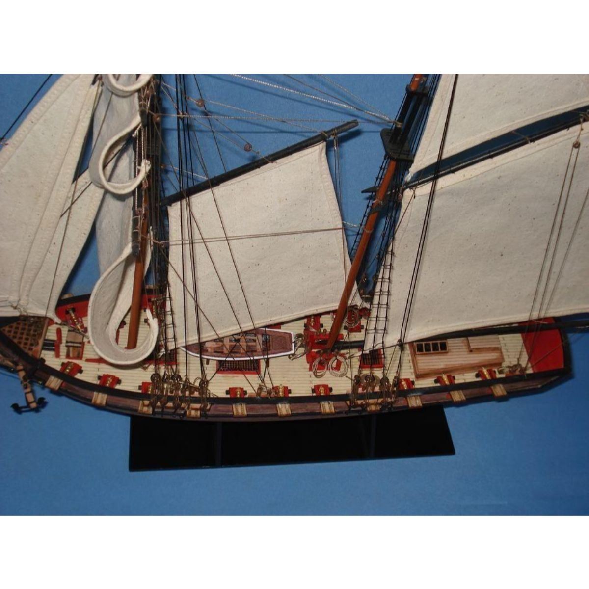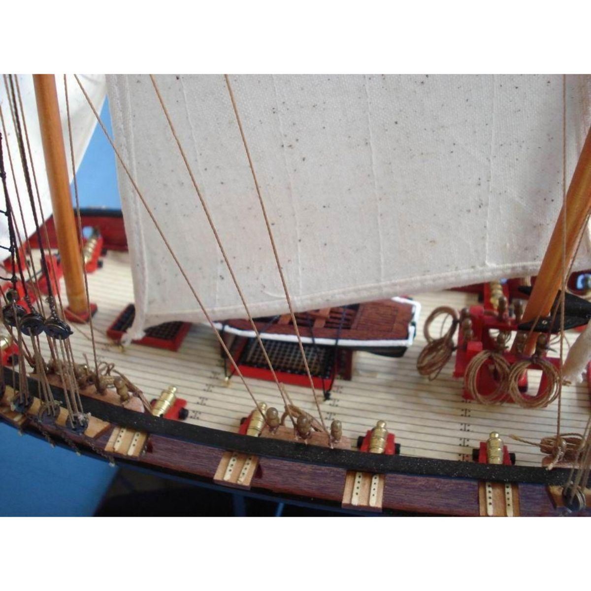 Wooden Prince de Neufchatel Model Ship 24" SOLD FULLY ASSEMBLED Ready for Immediate Display - Not a Model Ship kit A highly accurate and detailed scale model yacht designed for the discriminating sailboat enthusiast, this tall model ship is a museum quality replica of the Prince de Neufchatel topsail schooner.  A fine tall ships model of the famous American privateer that mercilessly raided British shipping in the English channel during the War of 1812, the Prince de Neufchatel is perfectly sized for any small shelf, desk or mantle. 24" Long x 5" Wide x 16" High (1:45 scale) Built from scratch by master artisans Individual wooden planks used in plank-on-frame hull construction High quality woods include cherry, birch, maple and rosewood Extensive rigging and historically accurate sails Gun ports actually cut into the hull Amazing Details, including: Planked deck with nail holes Rope coils, deck cleats and other nautical items adorn decks Lattice grates, rudder chains, wooden ladders and planked steps Solid brass cannons and metal anchors Masterfully stitched, heavy canvas sails hold shape and do not wrinkle Taut rigging with varied thread gauge and color Meticulous painting accurately matches the actual Prince de Neufchatel Removable base features Prince de Neufchatel nameplate Extensive research of our tall ship models from original plans, historical drawings and paintings as well as actual photographs ensures the highest possible accuracy