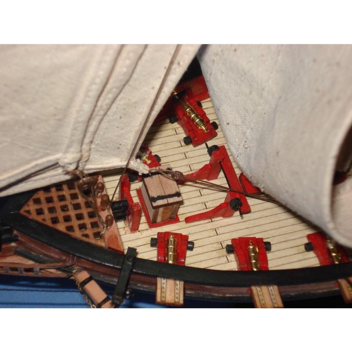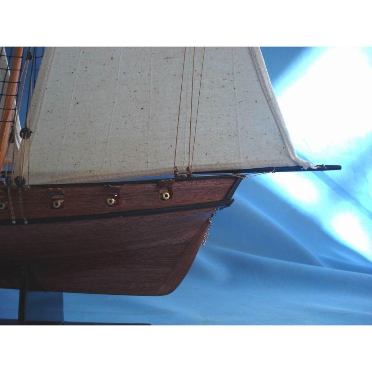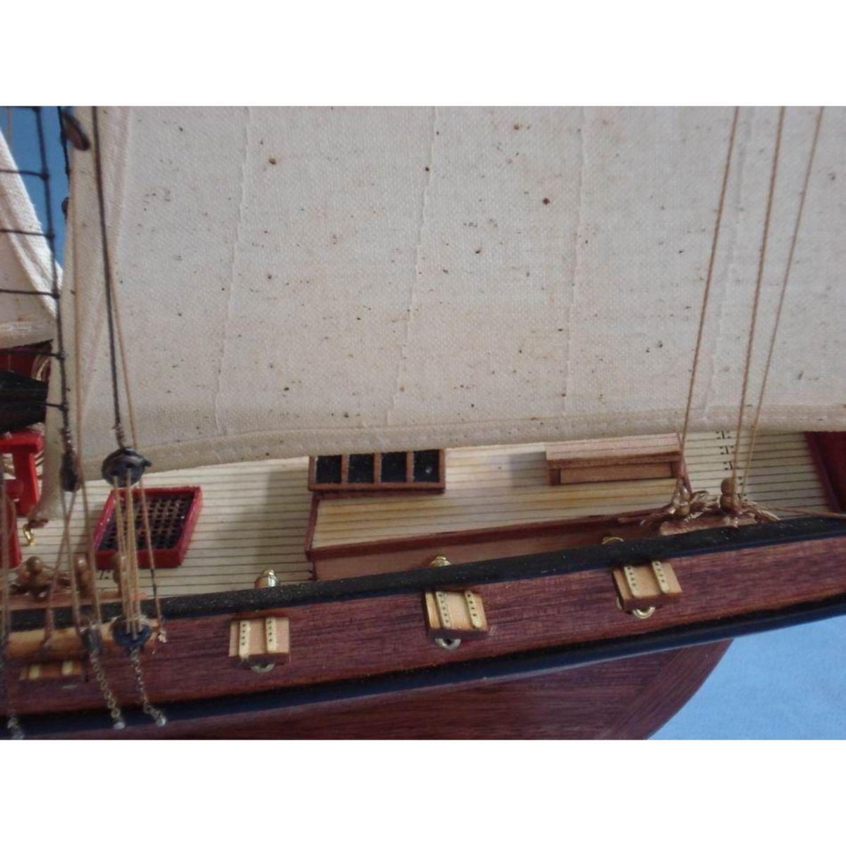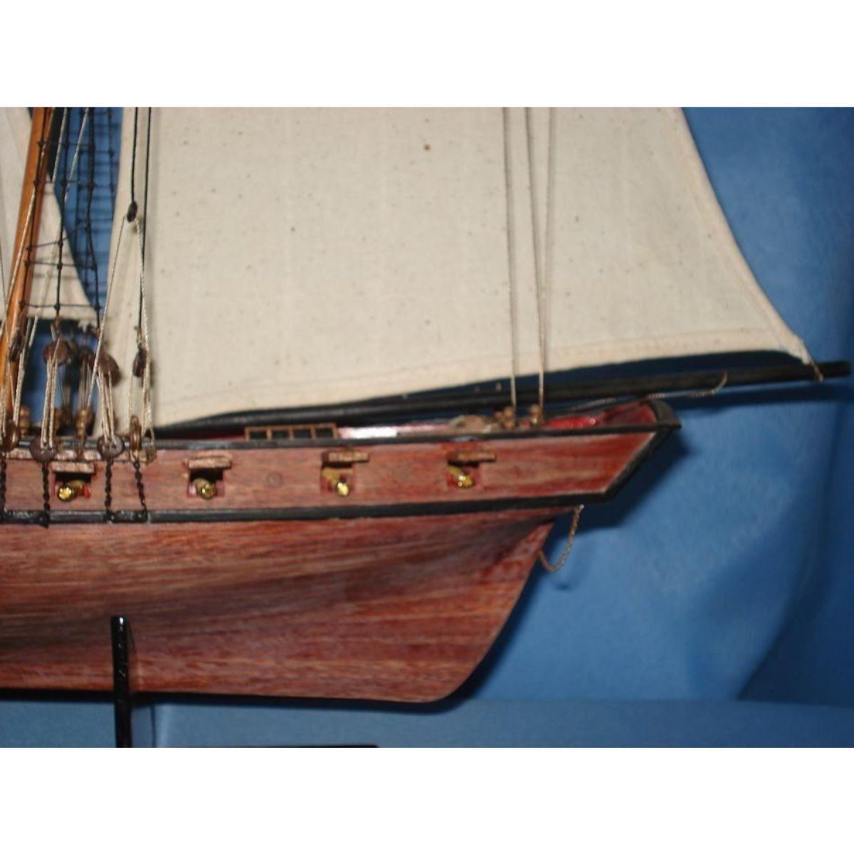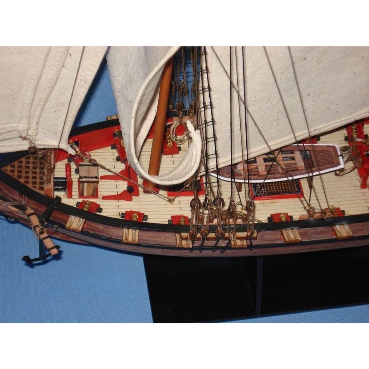 Wooden Prince de Neufchatel Model Ship 24" SOLD FULLY ASSEMBLED Ready for Immediate Display - Not a Model Ship kit A highly accurate and detailed scale model yacht designed for the discriminating sailboat enthusiast, this tall model ship is a museum quality replica of the Prince de Neufchatel topsail schooner.  A fine tall ships model of the famous American privateer that mercilessly raided British shipping in the English channel during the War of 1812, the Prince de Neufchatel is perfectly sized for any small shelf, desk or mantle. 24" Long x 5" Wide x 16" High (1:45 scale) Built from scratch by master artisans Individual wooden planks used in plank-on-frame hull construction High quality woods include cherry, birch, maple and rosewood Extensive rigging and historically accurate sails Gun ports actually cut into the hull Amazing Details, including: Planked deck with nail holes Rope coils, deck cleats and other nautical items adorn decks Lattice grates, rudder chains, wooden ladders and planked steps Solid brass cannons and metal anchors Masterfully stitched, heavy canvas sails hold shape and do not wrinkle Taut rigging with varied thread gauge and color Meticulous painting accurately matches the actual Prince de Neufchatel Removable base features Prince de Neufchatel nameplate Extensive research of our tall ship models from original plans, historical drawings and paintings as well as actual photographs ensures the highest possible accuracy