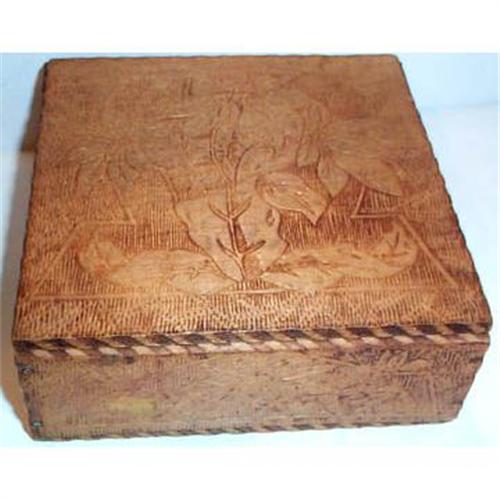 <tr><td>Title:Wooden Pyrography Metal Hinged Box </td></tr>
