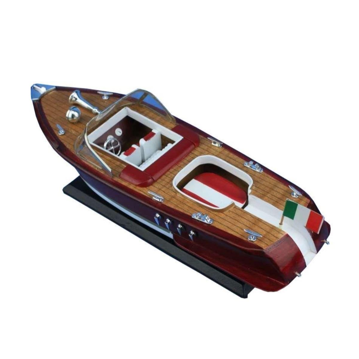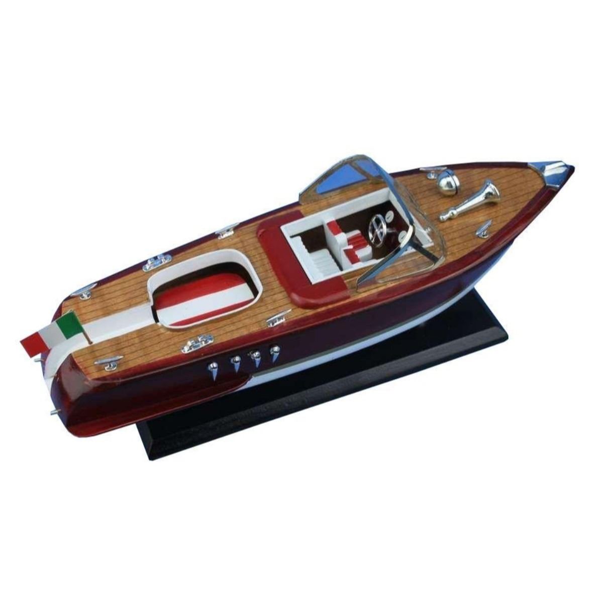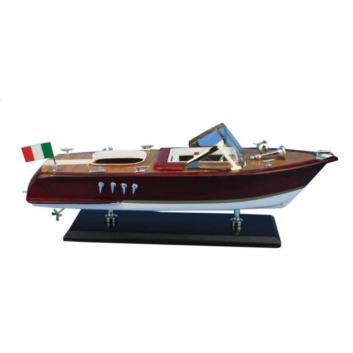 Feel as if you’re speeding across the water with the wind in your hair with this powerboat model of a classic mahogany hulled Riva Aquarama speedboat. Exquisitely crafted with precision detailing, this model speedboat of the iconic wooden-hulled Riva Aquarama powerboat will take you back to the luxurious pleasures of lazy days upon the river or perhaps waterskiing as you race across the lake. 14" Long x 5" Wide x 6" High Rare high-quality woods such as mahogany, birch, maple and yellow siris used for construction Amazing Details, including: Individual decking planks visible Stearing wheel, deck cleats, Italian flag and other details Sturdy wooden base attached with speedboat model Meticulously painted to match a real Riva Aquarama powerboat Â