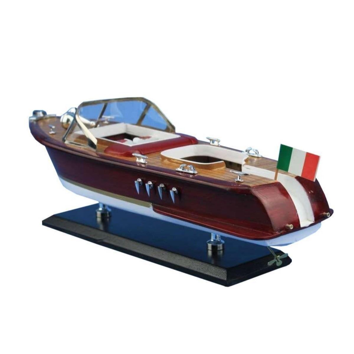 Feel as if you’re speeding across the water with the wind in your hair with this powerboat model of a classic mahogany hulled Riva Aquarama speedboat. Exquisitely crafted with precision detailing, this model speedboat of the iconic wooden-hulled Riva Aquarama powerboat will take you back to the luxurious pleasures of lazy days upon the river or perhaps waterskiing as you race across the lake. 14" Long x 5" Wide x 6" High Rare high-quality woods such as mahogany, birch, maple and yellow siris used for construction Amazing Details, including: Individual decking planks visible Stearing wheel, deck cleats, Italian flag and other details Sturdy wooden base attached with speedboat model Meticulously painted to match a real Riva Aquarama powerboat Â