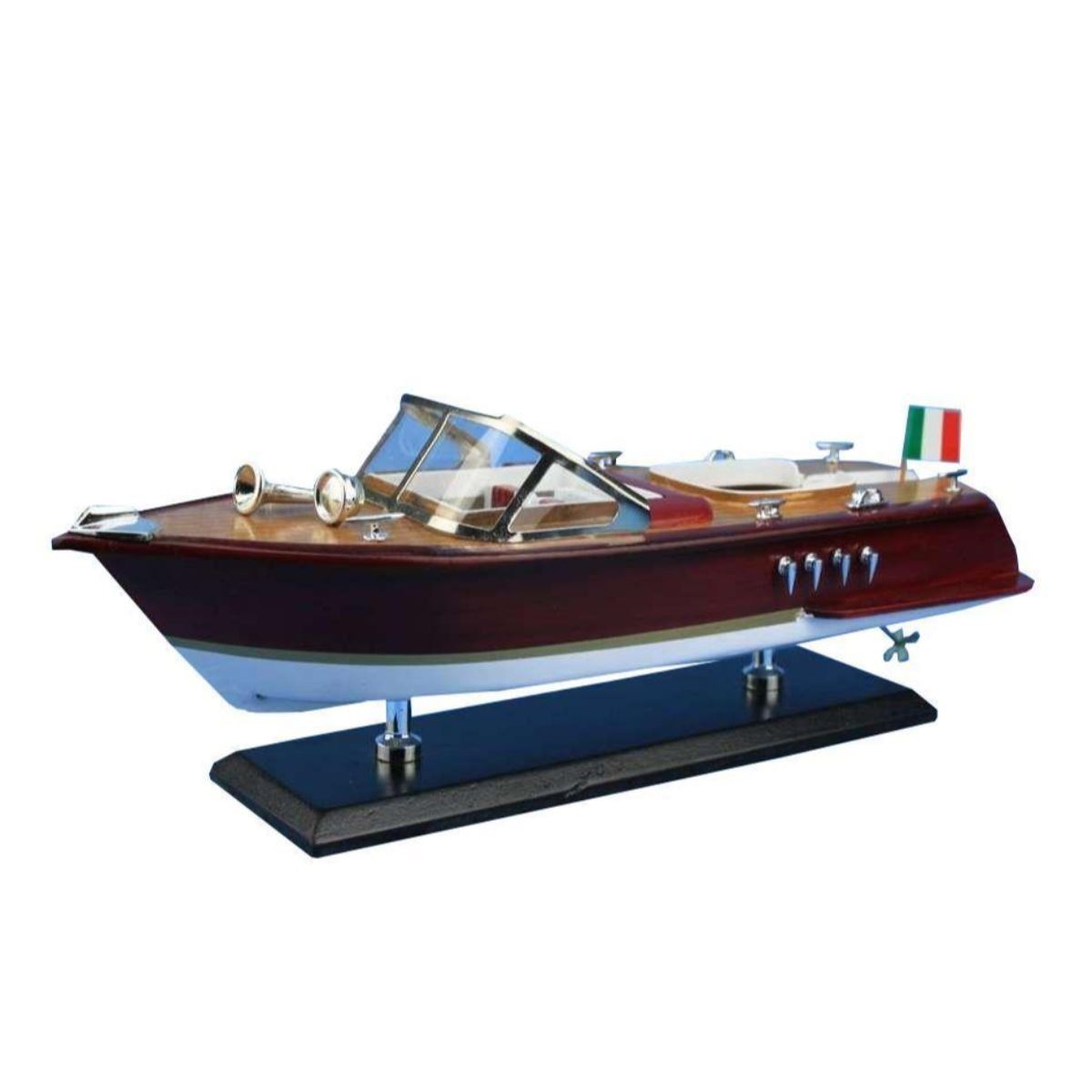 Feel as if you’re speeding across the water with the wind in your hair with this powerboat model of a classic mahogany hulled Riva Aquarama speedboat. Exquisitely crafted with precision detailing, this model speedboat of the iconic wooden-hulled Riva Aquarama powerboat will take you back to the luxurious pleasures of lazy days upon the river or perhaps waterskiing as you race across the lake. 14" Long x 5" Wide x 6" High Rare high-quality woods such as mahogany, birch, maple and yellow siris used for construction Amazing Details, including: Individual decking planks visible Stearing wheel, deck cleats, Italian flag and other details Sturdy wooden base attached with speedboat model Meticulously painted to match a real Riva Aquarama powerboat Â