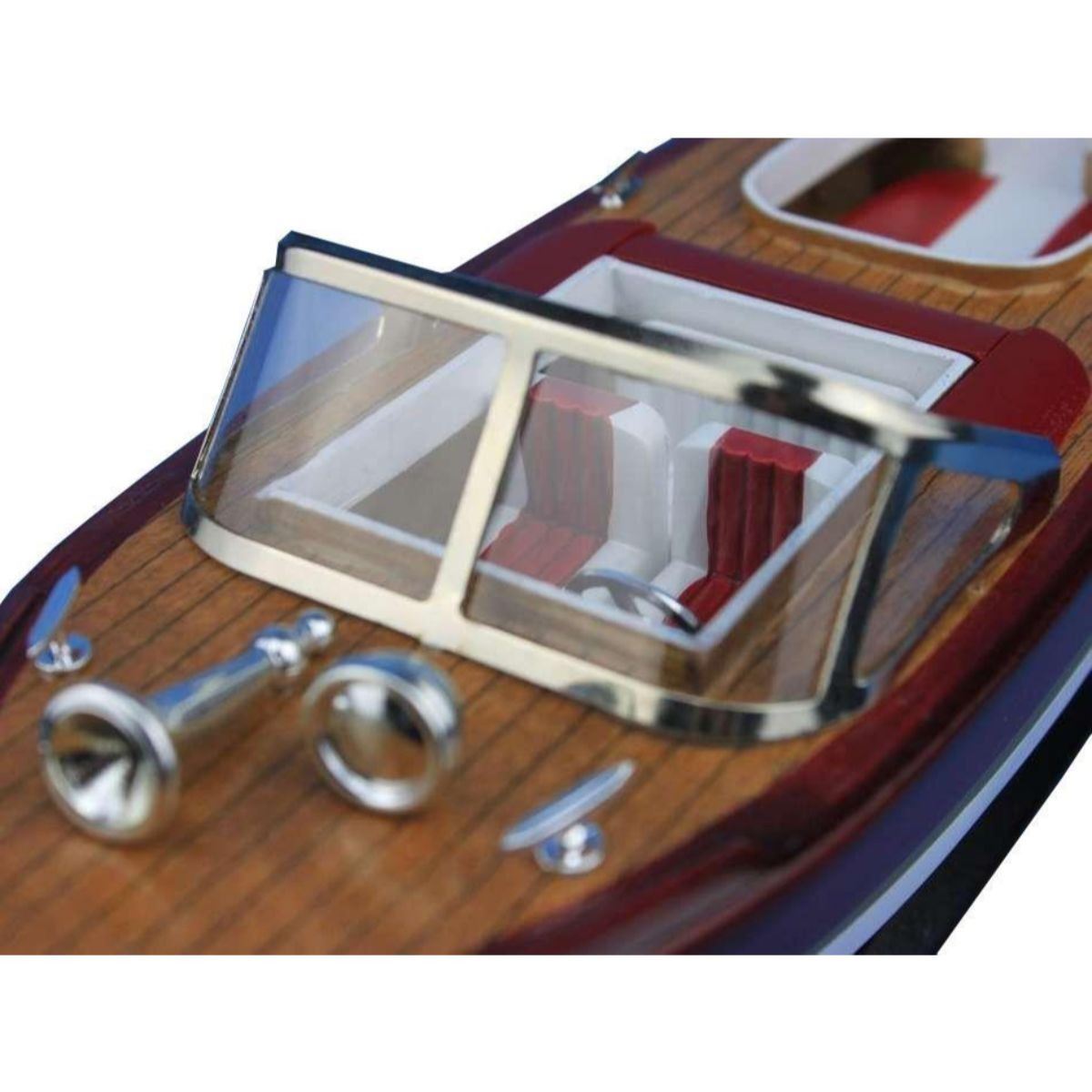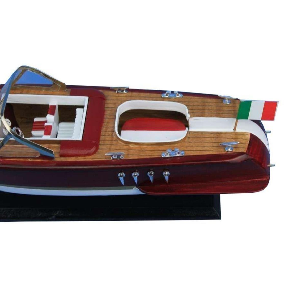 Feel as if you’re speeding across the water with the wind in your hair with this powerboat model of a classic mahogany hulled Riva Aquarama speedboat. Exquisitely crafted with precision detailing, this model speedboat of the iconic wooden-hulled Riva Aquarama powerboat will take you back to the luxurious pleasures of lazy days upon the river or perhaps waterskiing as you race across the lake. 14" Long x 5" Wide x 6" High Rare high-quality woods such as mahogany, birch, maple and yellow siris used for construction Amazing Details, including: Individual decking planks visible Stearing wheel, deck cleats, Italian flag and other details Sturdy wooden base attached with speedboat model Meticulously painted to match a real Riva Aquarama powerboat Â
