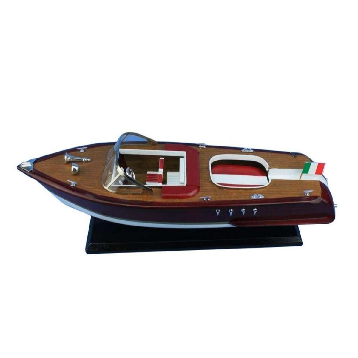 Feel as if you’re speeding across the water with the wind in your hair with this powerboat model of a classic mahogany hulled Riva Aquarama speedboat. Exquisitely crafted with precision detailing, this model speedboat of the iconic wooden-hulled Riva Aquarama powerboat will take you back to the luxurious pleasures of lazy days upon the river or perhaps waterskiing as you race across the lake. 20" Long x 7" Wide x 7" High Rare high-quality woods such as mahogany, birch, maple and yellow siris used for construction Amazing Details, including: Individual decking planks visible Stearing wheel, deck cleats, Italian flag and other details Sturdy wooden base attached with speedboat model Meticulously painted to match a real Riva Aquarama powerboat Â