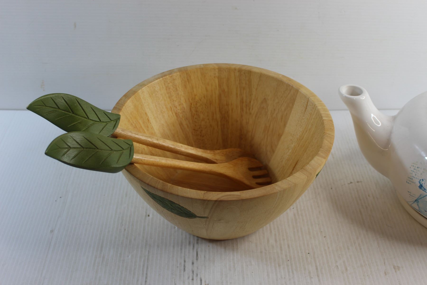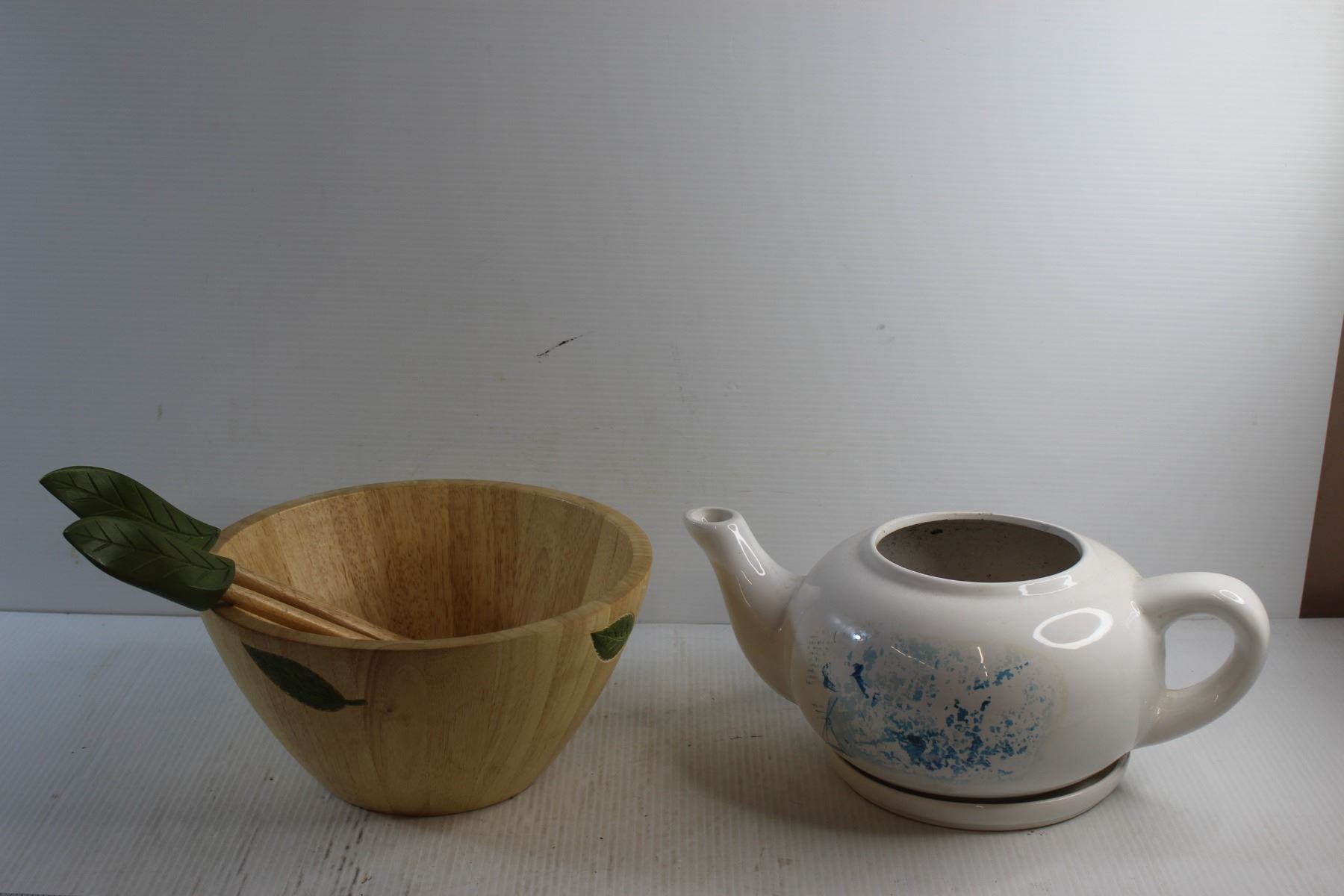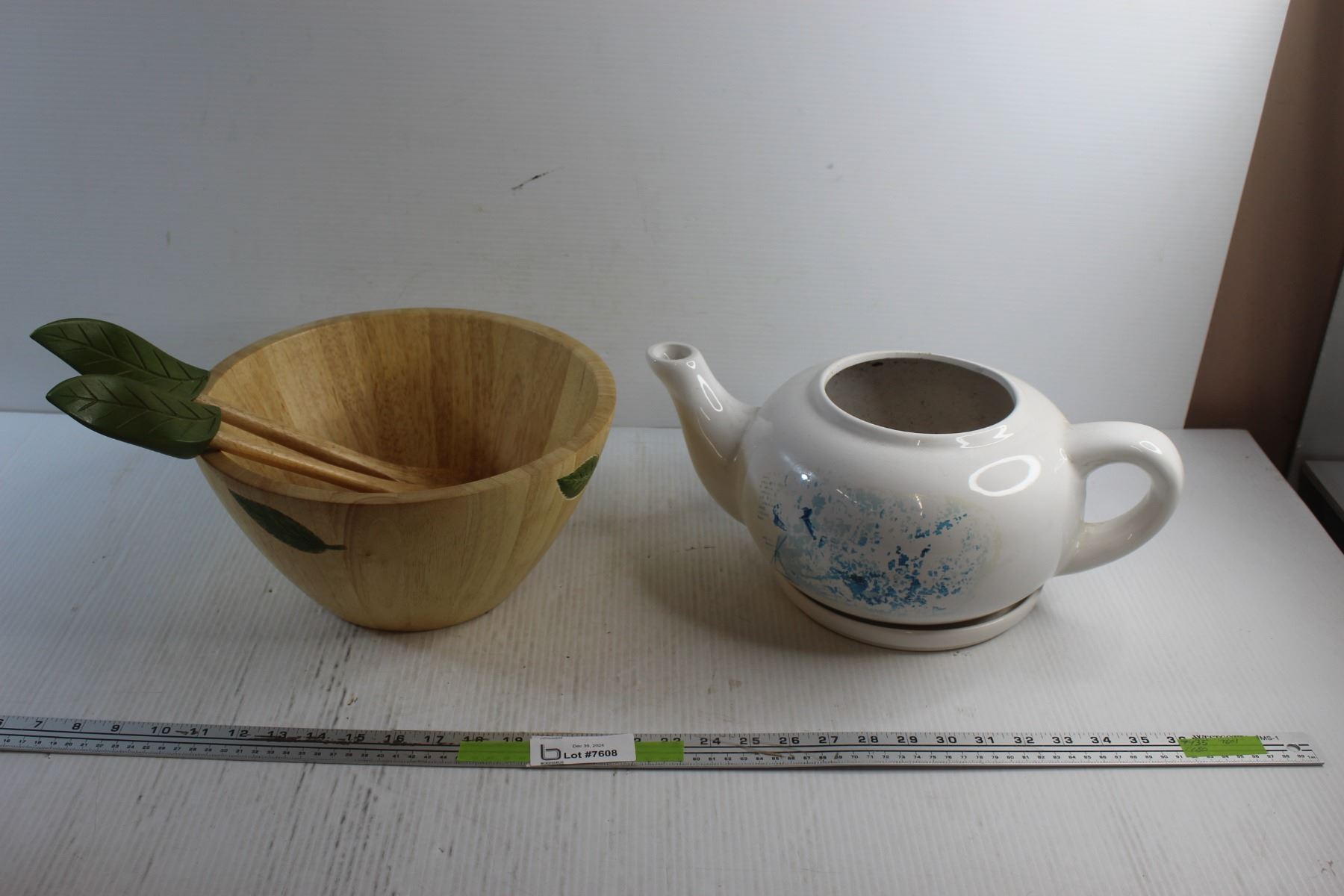 Wooden Salad Bowl with Salad Utensils and Ceramic Tea Pot Style Planter