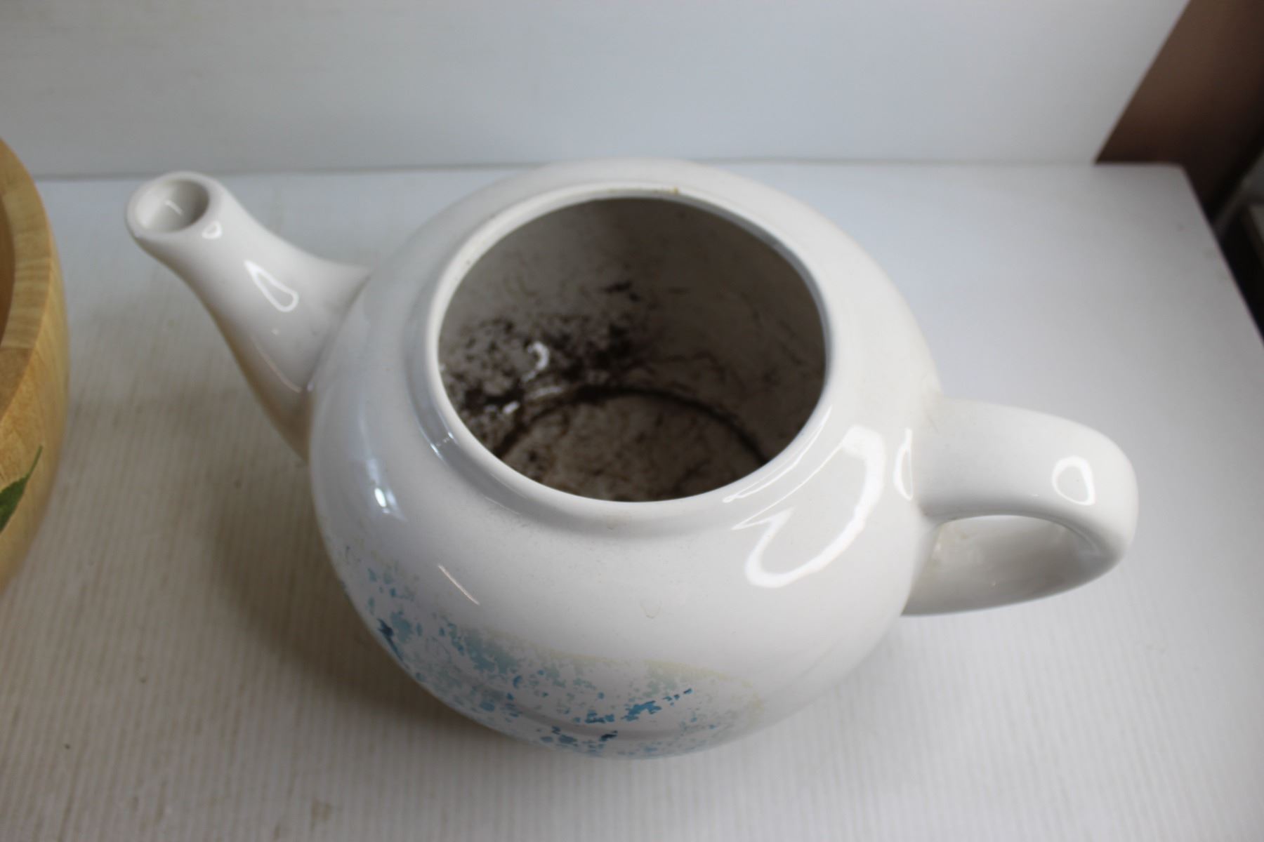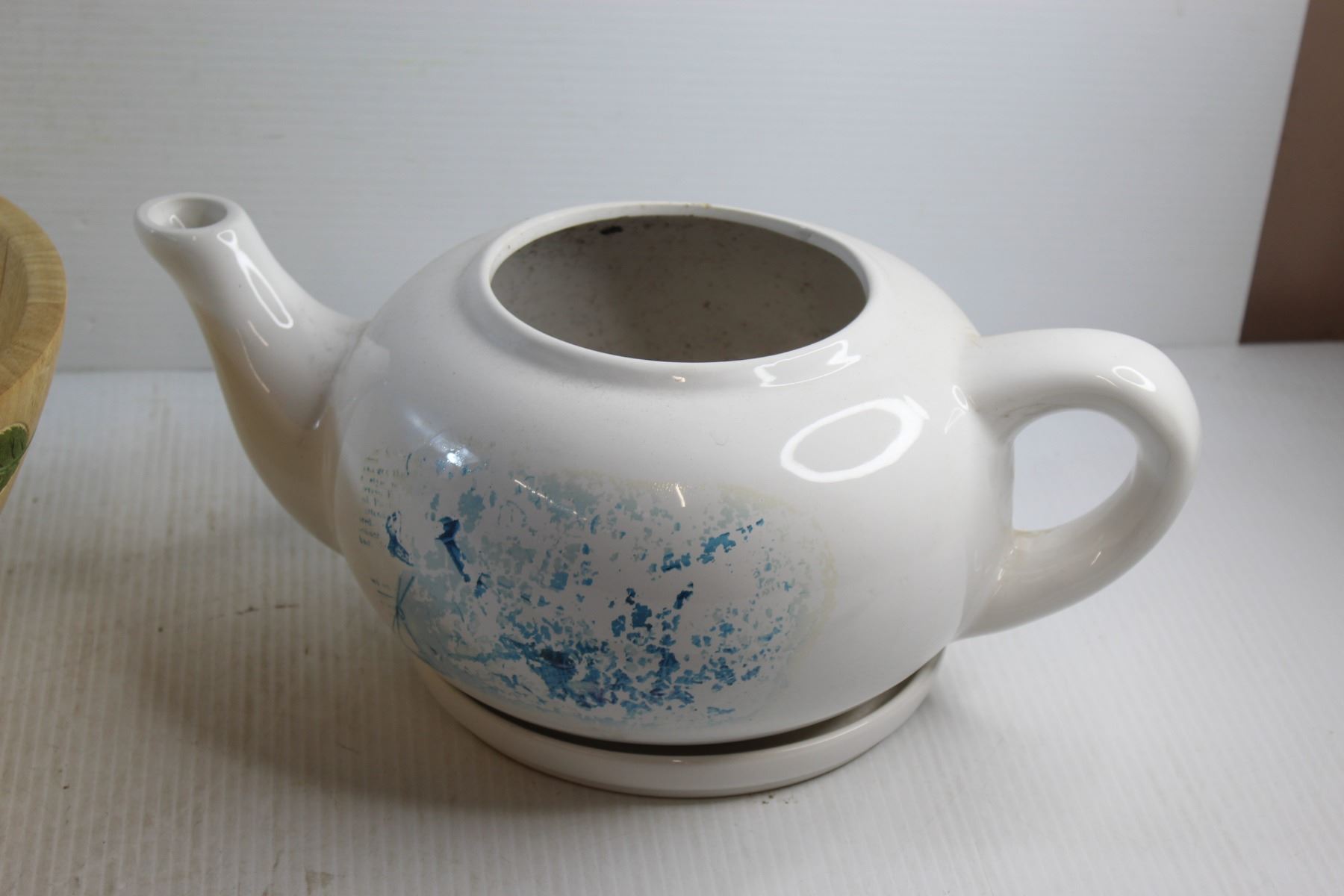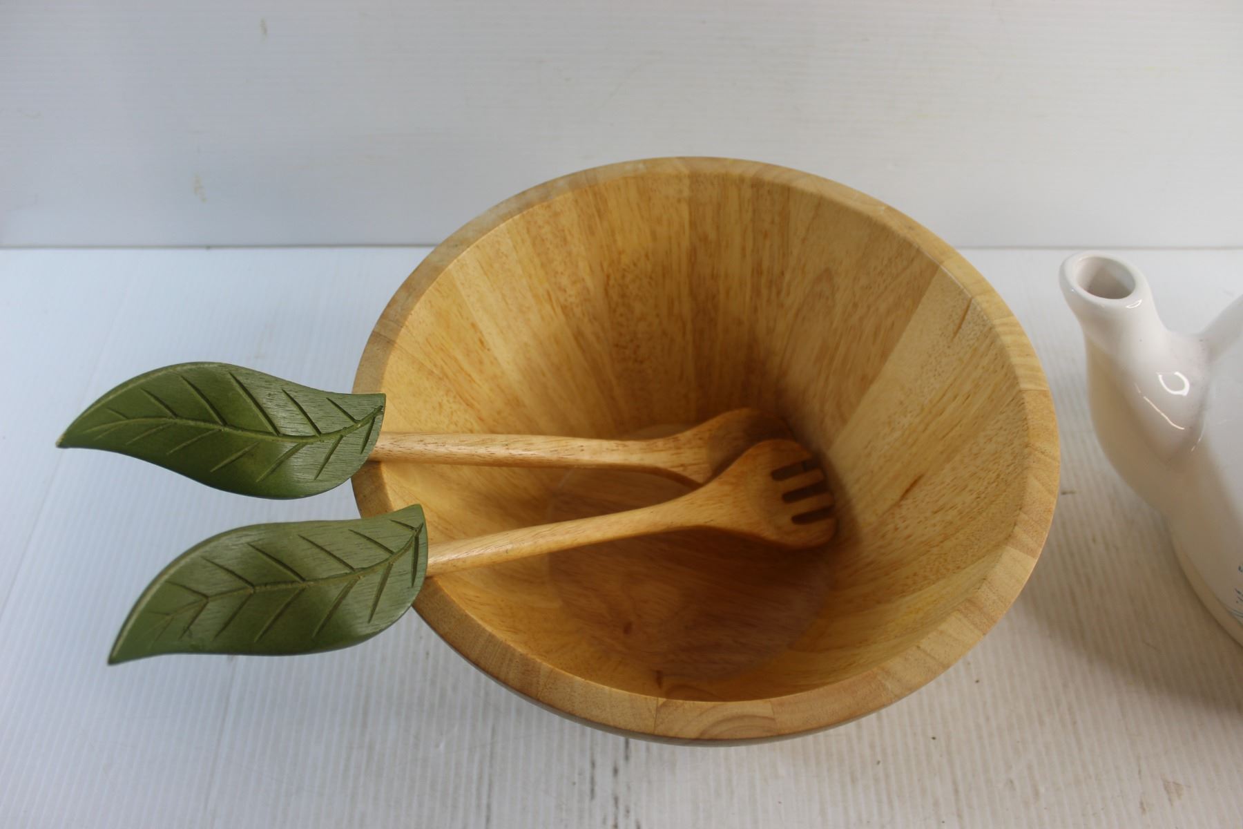 Wooden Salad Bowl with Salad Utensils and Ceramic Tea Pot Style Planter