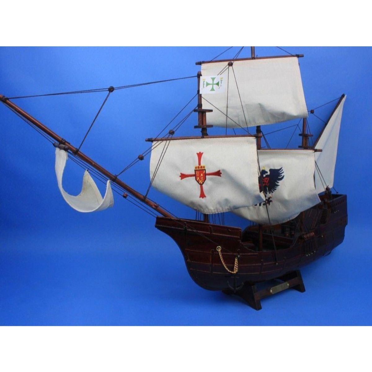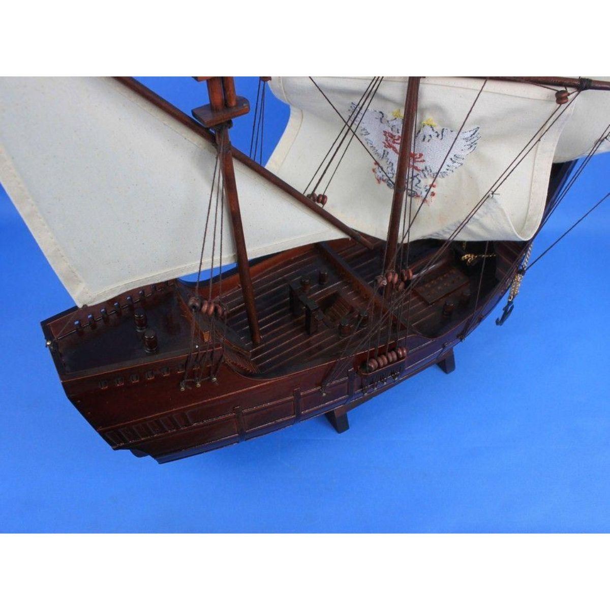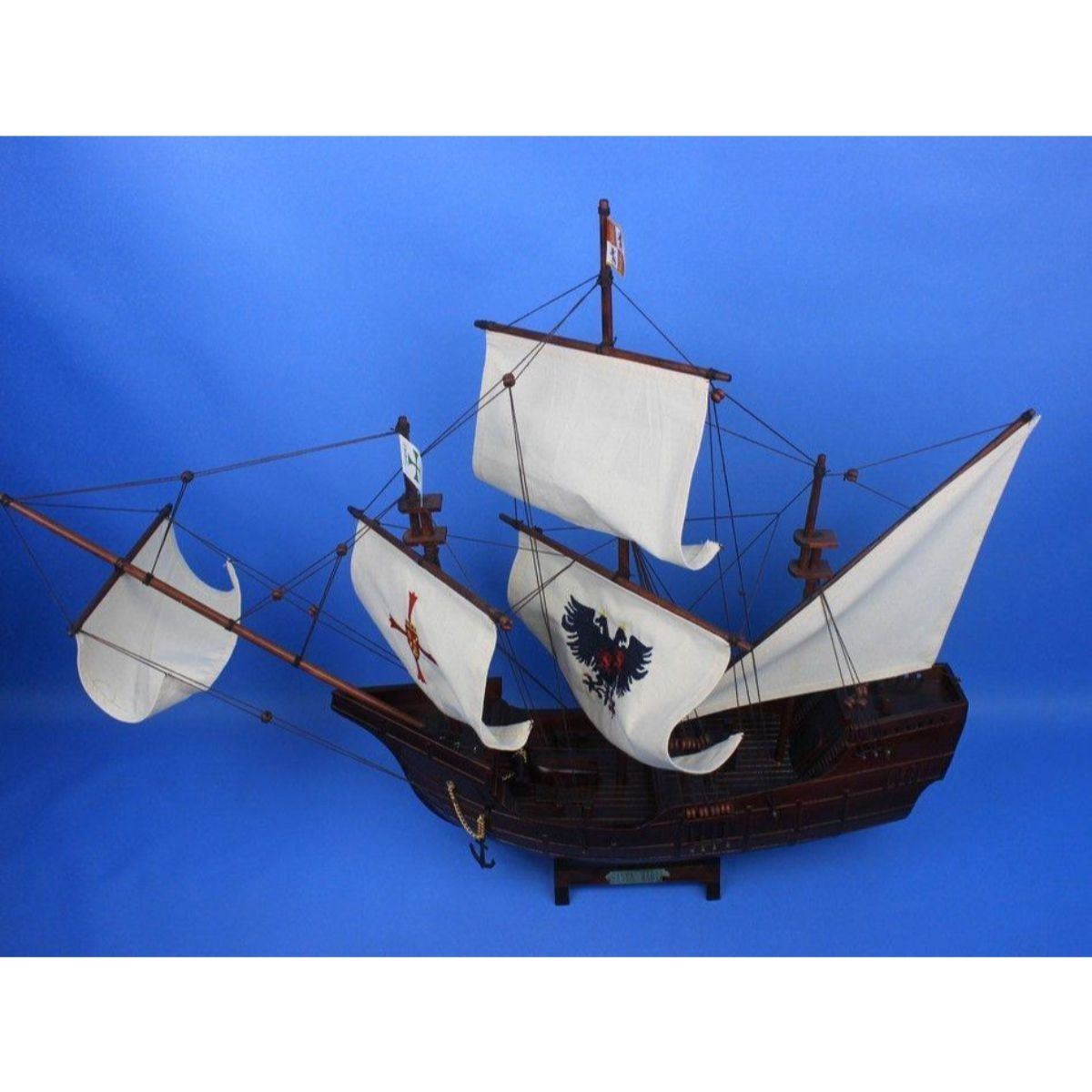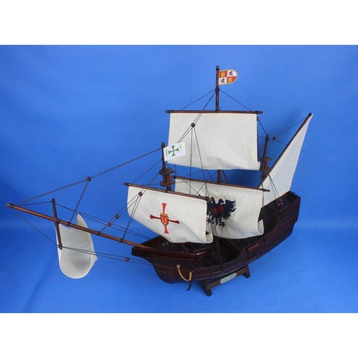 Wooden Santa Maria with Embroidery Tall Model Ship 30" SOLD FULLY ASSEMBLED Ready for Immediate Display - Not a Model Ship kit These fine tall ship models of the Santa Maria, the flagship for Christopher Columbus on his famous voyage to the New World, are historically accurate scale model replicas perfectly sized for any small shelf, desk or mantle. Add a flair of nautical decor to a den or living room, touch of history to a child’s bedroom, or an indomitable air of exploration and adventure to any office or boardroom. 30" Long x 9" Wide x 23" High Arrives fully assembled with all sails mounted Handcrafted wooden hull and masts 5 handsewn white cloth sails, 2 embroidered High quality woods include cherry, black walnut, birch and rosewood Metal nameplate on wooden base identifies the ship as the Santa Maria.