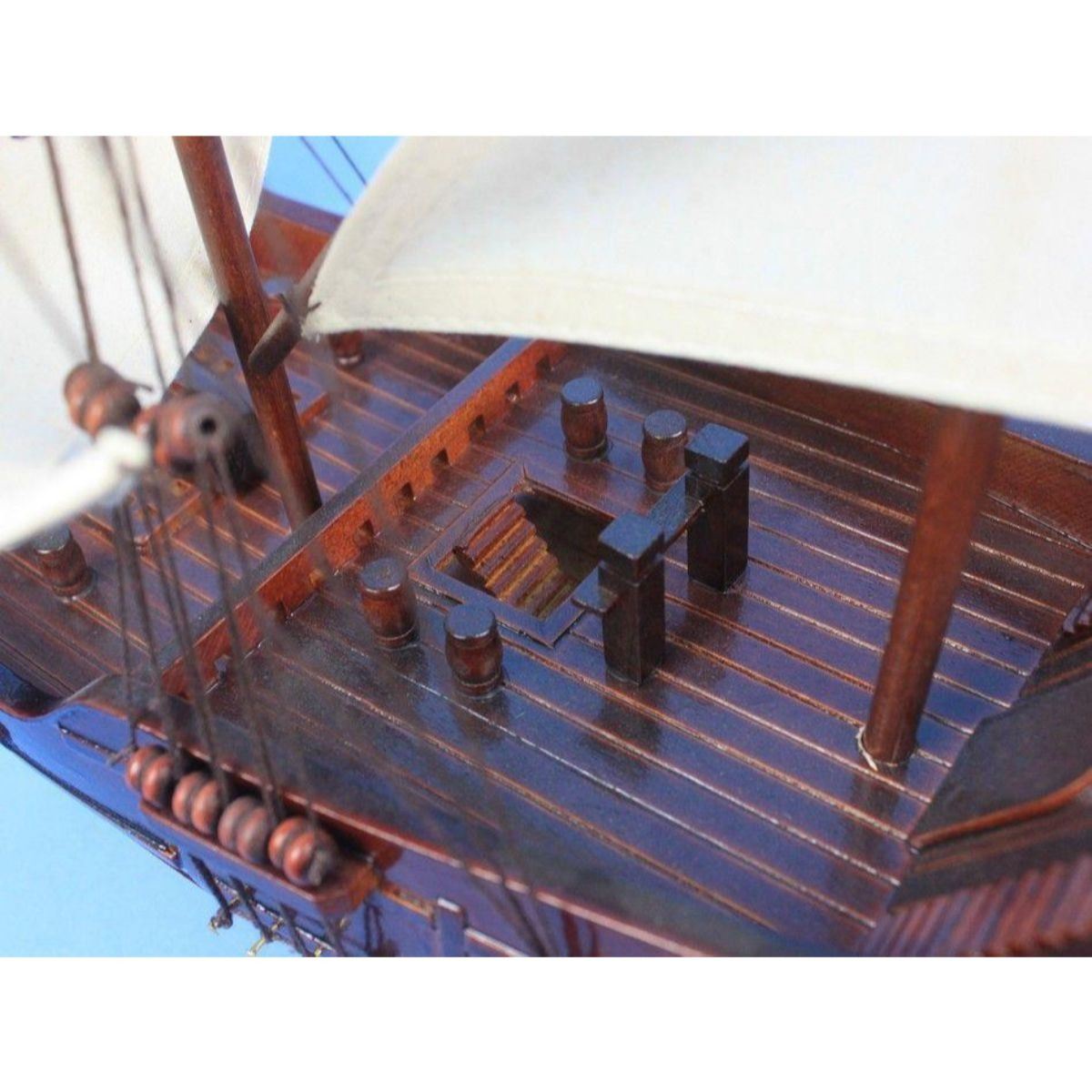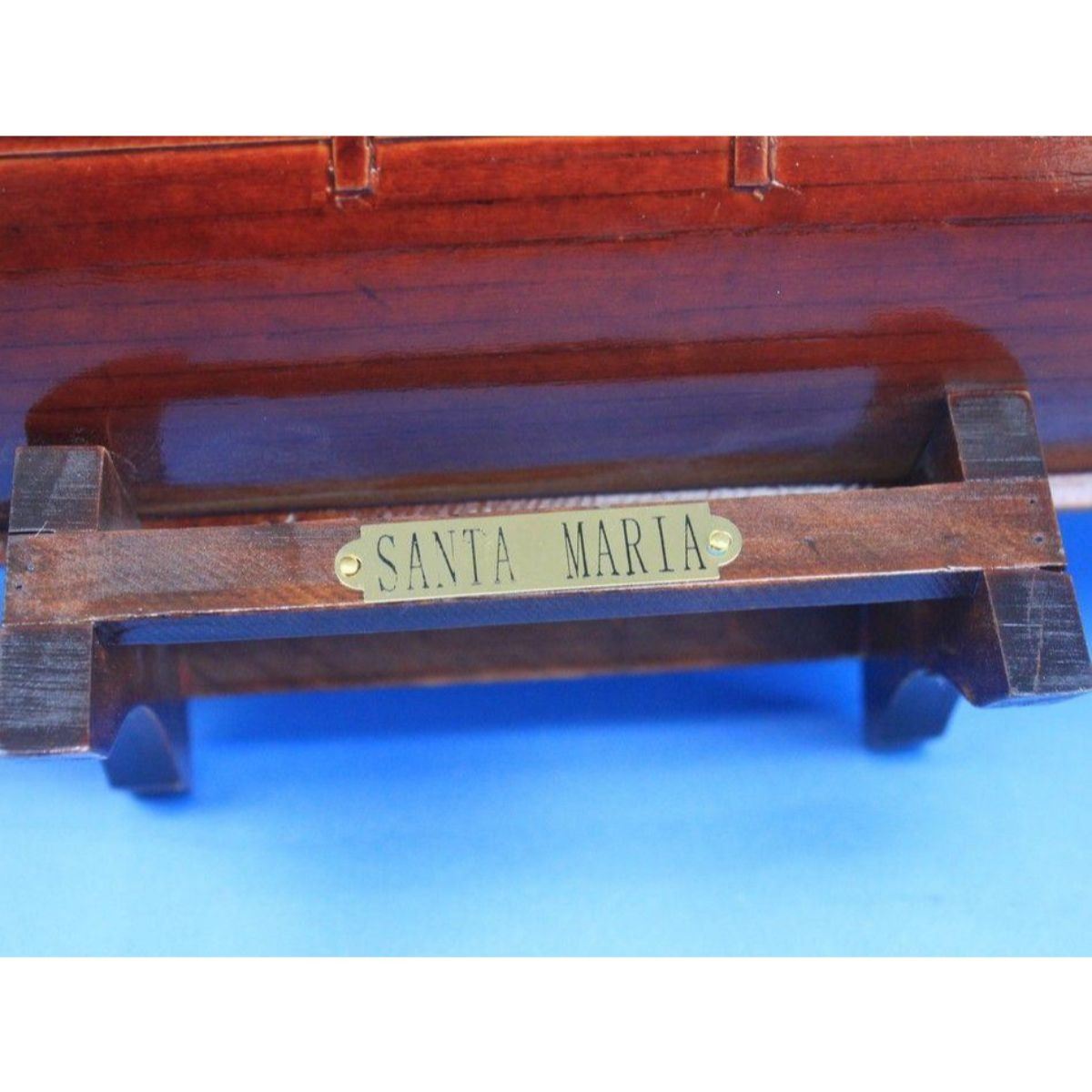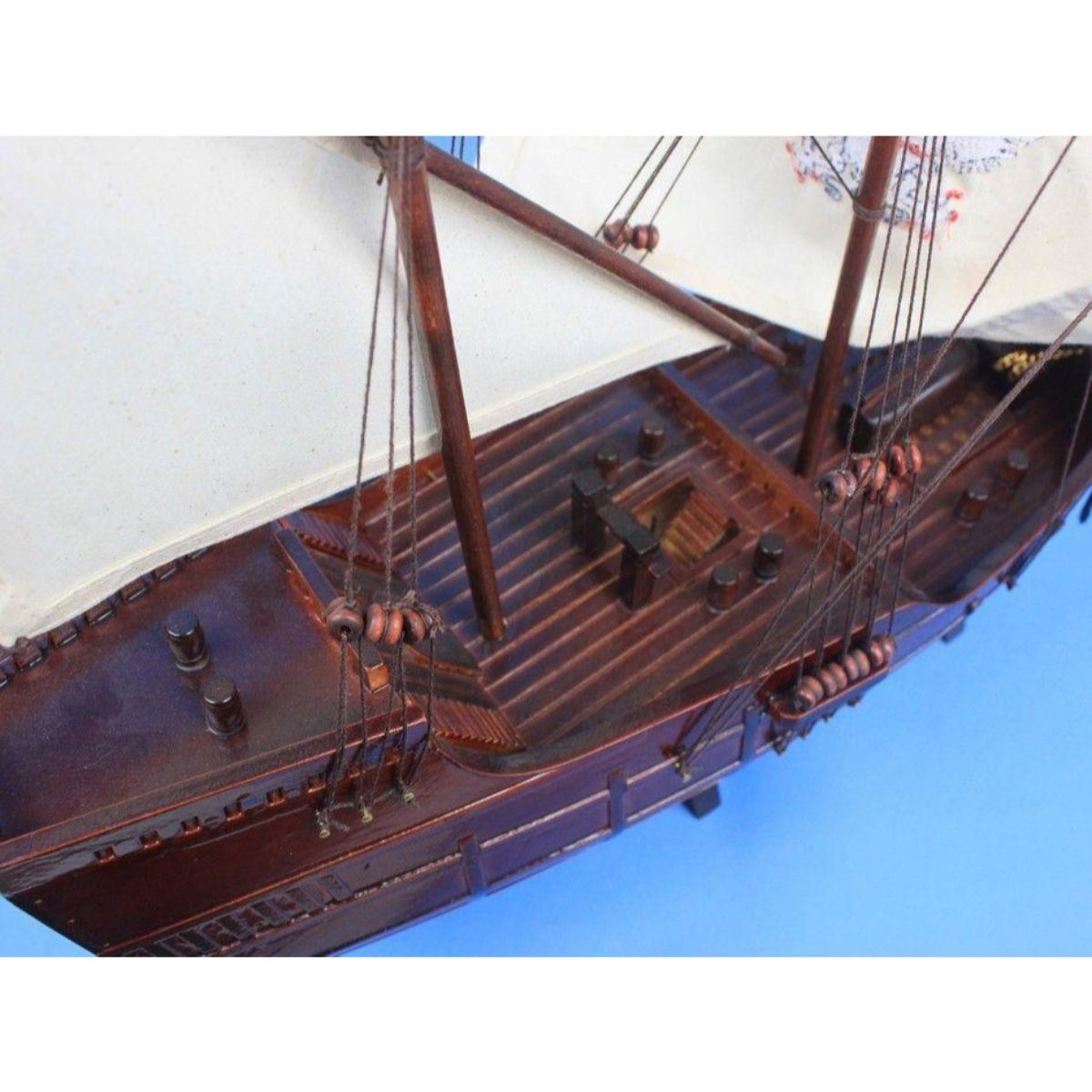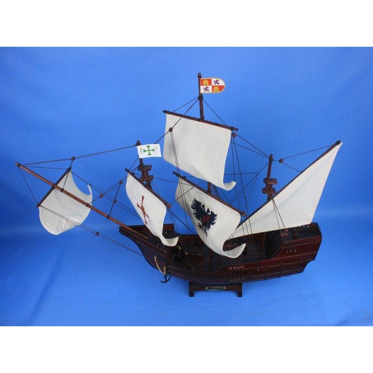 Wooden Santa Maria with Embroidery Tall Model Ship 30" SOLD FULLY ASSEMBLED Ready for Immediate Display - Not a Model Ship kit These fine tall ship models of the Santa Maria, the flagship for Christopher Columbus on his famous voyage to the New World, are historically accurate scale model replicas perfectly sized for any small shelf, desk or mantle. Add a flair of nautical decor to a den or living room, touch of history to a child’s bedroom, or an indomitable air of exploration and adventure to any office or boardroom. 30" Long x 9" Wide x 23" High Arrives fully assembled with all sails mounted Handcrafted wooden hull and masts 5 handsewn white cloth sails, 2 embroidered High quality woods include cherry, black walnut, birch and rosewood Metal nameplate on wooden base identifies the ship as the Santa Maria.