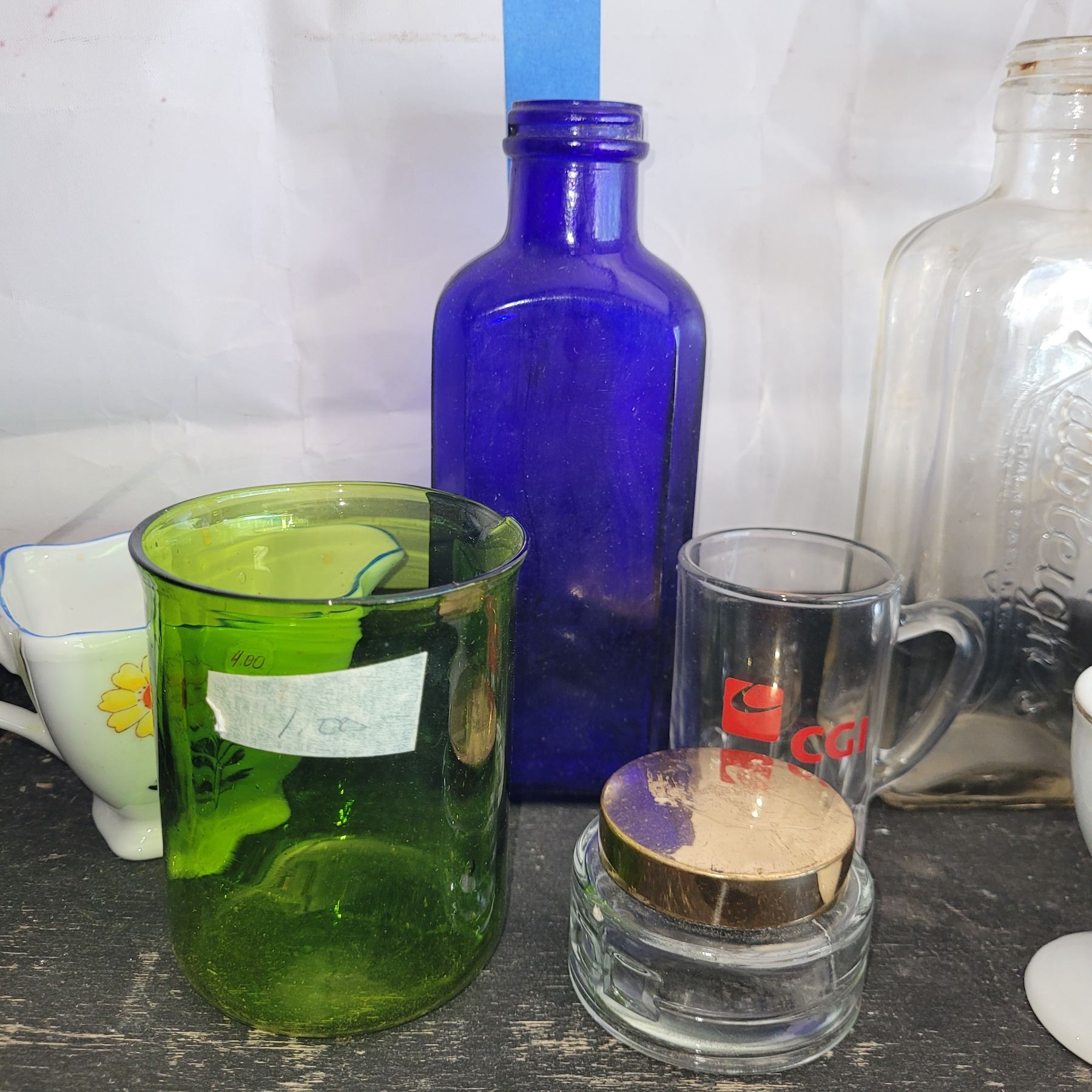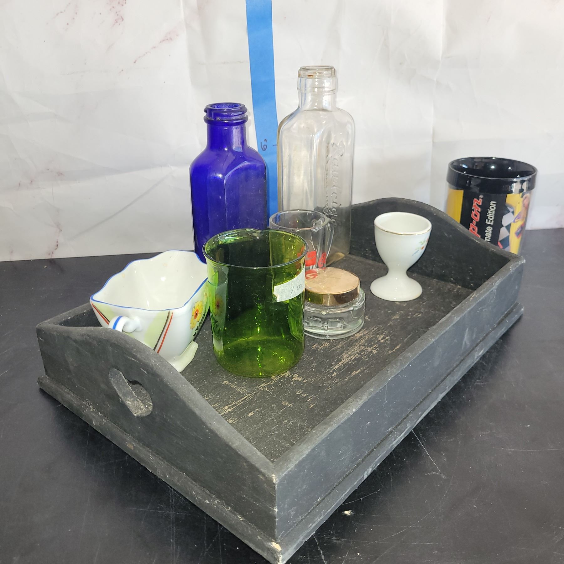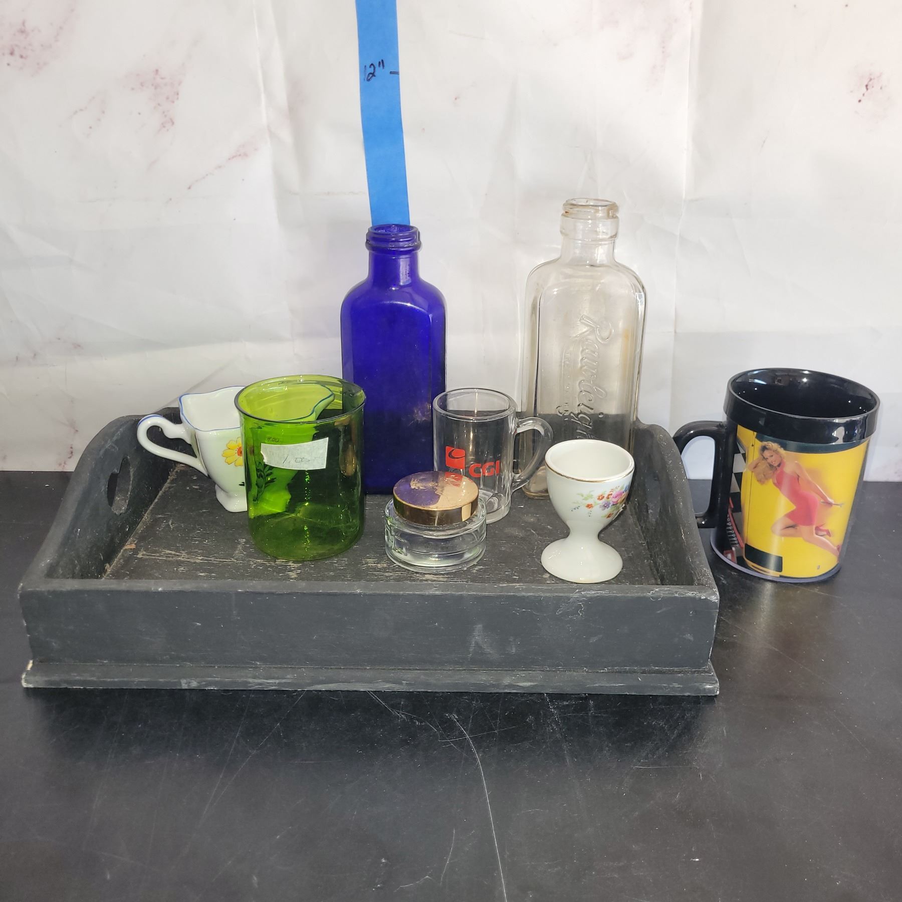 Wooden Serving Tray with Various Glassware, Bottles Etc