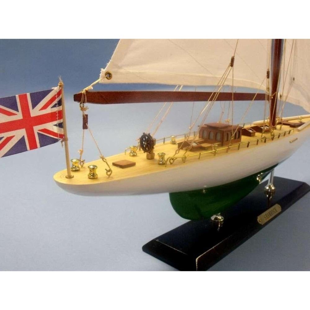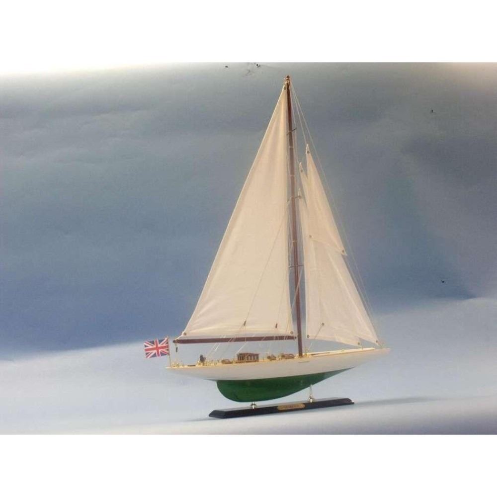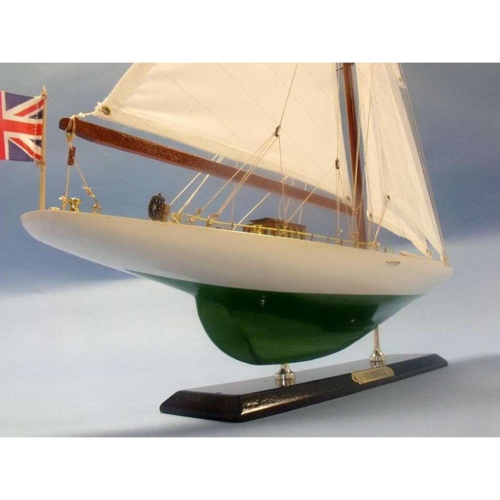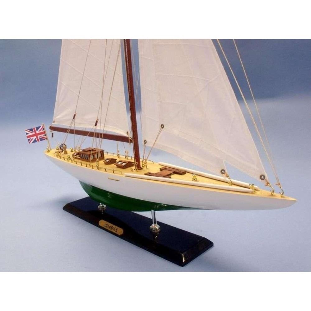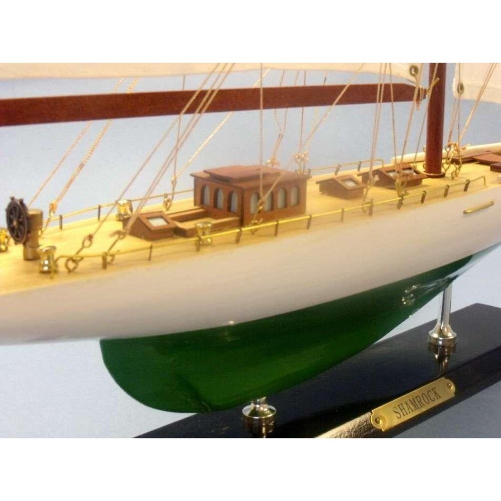 Wooden Shamrock Limited Model Sailboat 27" NOT A MODEL SHIP KIT Attach Sails and the Shamrock yacht model is Ready for Immediate Display  Increased craftsmanship and significantly upgraded deck features highlight our newly redesigned Limited Edition model sailboats of Irish challenger to the America’s Cup, the racing yacht Shamrock. Namesake of a proud lineage of Irish racing contenders, the wind and waves will take you away with Shamrock in this Limited Edition yacht model. As a high-quality model with finely-crafted features and graceful lines, these Shamrock model sailboats are perfectly sized to suit a sunroom mantle, bedroom shelf or office desk. 20" L x 3" W x 27" H (1:71 scale) Accurate museum-quality yacht model of the real Shamrock racing yacht Individual plank on frame construction of the hull using fine quality woods, with each plank and wood grain visible through the paint High quality craftsmanship and details, including: Higher quality woods used in construction of hull and deck features Increased number of details and items on deck, including deck cleats, window panes in deckhouses, tied-down lifeboat and more Improved details and accuracy of all deck and hull components Finely stitched cloth sails Limited production run of this yacht model Significant research to guarantee accuracy of this model yacht includes sources such as photos, historical plans and original artwork Fully assembled with all masts, sails and rigging already secure and taut Pre-assembled, simply attach the masts and display Ready to display in less than five minutes Separate pre-assembled hull and sails ensure safe shipping and lower cost Insert mast in designated hole and clip brass rigging hooks as shown in illustrations Sails and rigging already complete