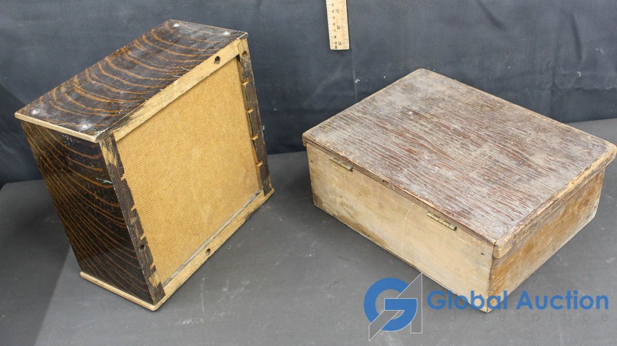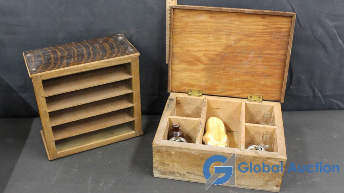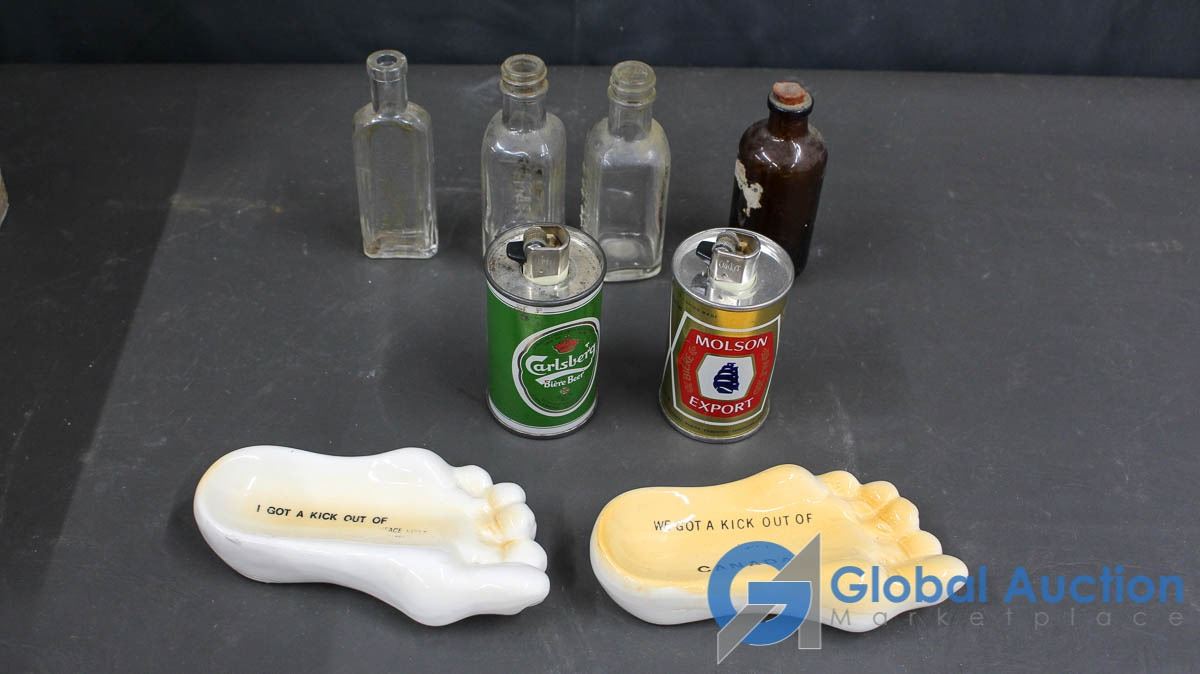 Wooden Shelf and Wooden Organizer Box w/Molson Export and Carlsburg Lighters and Misc.
