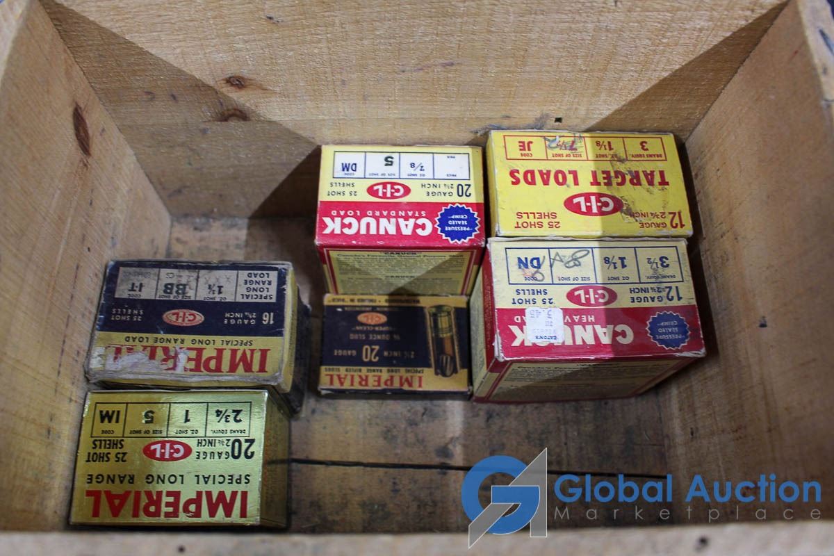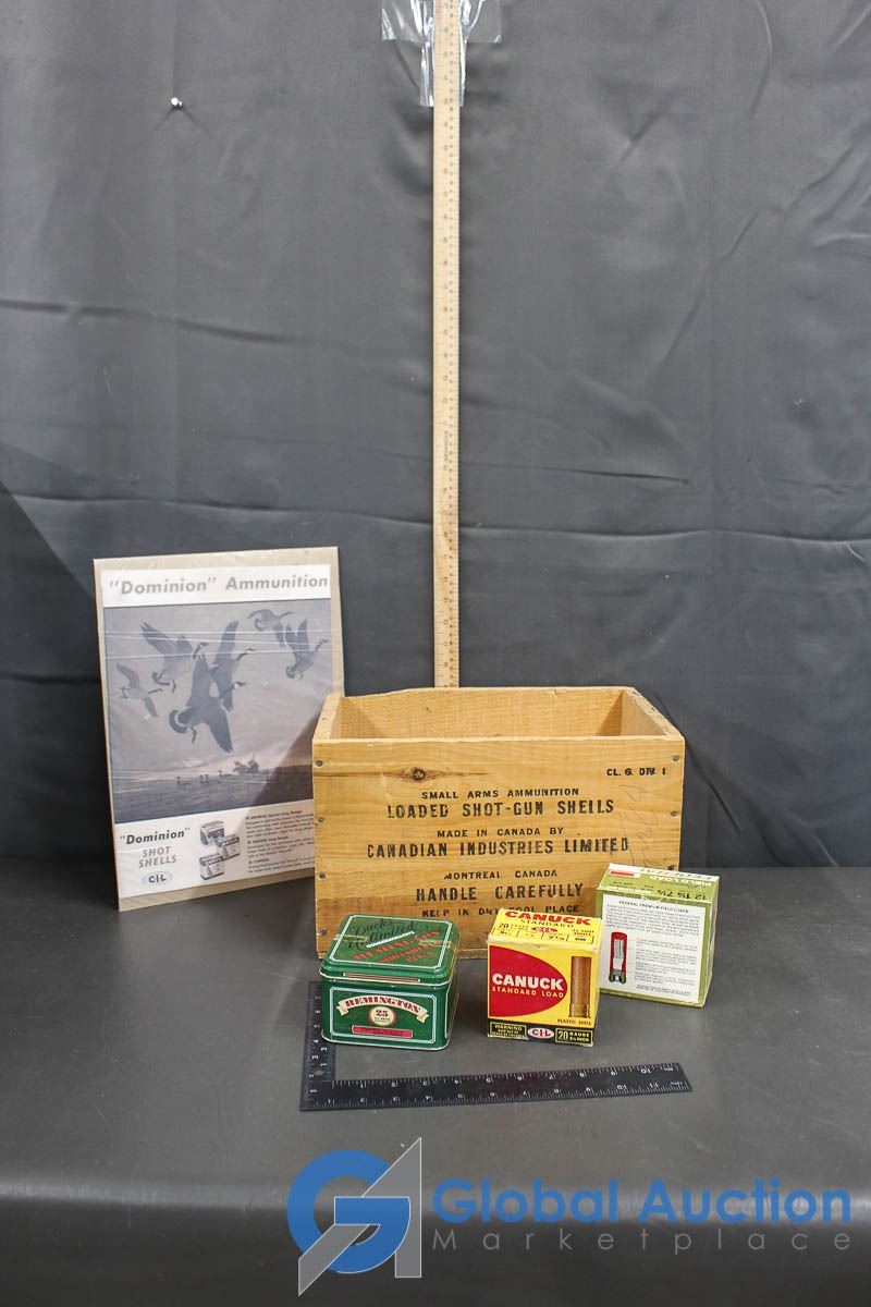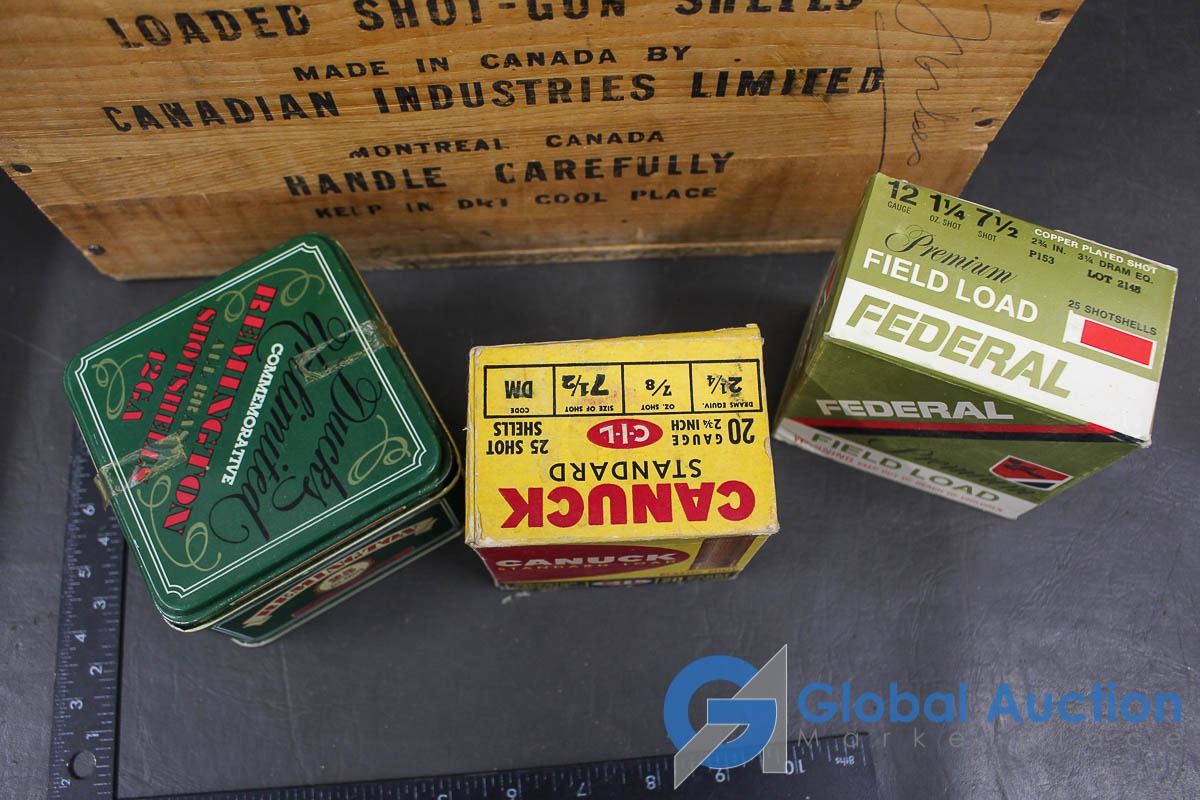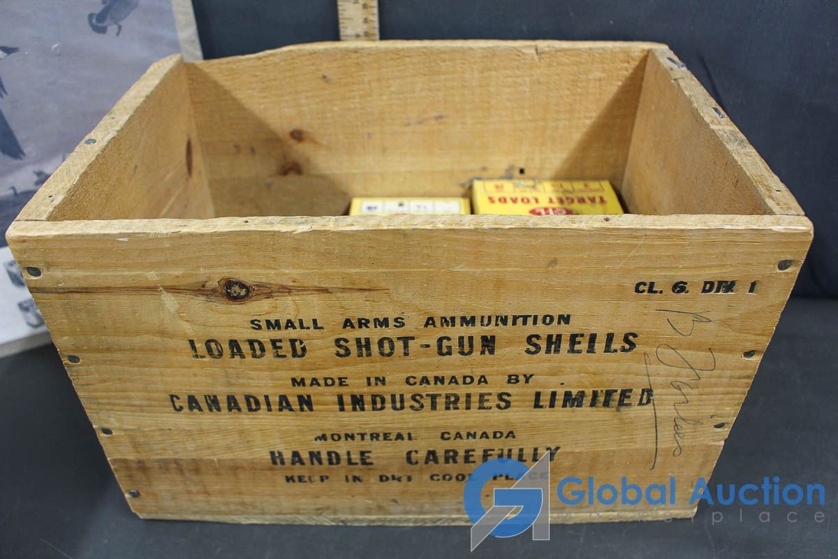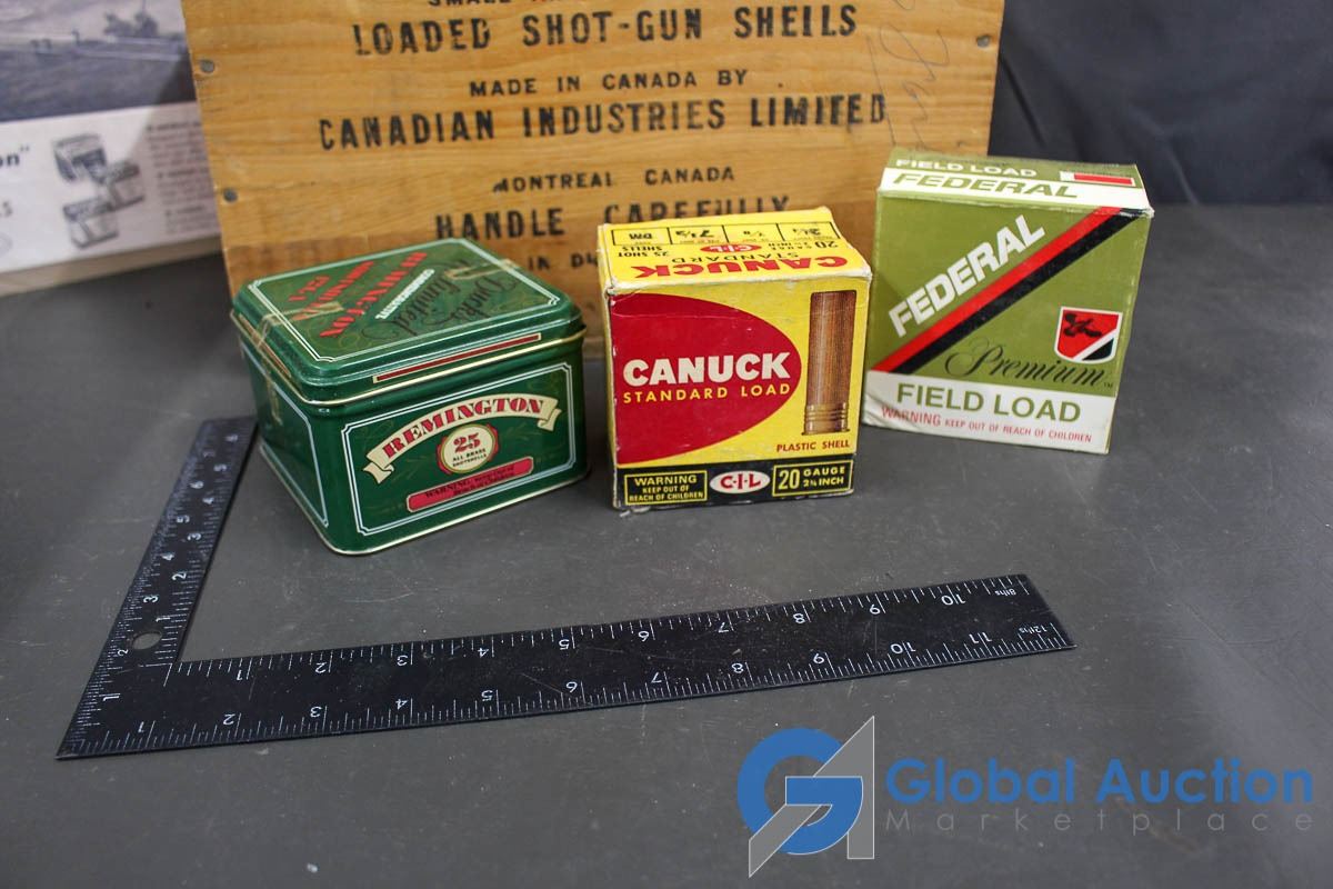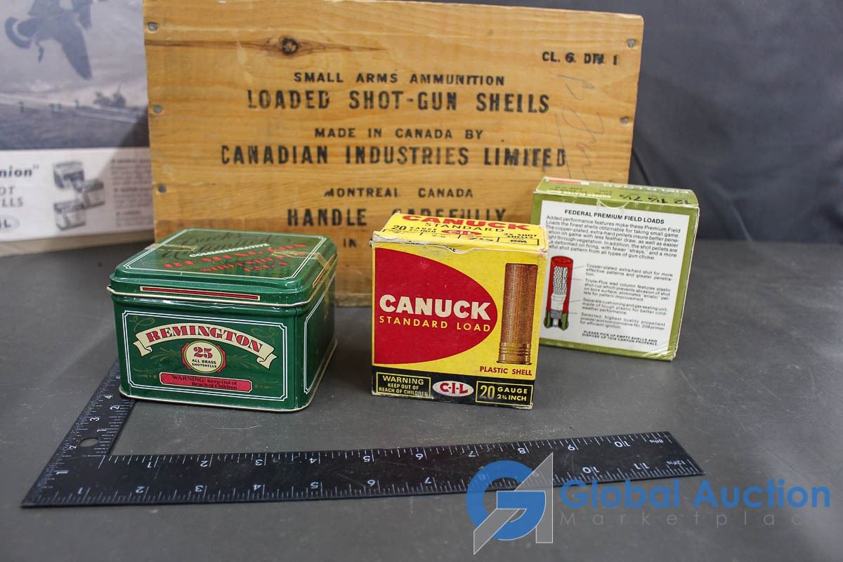 Wooden Shell Box, Cardboard Ammo Sign & (9) Vintage Shell Boxes