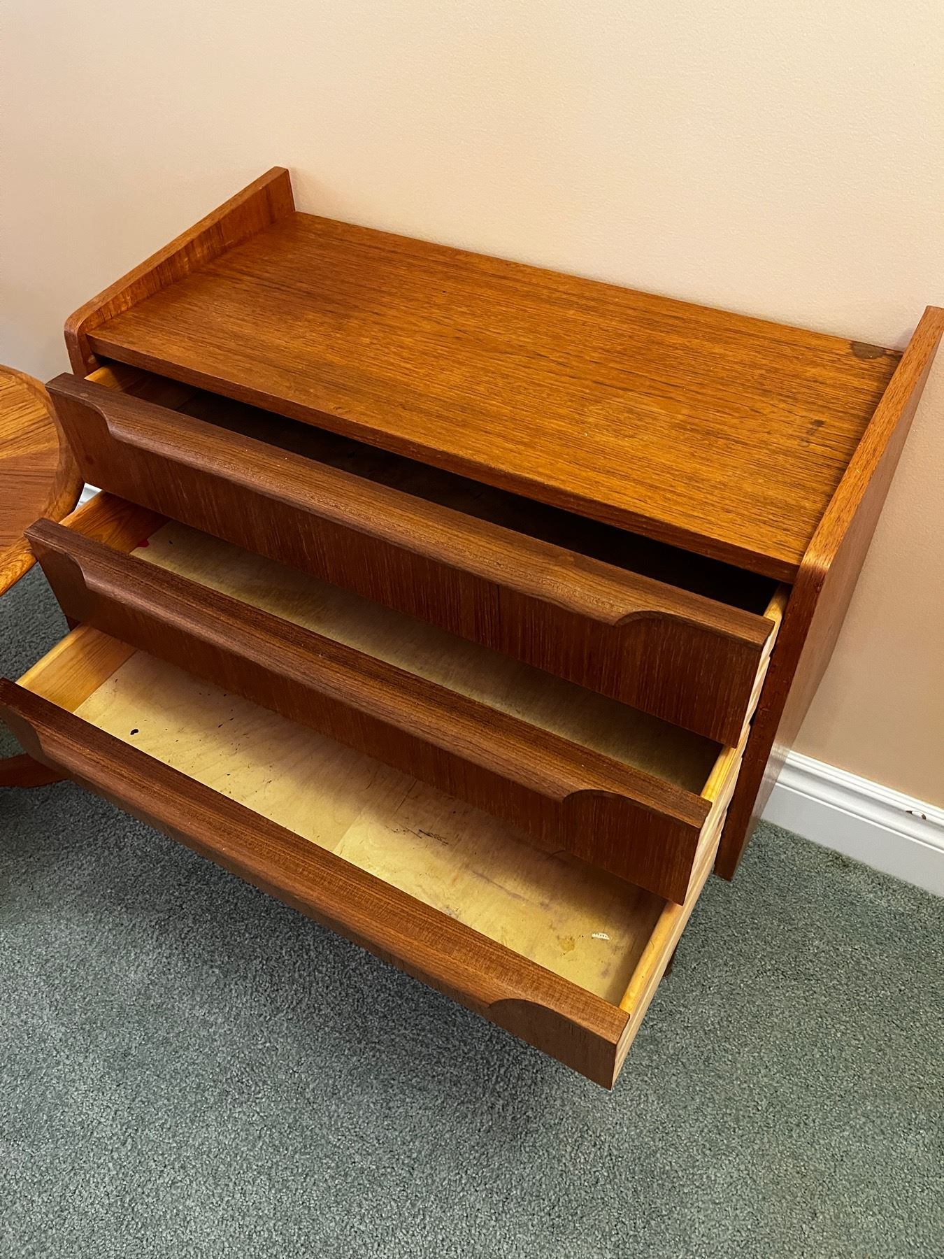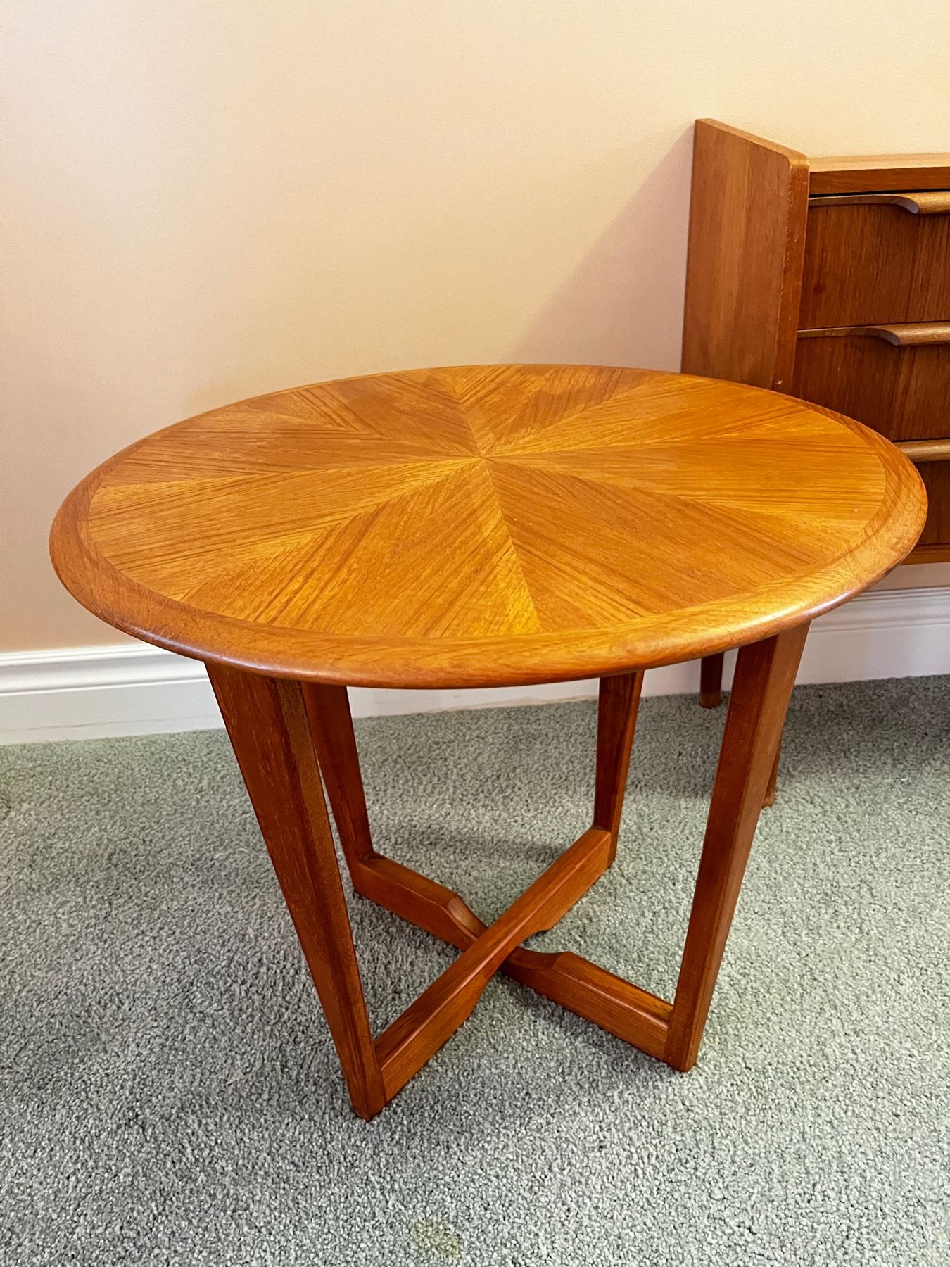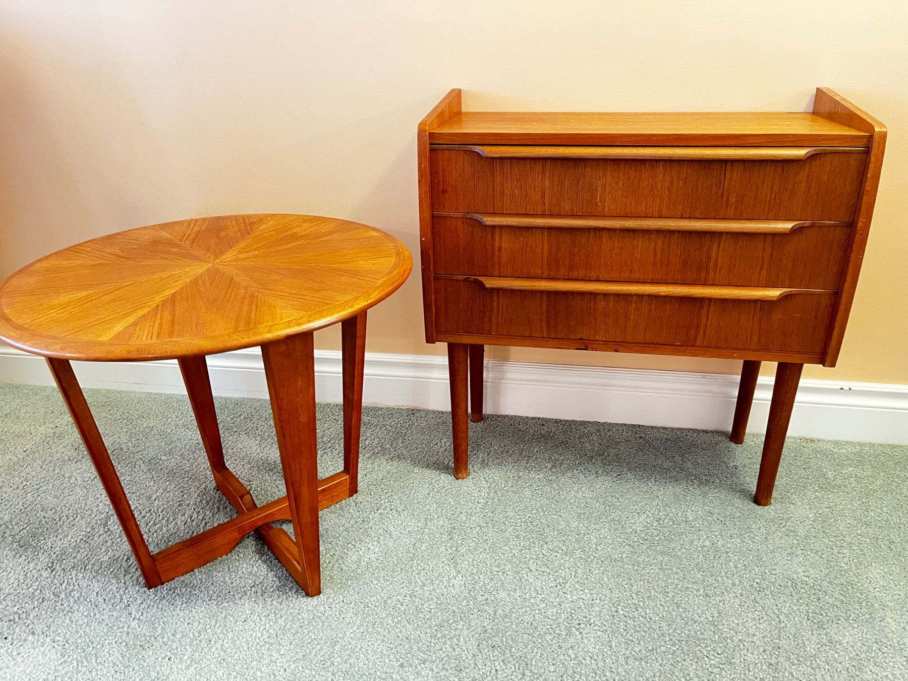 Round wooden side table measuring 19" high and 22" diameter, end table measures 26h(x)25"L(x) 11" deep.
