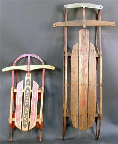 Wooden Sleds (Lot of 2) 1 Large - W/Red Arrow down middle 56" L : 1 Small (Royal Racer) 36" L