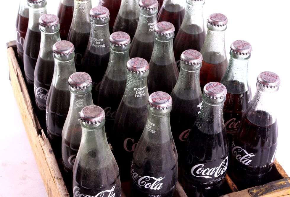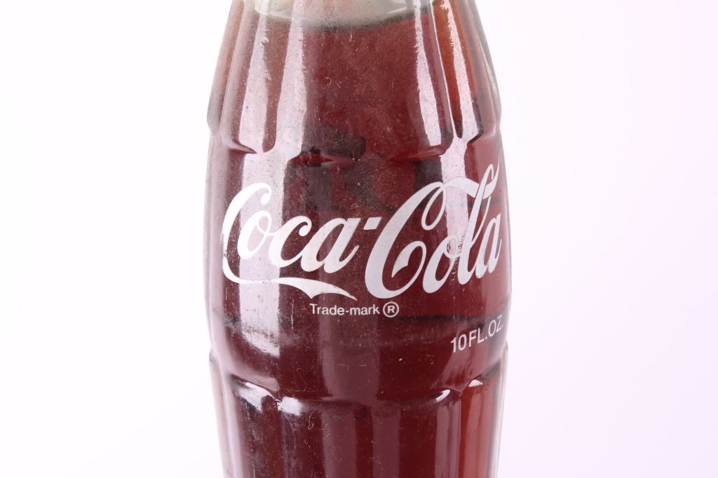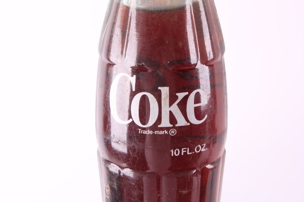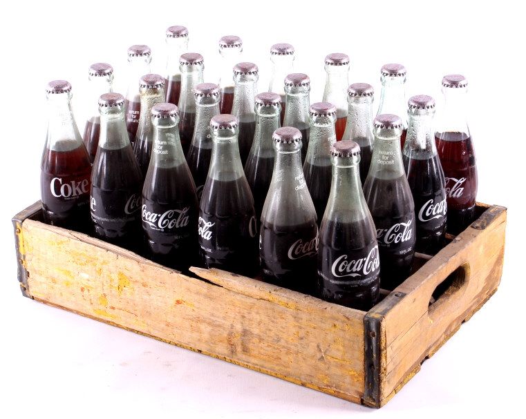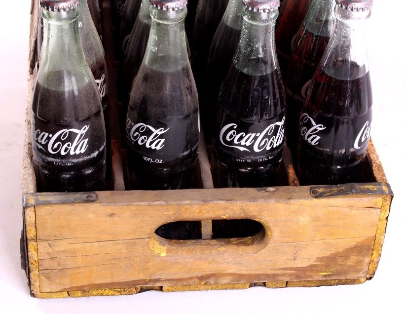 This is a full case of Coca Cola bottles in a wooden crate. The crate, believed to be Coca Cola, has lost its lettering but has a unique, vintage look. The bottles are full. The crate and bottles are in good condition. The crate measures 12" x 19".