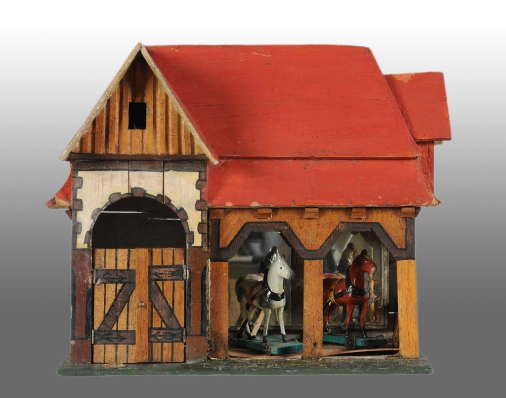 German. Circa 1920s. Includes two original stable horses. Two opening wooden doors. Hand-painted red roof and sides. Unusual and early piece with odd shaped roof. Excellent condition. Size 14" x 12".