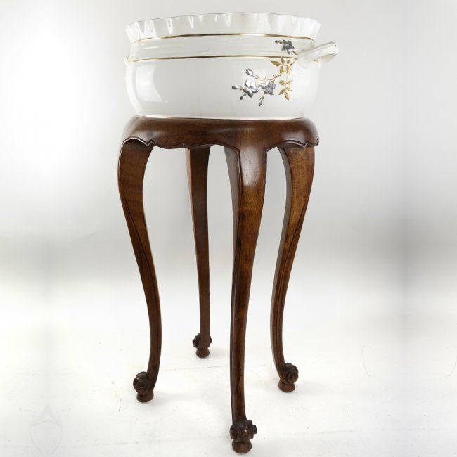 Country-style wooden table/stand on cabriole legs with an oval shaped porcelain basin. [Table: 27 1/2" H, with bowl: 35" H]. Cracks on bottom of bowl, scratches on table.