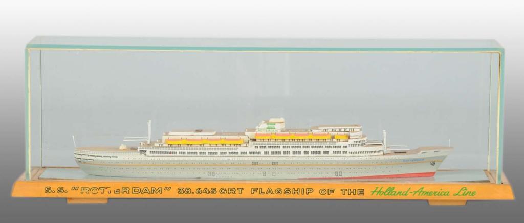 Wooden model replica of the SS Rotterdam Flagship of the Holland-American Line. Beautifully made model protected in glass case. Ship Condition (Near Mint). Size 12" L.