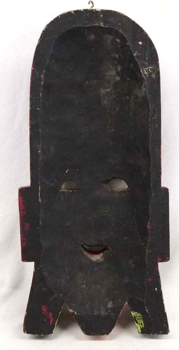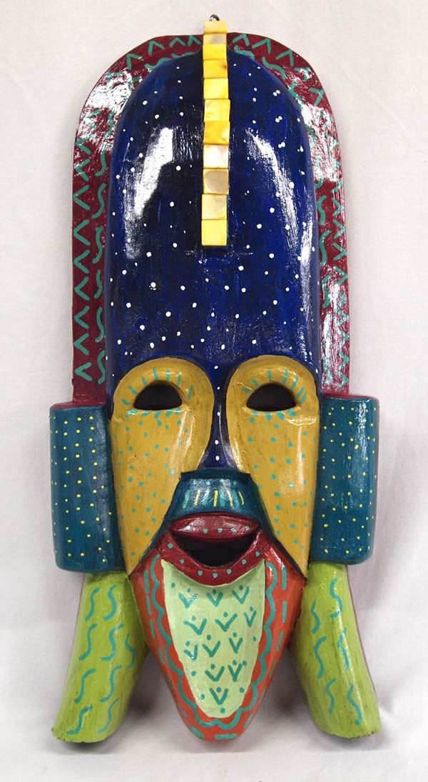 Wooden Tribal Mask Hand Painted by Kills Thunder, measures 9'' x 18''L, yellow shell tab bead accents