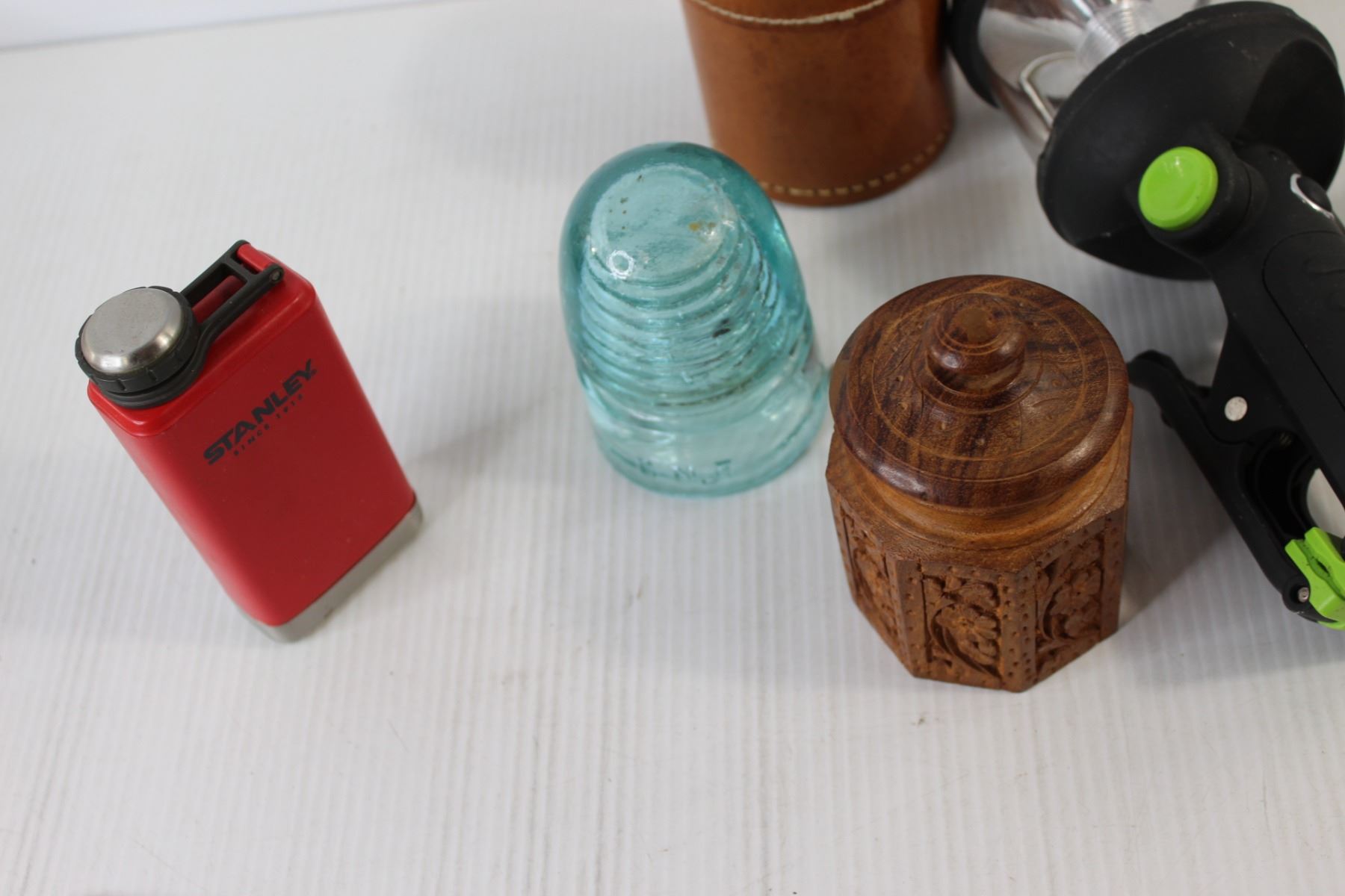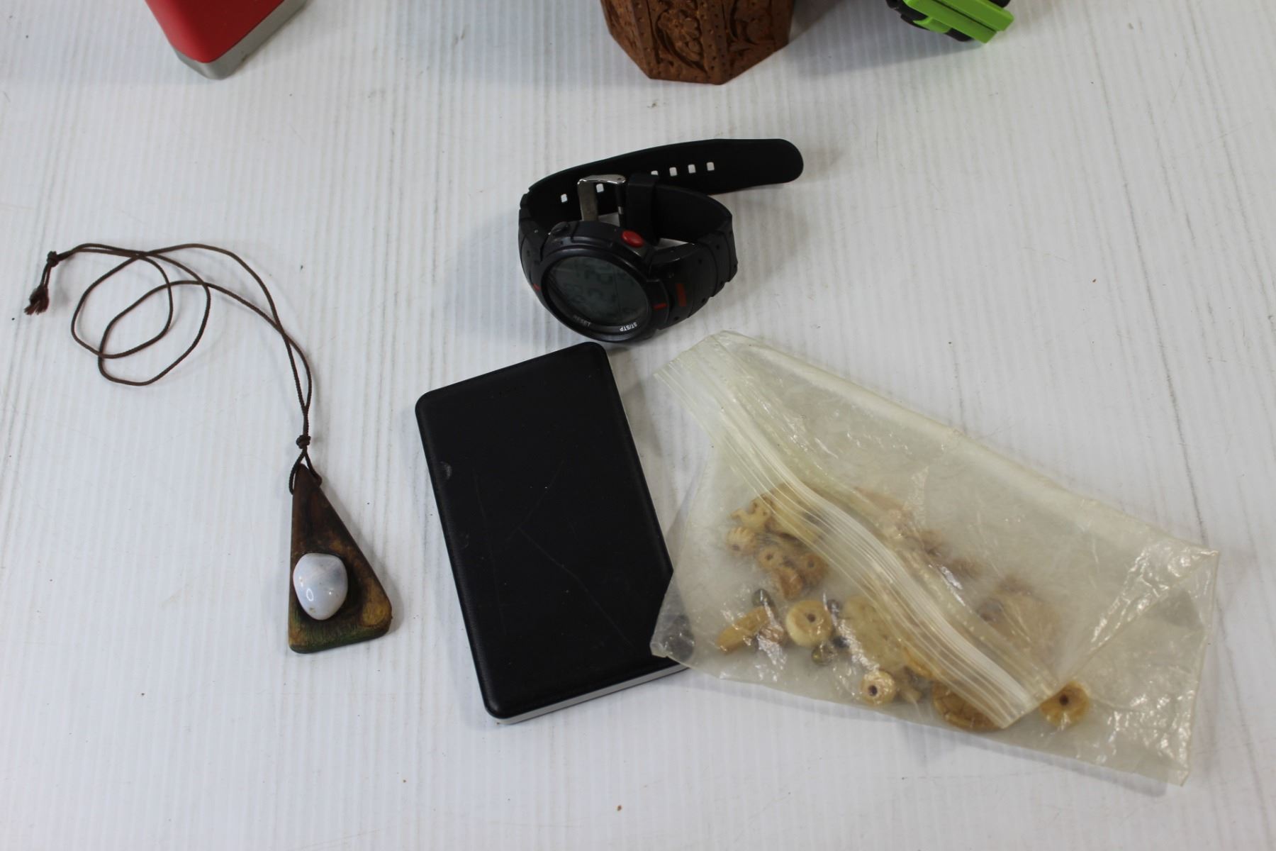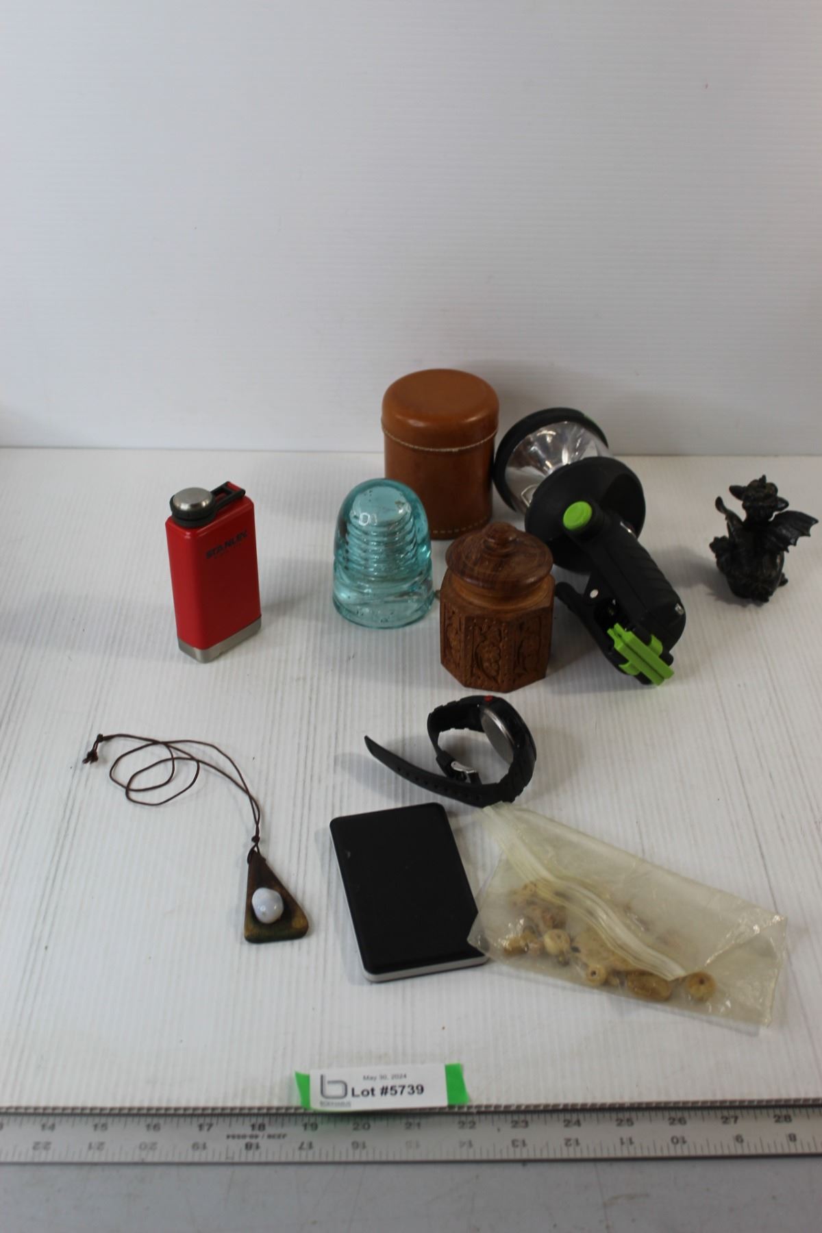 Wooden Trinket Container, Stanley Flask, Watch, Power Bank, Misc.
