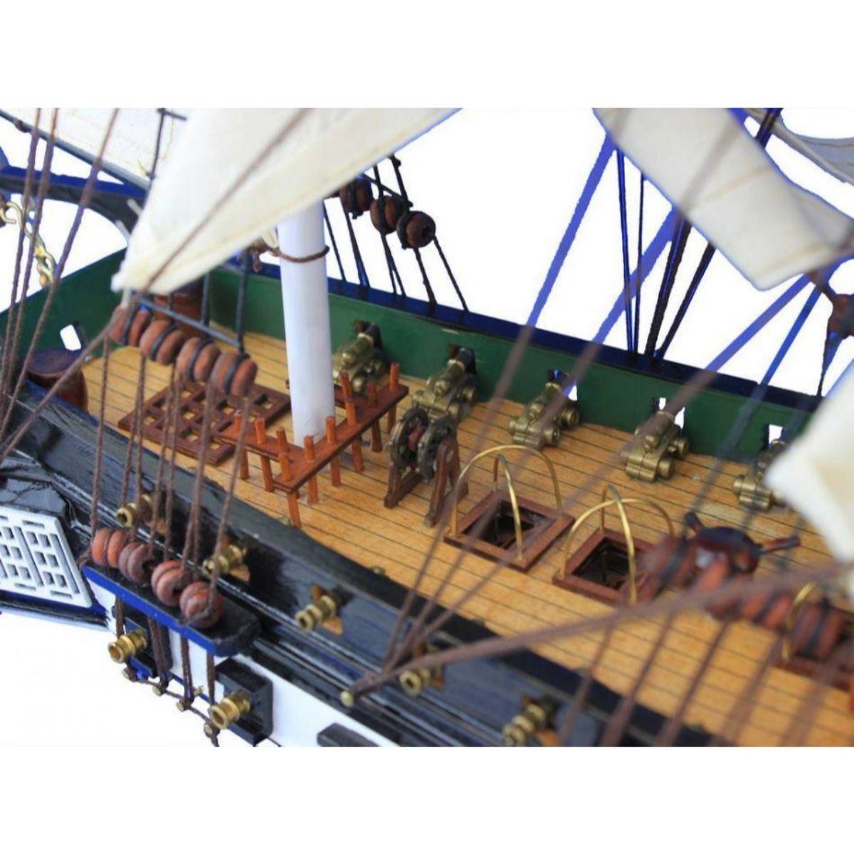 Fine craftsmanship and attention to detail highlight this scale tall model ship replica of “Old Ironsidesâ€, the US Navy’s oldest and most famous fighting tallship. Whether seated upon a shelf, desk or table, these USS Constitution tall ship models proudly displays their exquisitely-crafted features and indomitable historic and patriotic spirit. 32" Long x 7" Wide x 24" High (1:82 scale) Built from scratch by master artisans High quality woods include cherry, birch, maple and rosewood Gun ports actually cut into the hull Authentic scale lifeboat Masterfully stitched, heavy canvas sails hold shape and do not wrinkle Taut rigging with varied thread gauge and color Wooden display base prominently displays the nameplate: USS Constitution