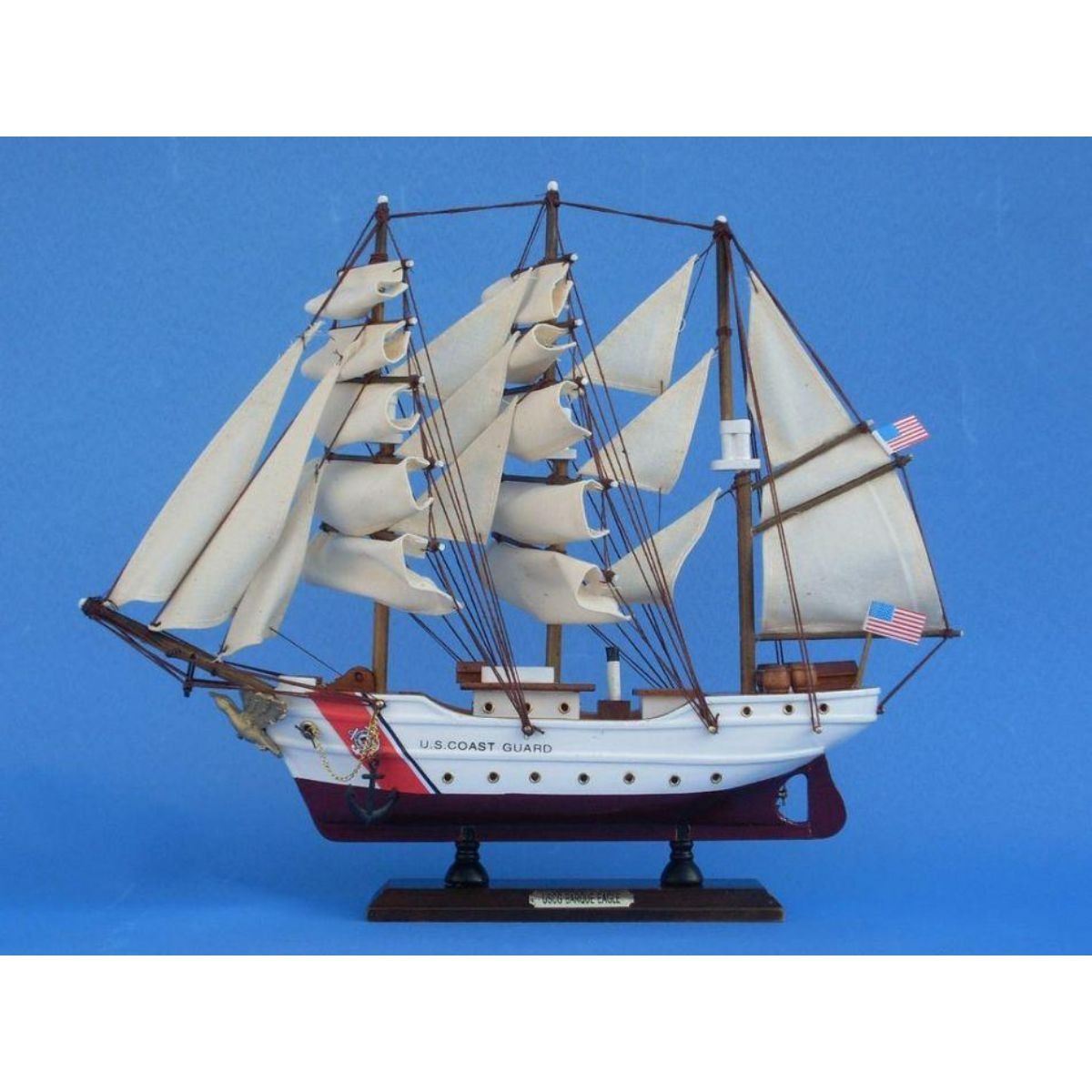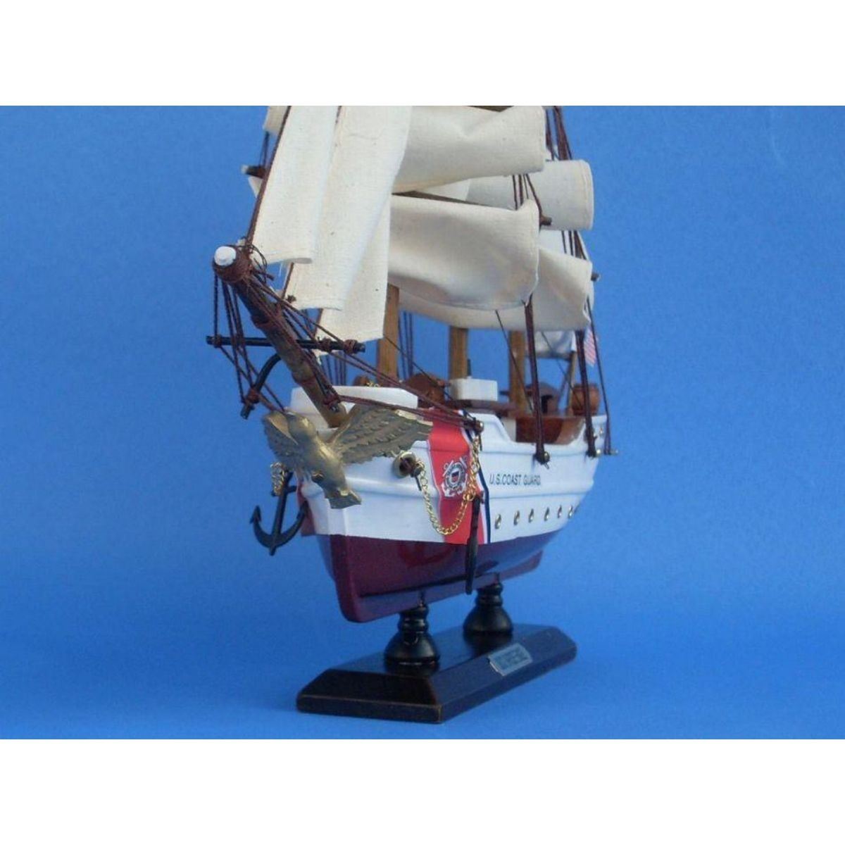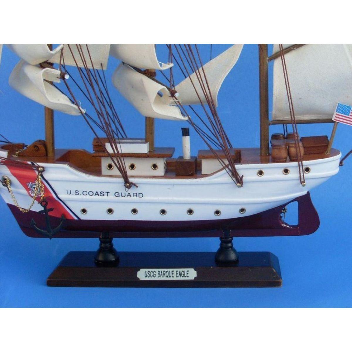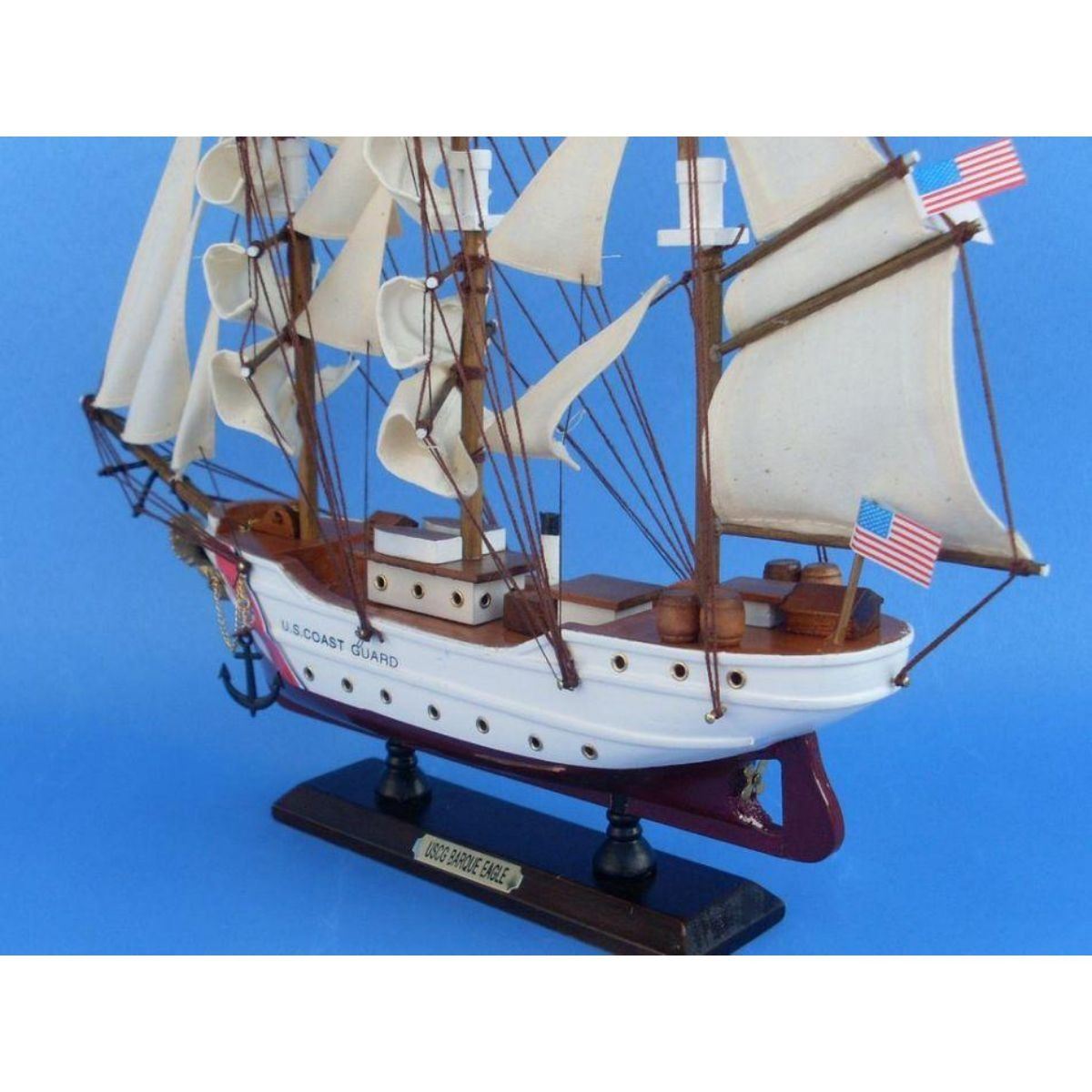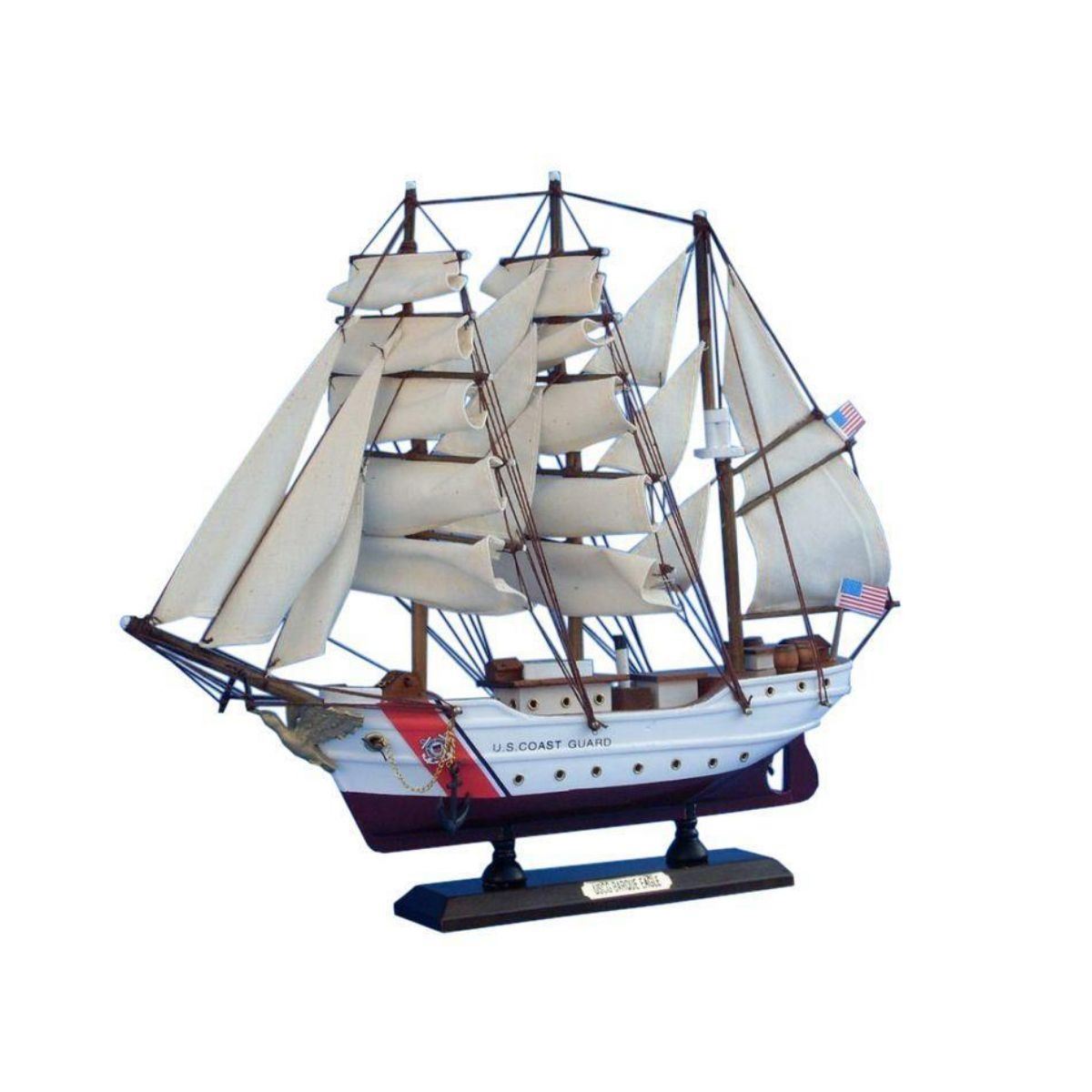 Inspired by the USCG Eagle, one of only two active commissioned sailing ships operating in American military service. Medium sized ship model cutter that fits easily on a shelf or desk. Arrives fully assembled with all sails mounted. Handcrafted wooden hull and masts made with cherry, birch, maple and rosewood. Hand sewn white cloth sails & metal nameplate on wooden base identifies the ship as the USCG Barque Eagle.
