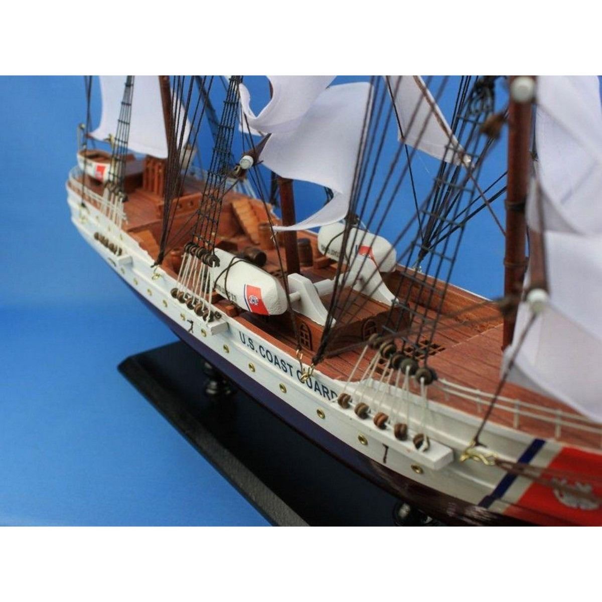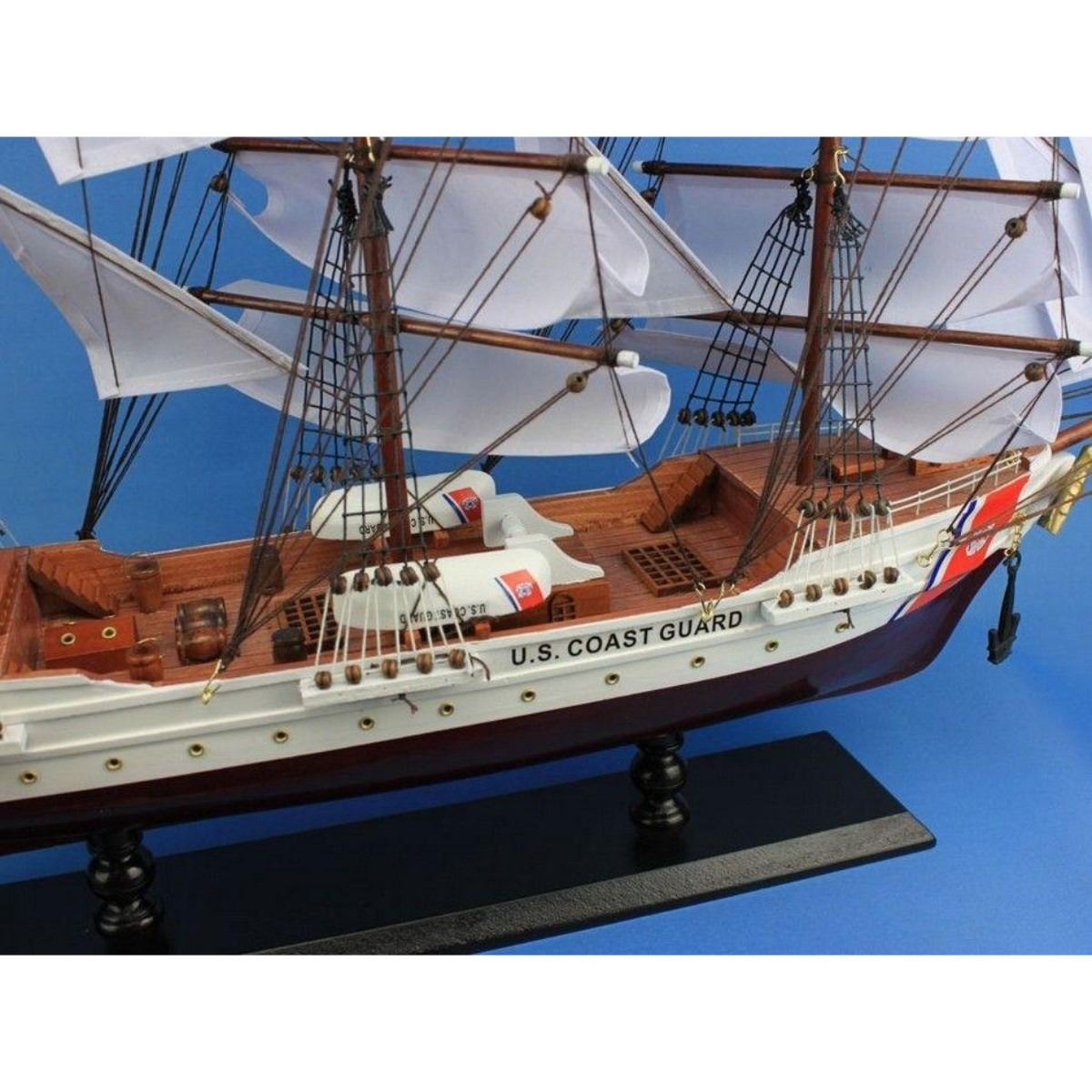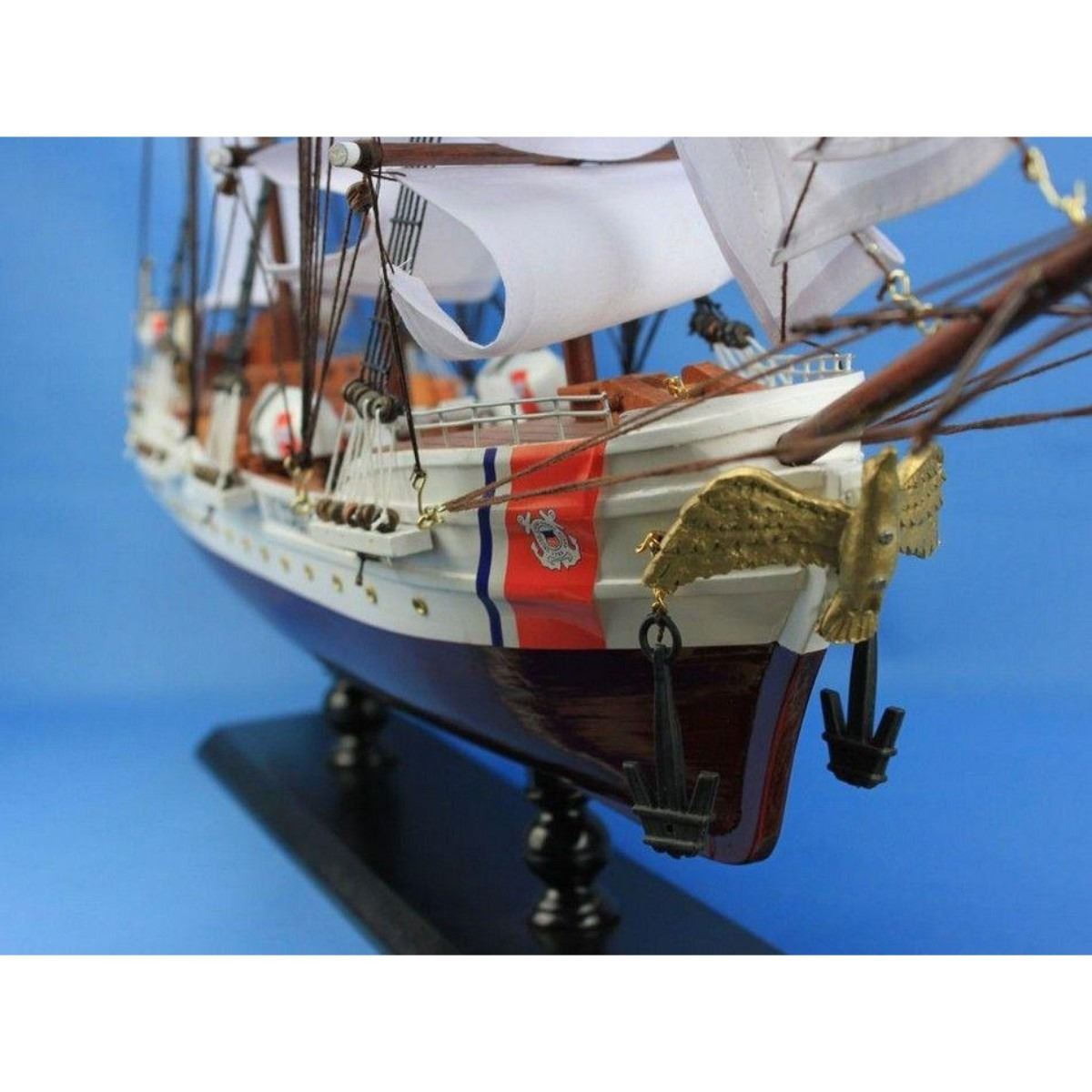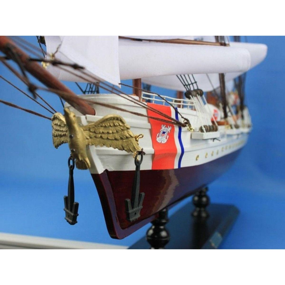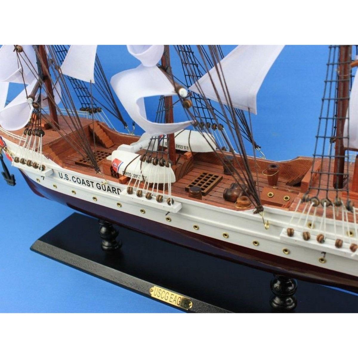 Wooden United States Coast Guard USCG Eagle Model Ship 32" SOLD FULLY ASSEMBLED Ready for Immediate Display - Not a Model Ship kit Built with the finest craftsmanship and attention to detail, this scale replica tall ship model of the USCG Eagle is bedecked with museum-quality features. As one of only two actively commissioned sailing ships operating in the United States Navy, the Eagle occupies a proud and unique place in American nautical and maritime history. Enjoy this exquisitely-crafted tall ship model in your home or office, delight in the remarkable detail and craftsmanship, and feel the patriotic spirit that emanates from this masterfully crafted model ship. Accurate scale tall model ship replica of the real USCG Eagle (1:96 scale) Meticulously handcrafted by our master artisans Classic plank-on-frame construction painstakingly laid with Individual wood planks High quality woods include cherry, birch, maple and rosewood used in build Amazing Details, including: Carved gold eagle figurehead Extraordinary precision used in crafting authentic scale lifeboats tied to deck or hanging from davits Additional deck and hull details, such as painted railings, three helm wheels, capstans, and other deck features 23 masterfully hand-stitched, heavy canvas sails hold shape and do not wrinkle Taut rigging with varied thread gauge and color with dozens of deadeyes 2 American flags displayed prominently from back rigging Model rests firmly on wooden base drilled into bottom of ship hull Extensive research of original plans, historical drawings, paintings, and actual photographs ensure the highest possible accuracy of the USCG Eagle
