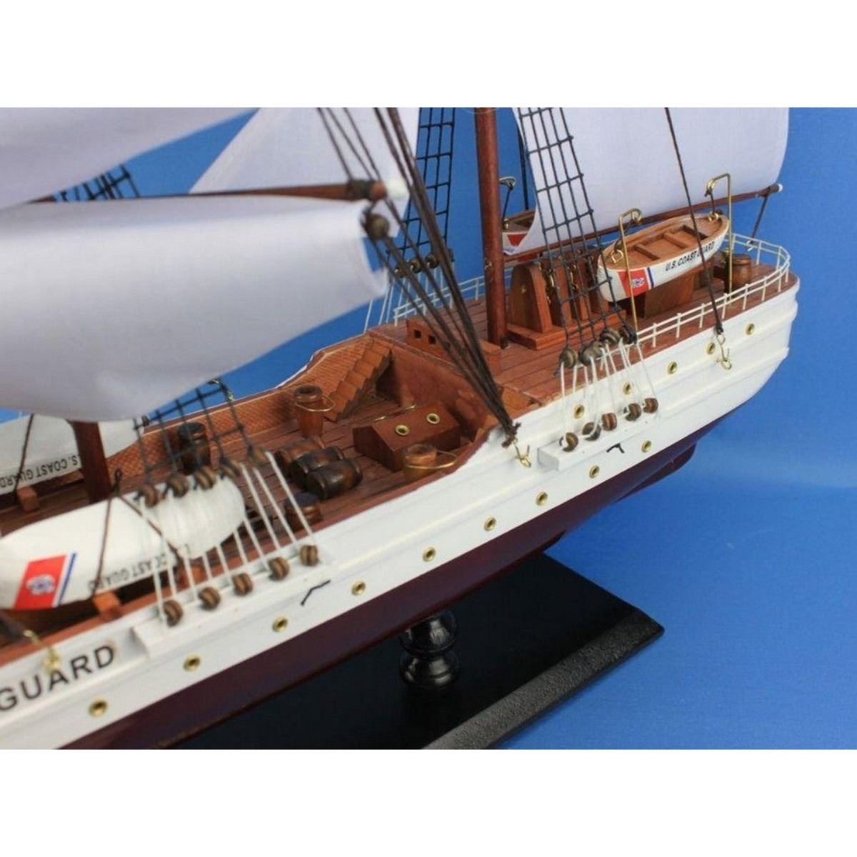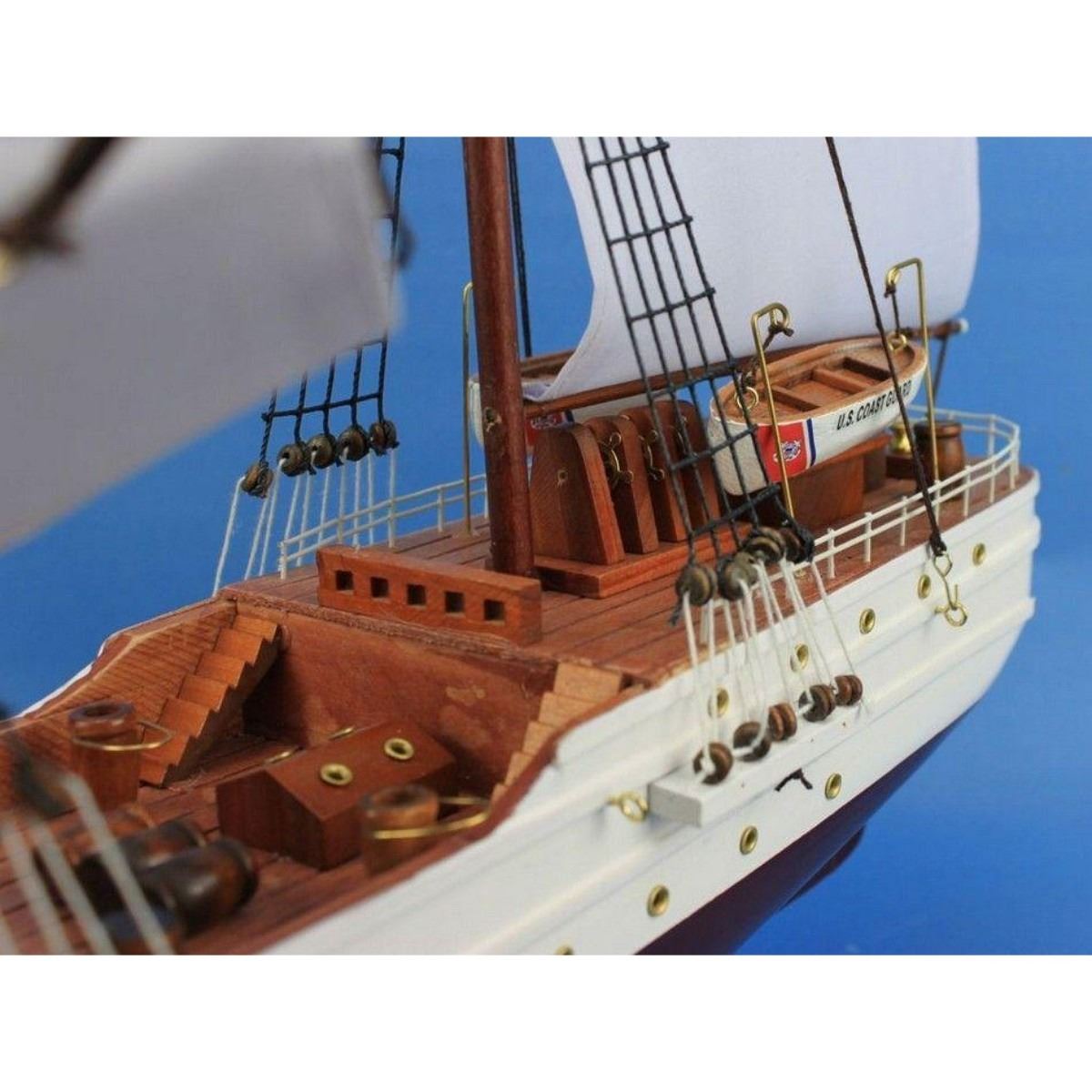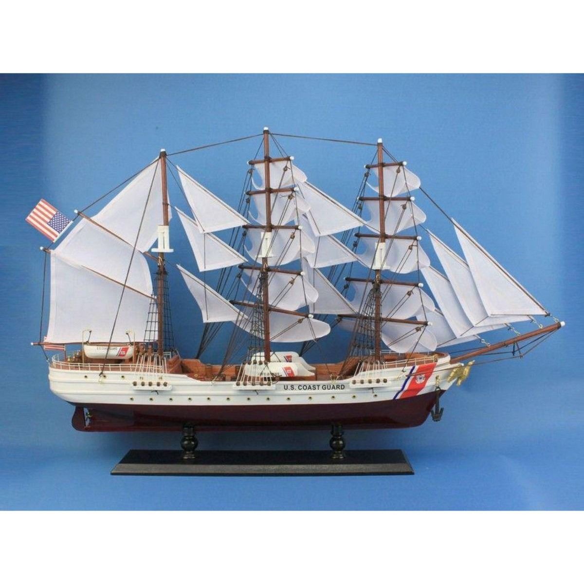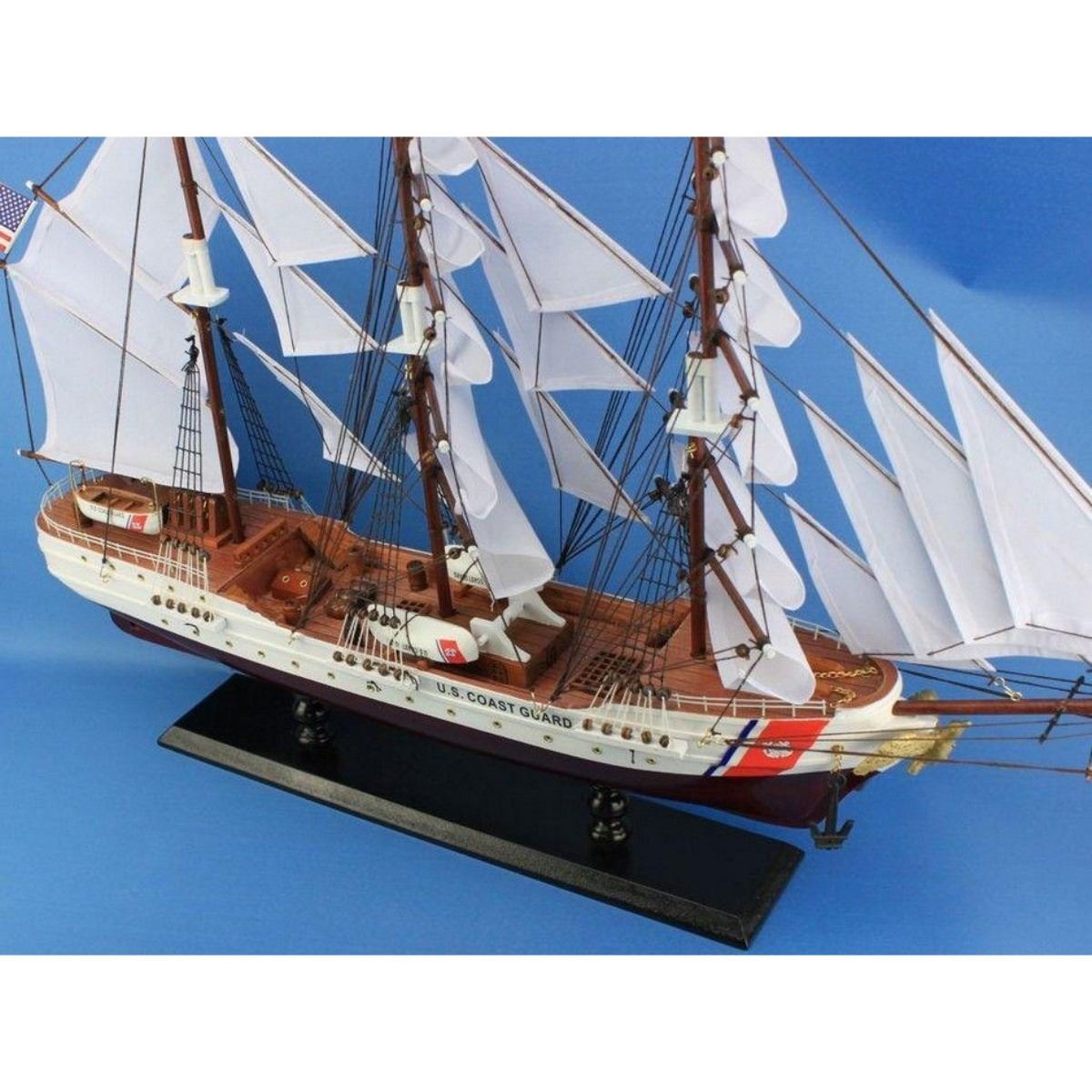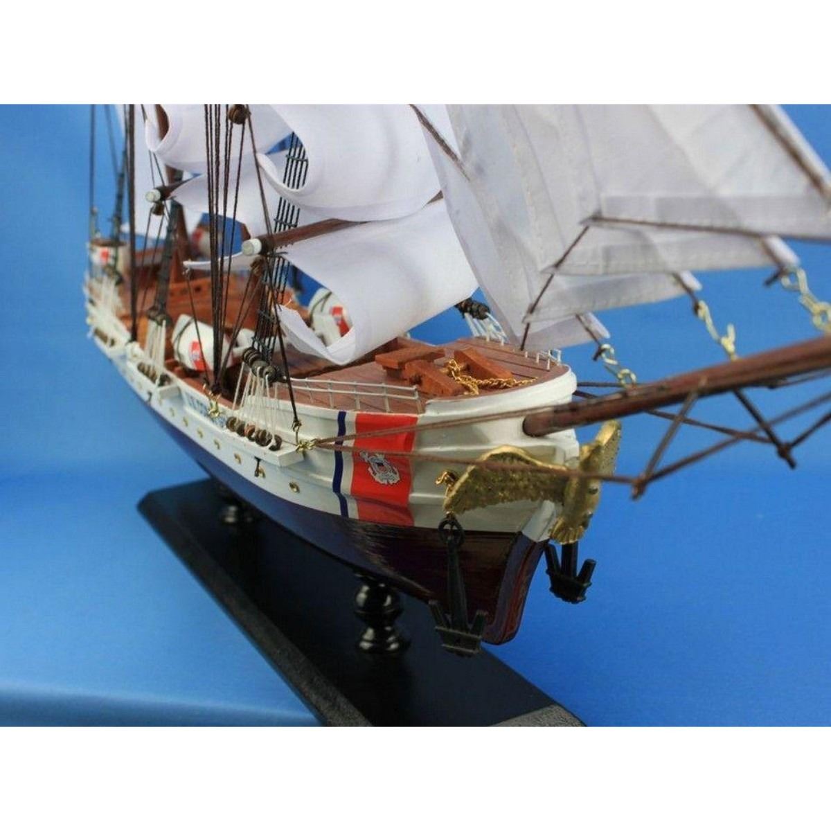 Wooden United States Coast Guard USCG Eagle Model Ship 32" SOLD FULLY ASSEMBLED Ready for Immediate Display - Not a Model Ship kit Built with the finest craftsmanship and attention to detail, this scale replica tall ship model of the USCG Eagle is bedecked with museum-quality features. As one of only two actively commissioned sailing ships operating in the United States Navy, the Eagle occupies a proud and unique place in American nautical and maritime history. Enjoy this exquisitely-crafted tall ship model in your home or office, delight in the remarkable detail and craftsmanship, and feel the patriotic spirit that emanates from this masterfully crafted model ship. Accurate scale tall model ship replica of the real USCG Eagle (1:96 scale) Meticulously handcrafted by our master artisans Classic plank-on-frame construction painstakingly laid with Individual wood planks High quality woods include cherry, birch, maple and rosewood used in build Amazing Details, including: Carved gold eagle figurehead Extraordinary precision used in crafting authentic scale lifeboats tied to deck or hanging from davits Additional deck and hull details, such as painted railings, three helm wheels, capstans, and other deck features 23 masterfully hand-stitched, heavy canvas sails hold shape and do not wrinkle Taut rigging with varied thread gauge and color with dozens of deadeyes 2 American flags displayed prominently from back rigging Model rests firmly on wooden base drilled into bottom of ship hull Extensive research of original plans, historical drawings, paintings, and actual photographs ensure the highest possible accuracy of the USCG Eagle