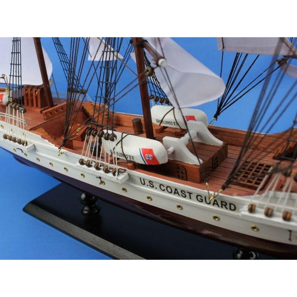 Wooden United States Coast Guard USCG Eagle Model Ship 32" SOLD FULLY ASSEMBLED Ready for Immediate Display - Not a Model Ship kit Built with the finest craftsmanship and attention to detail, this scale replica tall ship model of the USCG Eagle is bedecked with museum-quality features. As one of only two actively commissioned sailing ships operating in the United States Navy, the Eagle occupies a proud and unique place in American nautical and maritime history. Enjoy this exquisitely-crafted tall ship model in your home or office, delight in the remarkable detail and craftsmanship, and feel the patriotic spirit that emanates from this masterfully crafted model ship. Accurate scale tall model ship replica of the real USCG Eagle (1:96 scale) Meticulously handcrafted by our master artisans Classic plank-on-frame construction painstakingly laid with Individual wood planks High quality woods include cherry, birch, maple and rosewood used in build Amazing Details, including: Carved gold eagle figurehead Extraordinary precision used in crafting authentic scale lifeboats tied to deck or hanging from davits Additional deck and hull details, such as painted railings, three helm wheels, capstans, and other deck features 23 masterfully hand-stitched, heavy canvas sails hold shape and do not wrinkle Taut rigging with varied thread gauge and color with dozens of deadeyes 2 American flags displayed prominently from back rigging Model rests firmly on wooden base drilled into bottom of ship hull Extensive research of original plans, historical drawings, paintings, and actual photographs ensure the highest possible accuracy of the USCG Eagle