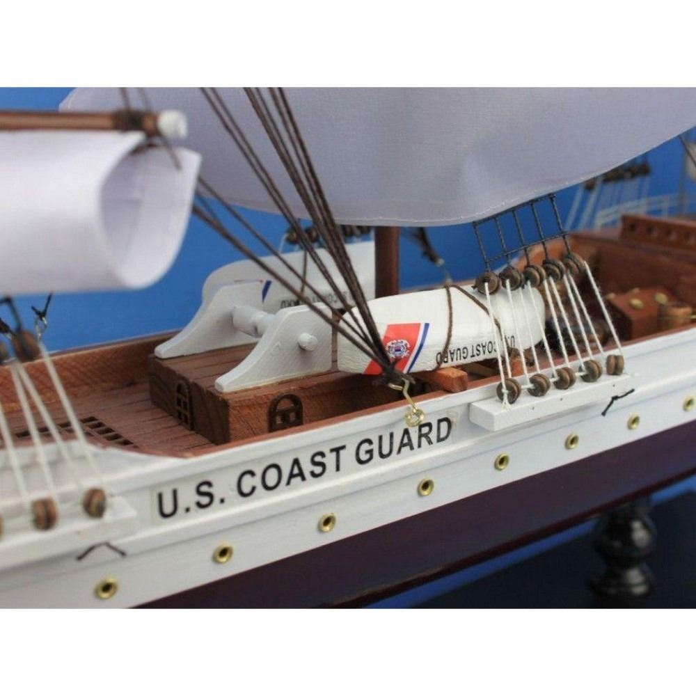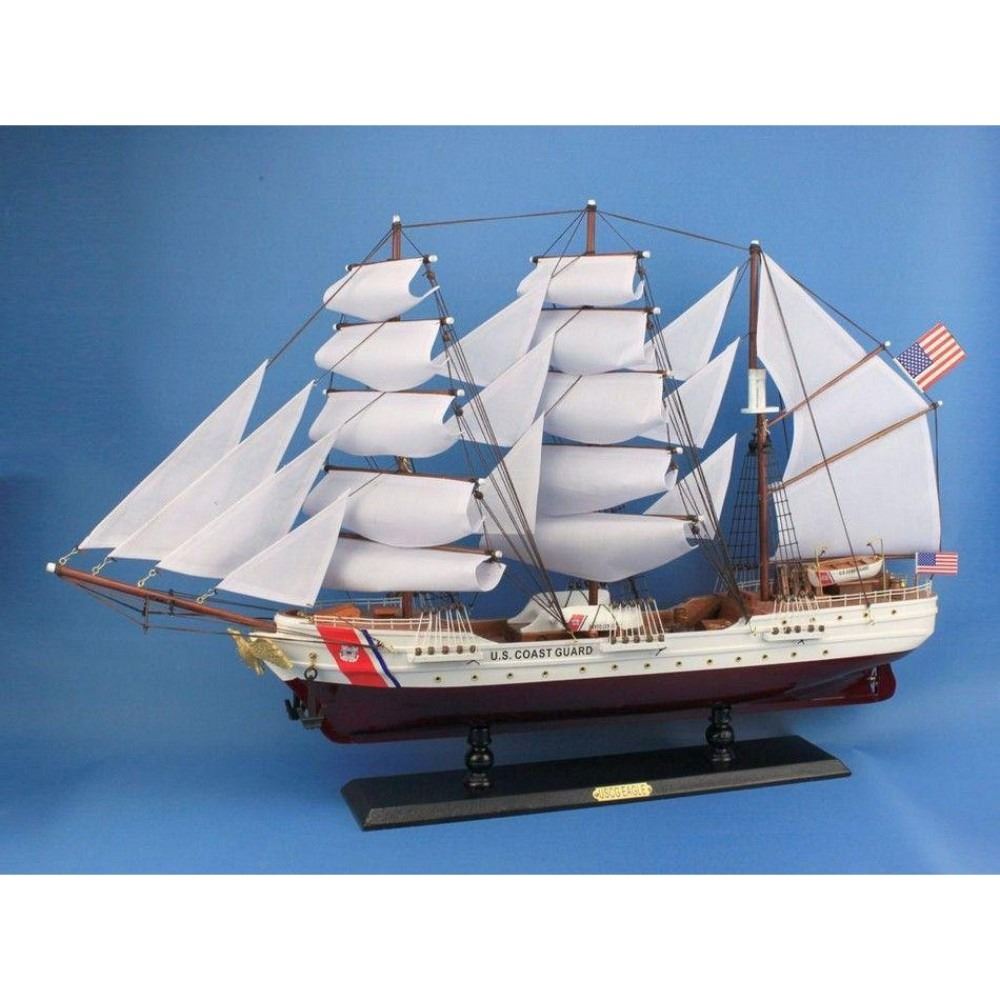 Wooden United States Coast Guard USCG Eagle Model Ship 32" SOLD FULLY ASSEMBLED Ready for Immediate Display - Not a Model Ship kit Built with the finest craftsmanship and attention to detail, this scale replica tall ship model of the USCG Eagle is bedecked with museum-quality features. As one of only two actively commissioned sailing ships operating in the United States Navy, the Eagle occupies a proud and unique place in American nautical and maritime history. Enjoy this exquisitely-crafted tall ship model in your home or office, delight in the remarkable detail and craftsmanship, and feel the patriotic spirit that emanates from this masterfully crafted model ship. Accurate scale tall model ship replica of the real USCG Eagle (1:96 scale) Meticulously handcrafted by our master artisans Classic plank-on-frame construction painstakingly laid with Individual wood planks High quality woods include cherry, birch, maple and rosewood used in build Amazing Details, including: Carved gold eagle figurehead Extraordinary precision used in crafting authentic scale lifeboats tied to deck or hanging from davits Additional deck and hull details, such as painted railings, three helm wheels, capstans, and other deck features 23 masterfully hand-stitched, heavy canvas sails hold shape and do not wrinkle Taut rigging with varied thread gauge and color with dozens of deadeyes 2 American flags displayed prominently from back rigging Model rests firmly on wooden base drilled into bottom of ship hull Extensive research of original plans, historical drawings, paintings, and actual photographs ensure the highest possible accuracy of the USCG Eagle