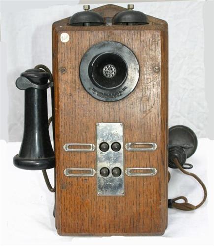 Wooden wall phone by Conn. Tel, & Elec. Co., Inc., Meriden, Conn. Has four push buttons and nameplate holders on front of box. Measures approximately 3 ½" x 7" x 12 ½" H.
