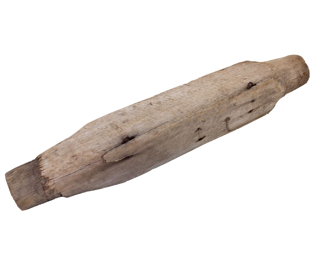 c1900-20 - This is a 29” long piece of hollowed wood. Generally square in shape (measuring 17” around), it is narrowed and rounded on either end to a diameter of 3.25.” Four metal staples have been pounded into the wood along one surface, presumably to serve as hooks for holding the pipe in place. Wooden water pipes are by no means unknown in the American West and in some locales they are still in use.