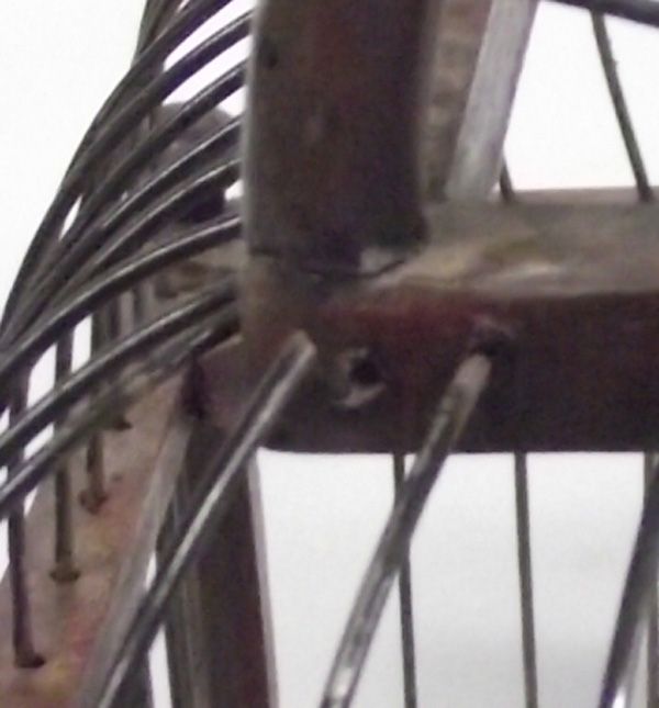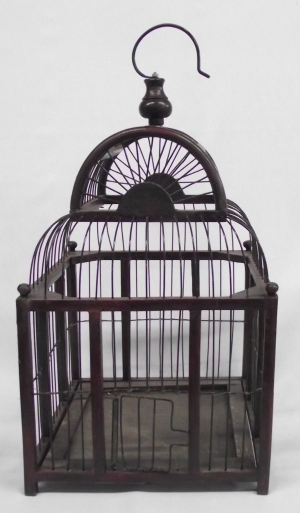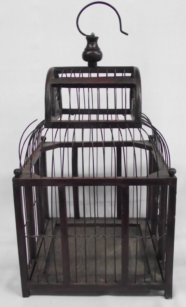 Wooden and Metal Wire Bird Cage. Age and origin unknown. Bottom is on hinges for placing things inside or for cleaning. 20.5''H x 10.5''Square. Some wires have worked loose near the top, but can be repaired. Spring trap door on side. Top hook for hanging.