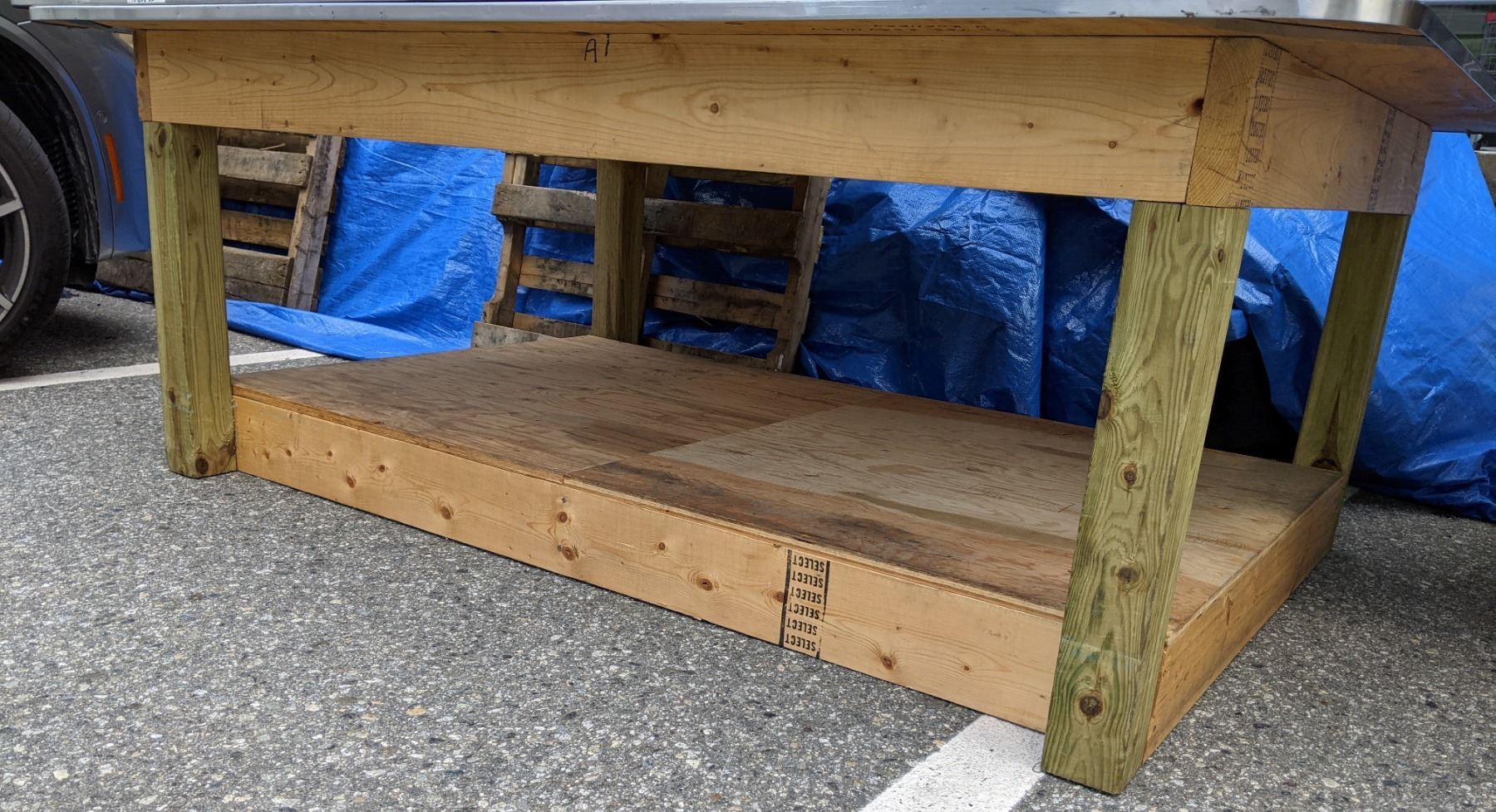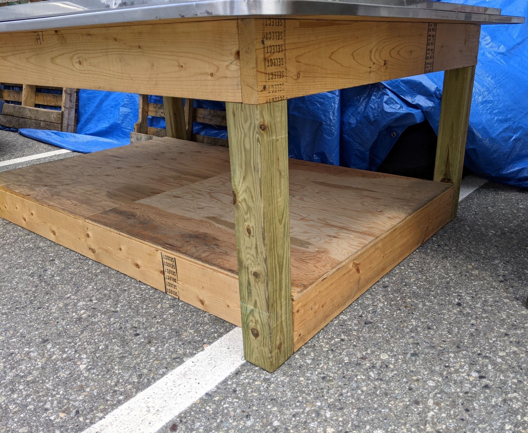Wooden base table w/ approx 6 1/2 ft by 5ft stainless steel top from the popular sci-fi tv series