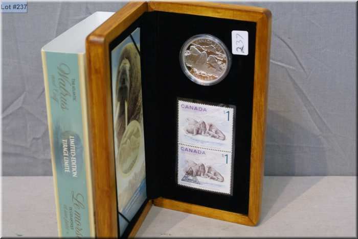 Wooden boxed 2005 Canadian Walrus and Calf 99.99% fine silver $5 coin and stamp set