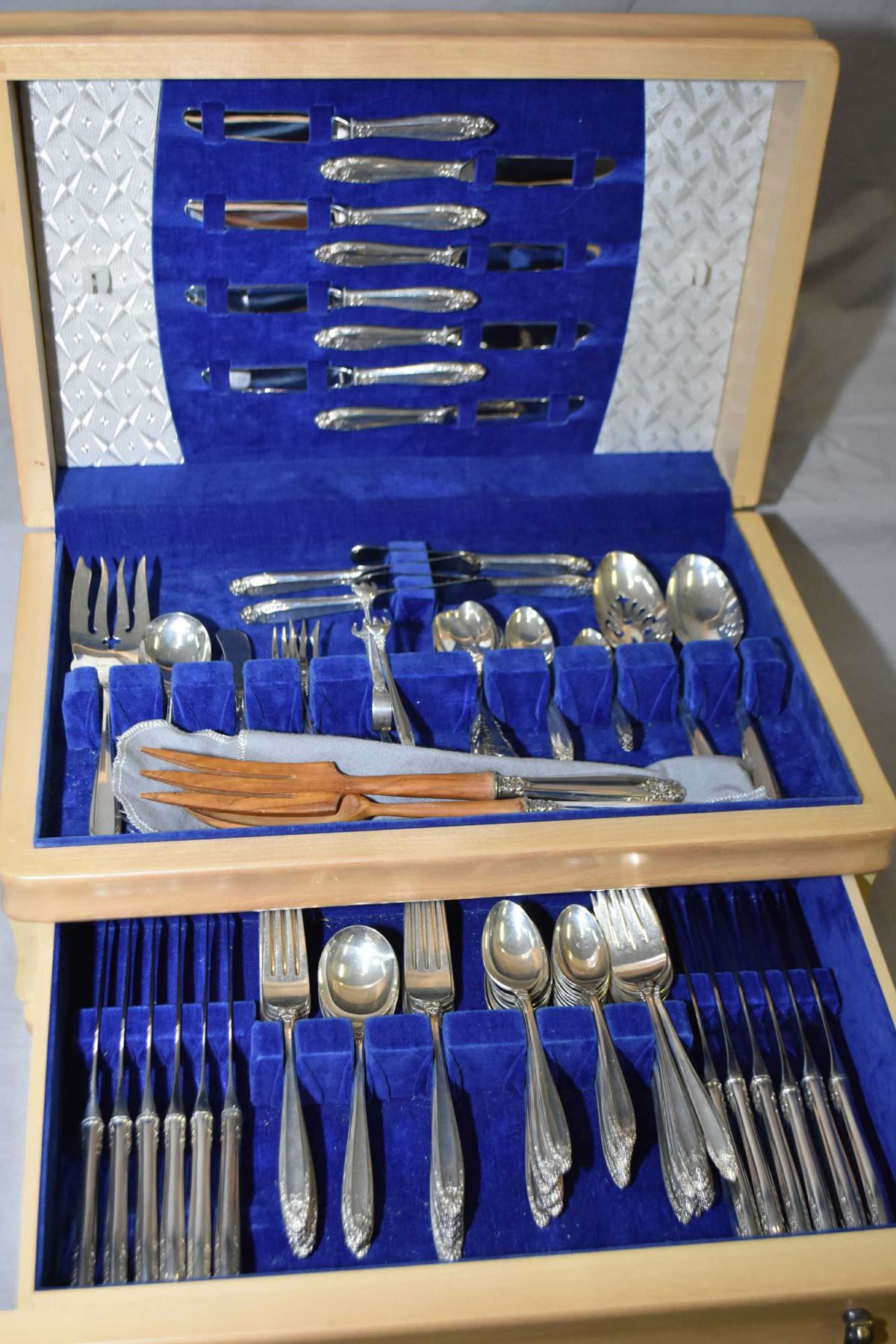 Wooden canteen of International Prelude sterling flatware including twelve each of dinner knives, dinner forks, salad forks, twelve spreaders (two varieties) eleven teaspoons, six soup spoons, fifteen coffee spoons plus salad servers, three serving pieces and approximately nine smaller pieces including berry spoons, pickle forks etc.